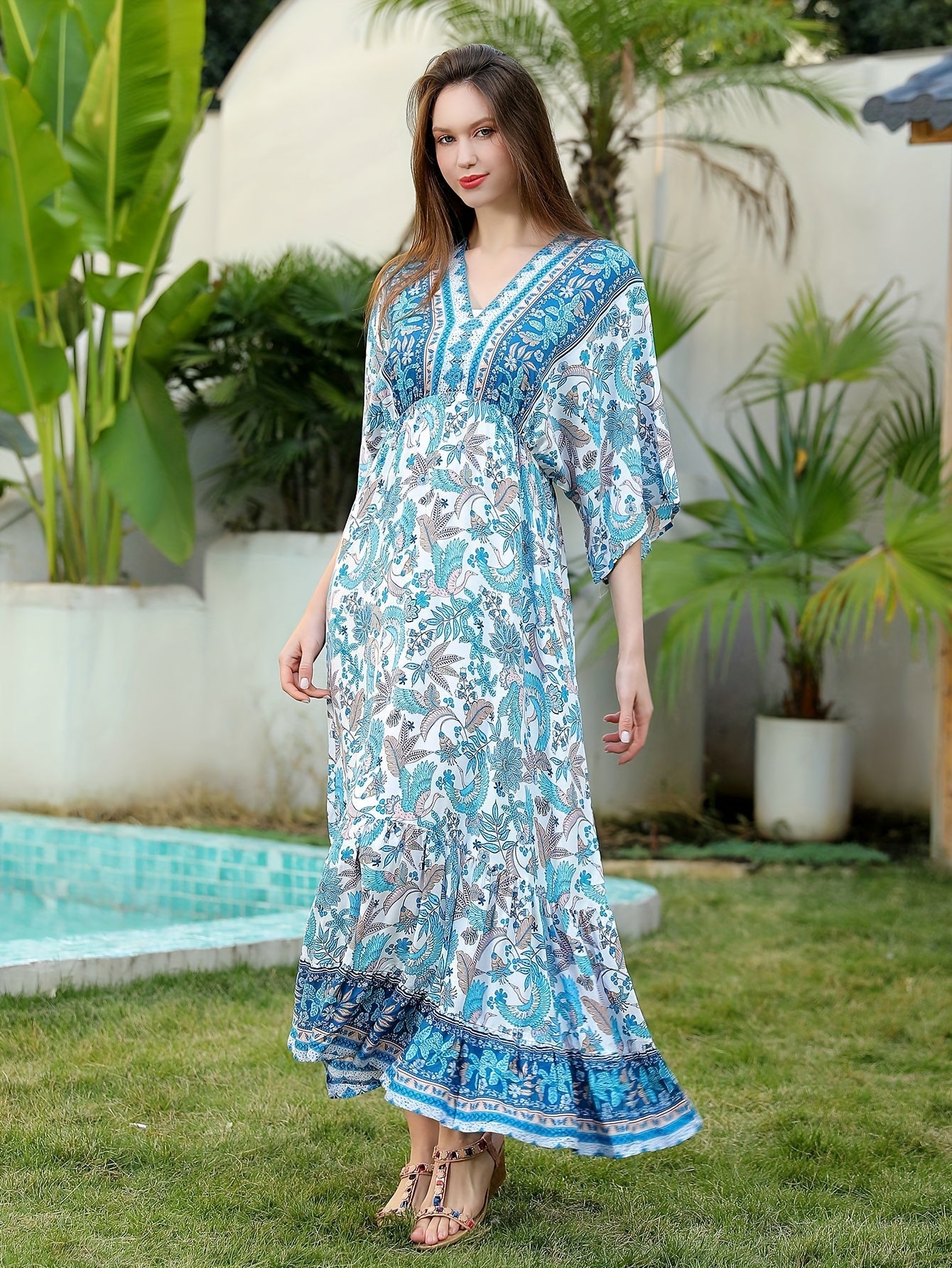 Plus o'lchamli ayollar uchun maxi plyaj kiyimlari etnik uslubda bosma ro'yxat kiyimi