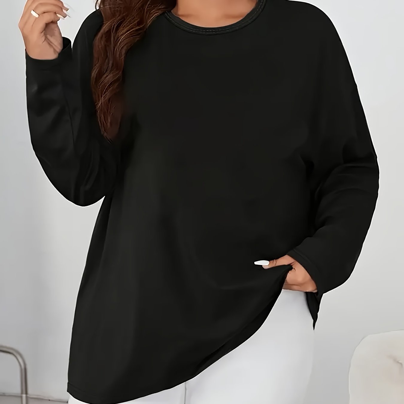 Plus o'lchamli ayollar uchun keng ko'ylakli uzun qo'lli T-shirt qora kundalik ko'ylak