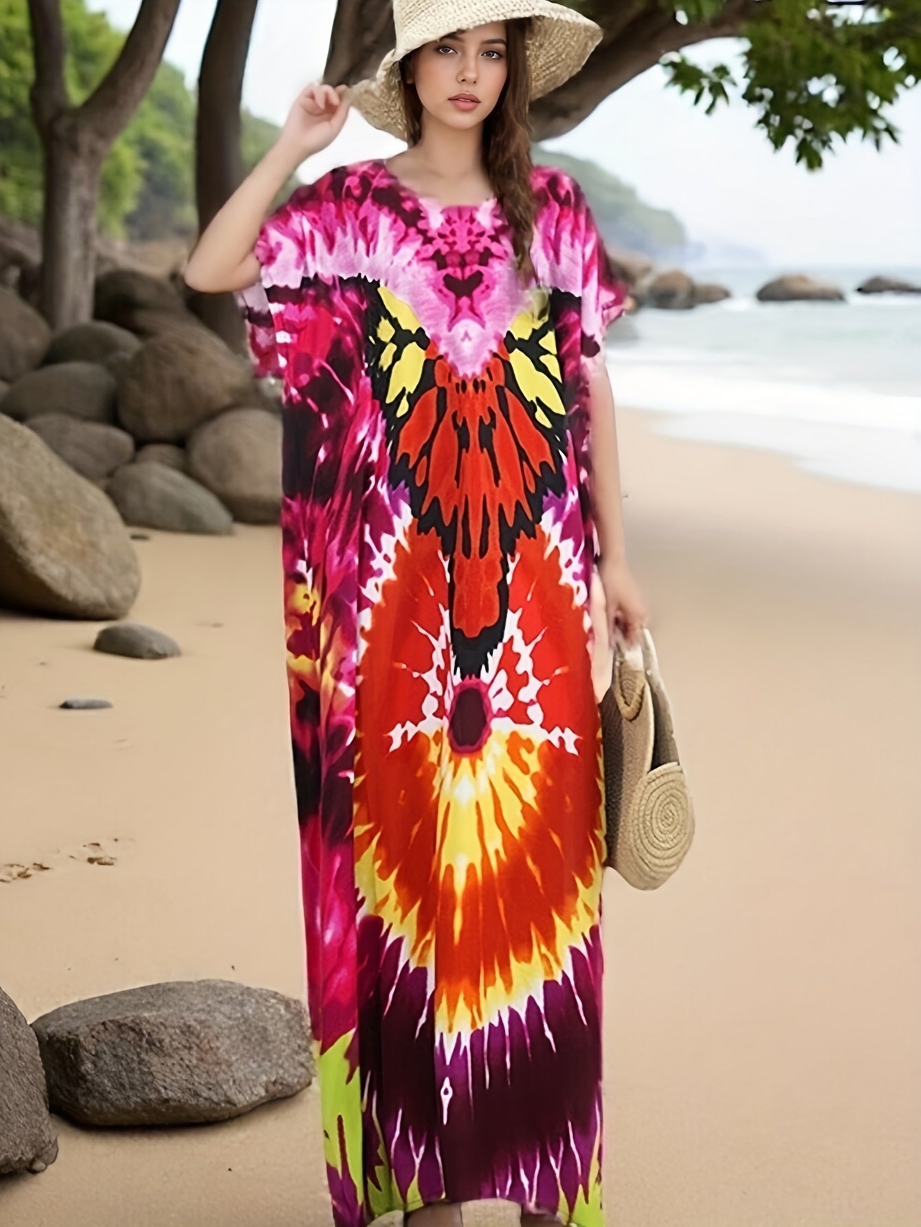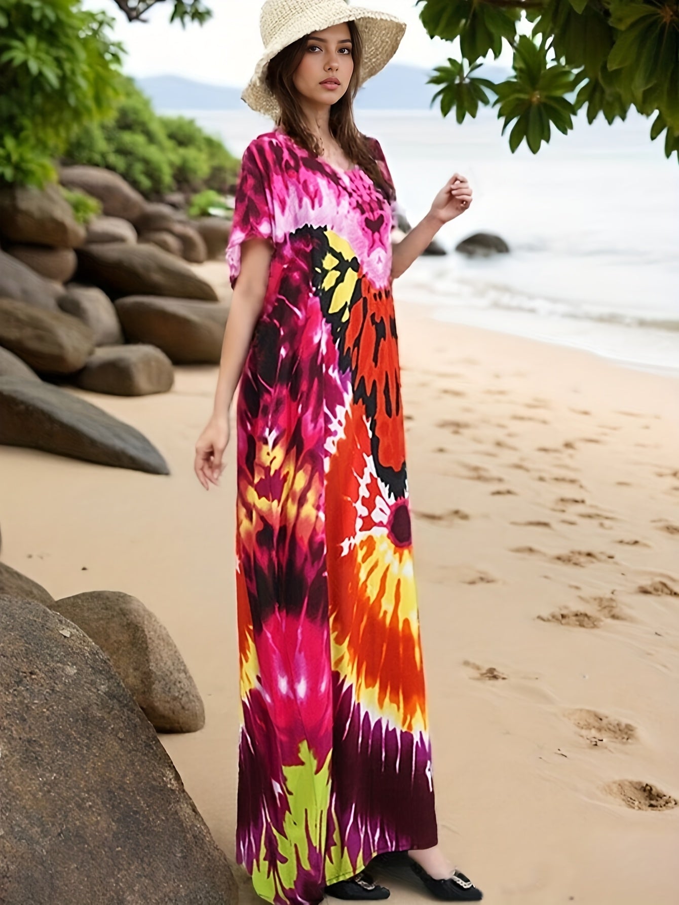 Plus o'lcham ayollar uchun tie-dye plyaj kiyimlari uzun tunik va gul naqshlari