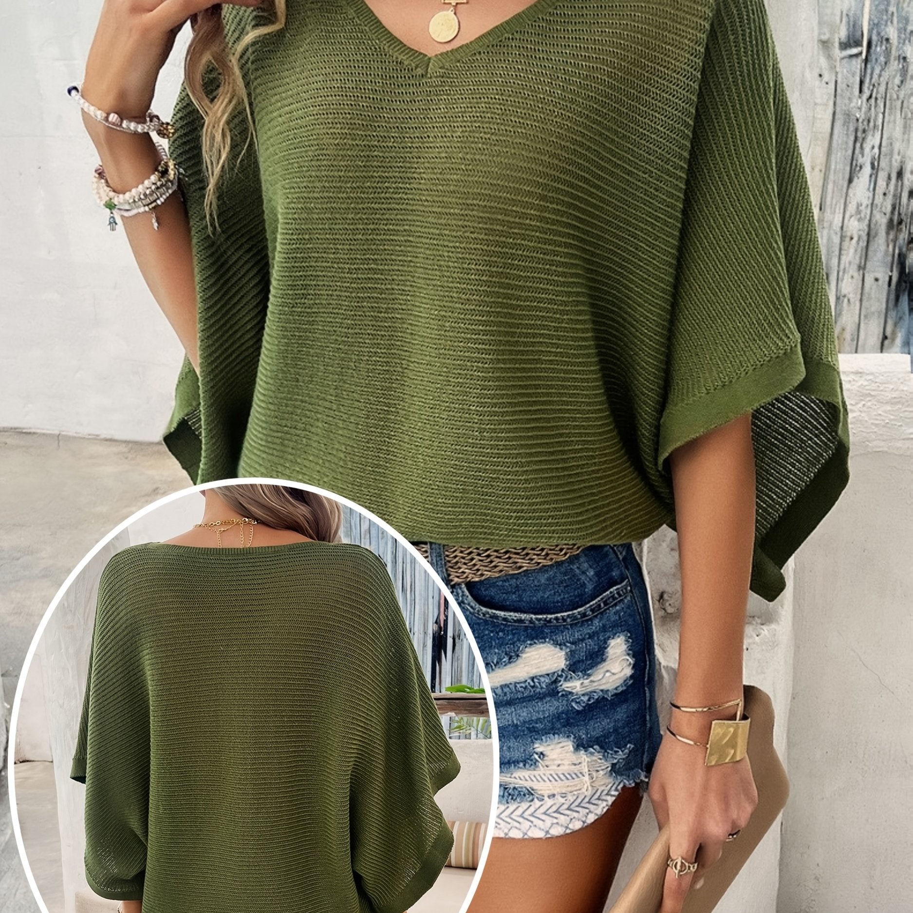 Plus o'lcham ayollar uchun yengil batwing yengli V-shakli bo'yinli ko'ylak, kundalik yozgi ofis kiyimi