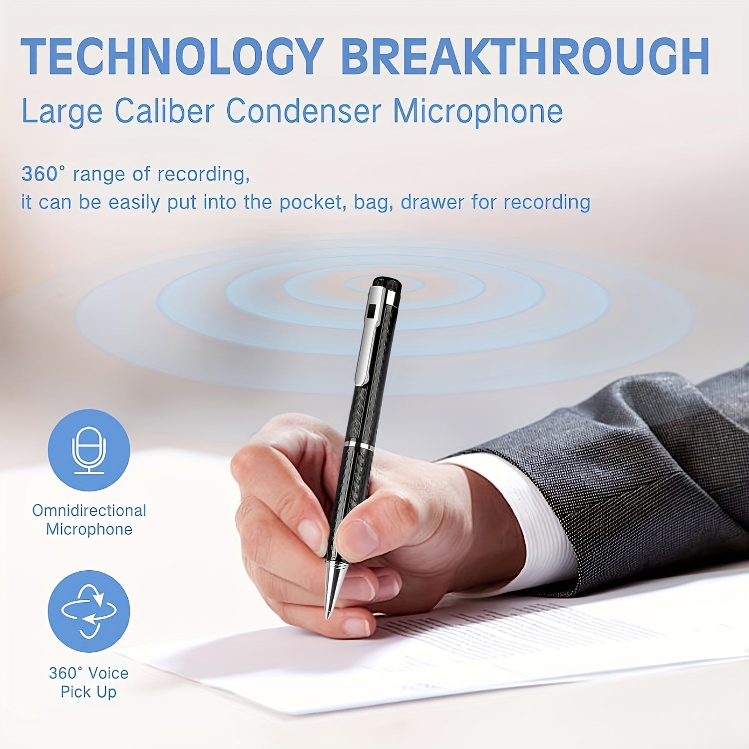 360° kondensator mikrofonli, qayta zaryadlanadigan batareyali, omnidireksional qabul qiluvchi, USB/batareya ikki quvvat rejimiga ega portativ raqamli ovoz yozuvchi qalam.
