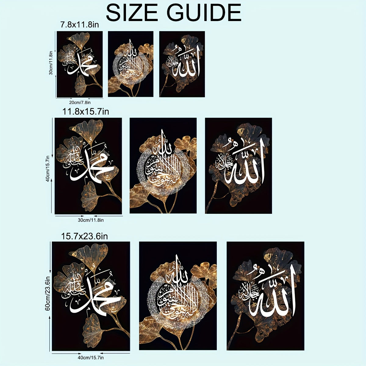 Qora fon ustida oltin barglar va o'rik bargi marmar dizayni bilan islomiy kaligrafiyani aks ettiruvchi poster kanvas rasm, yashash xonasi dekoratsiyasi uchun mos. Ramkasiz.