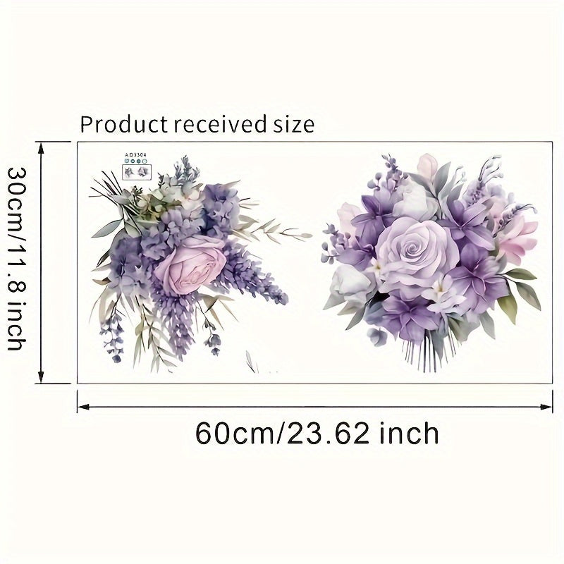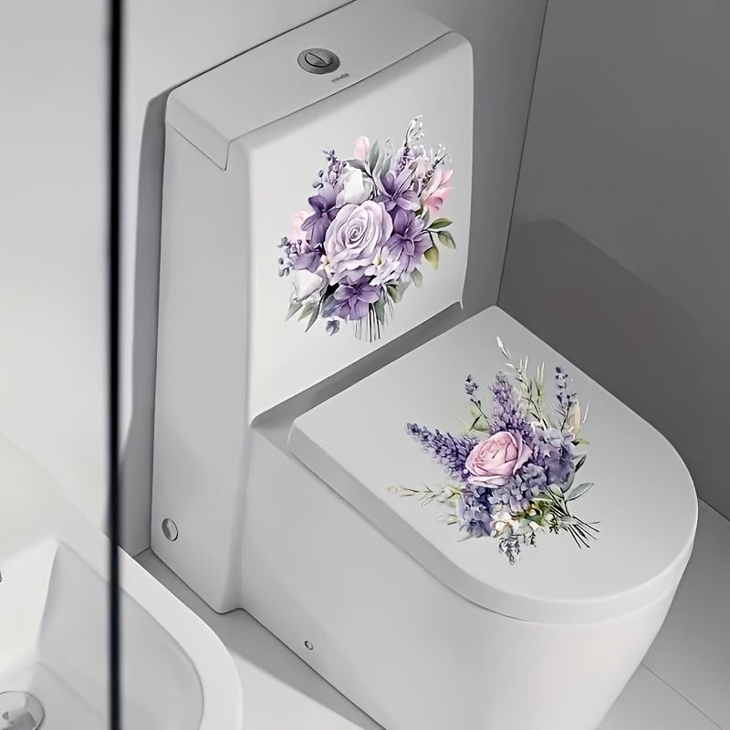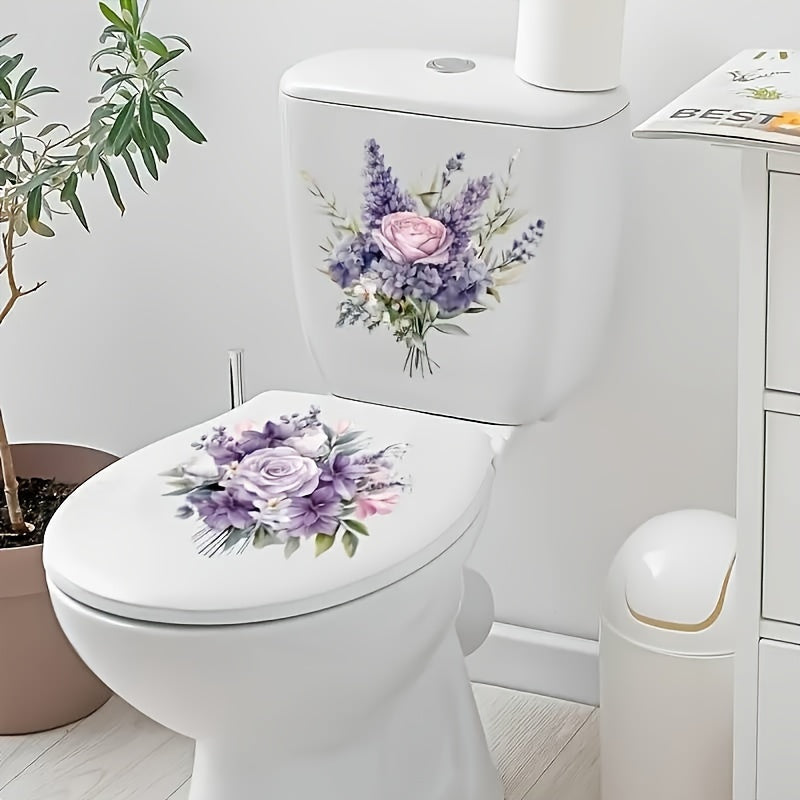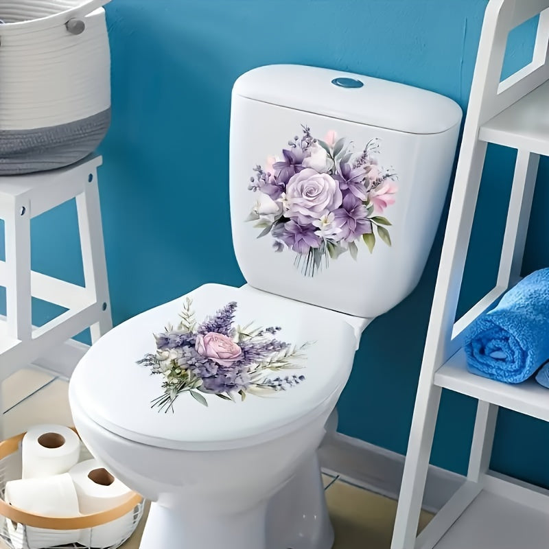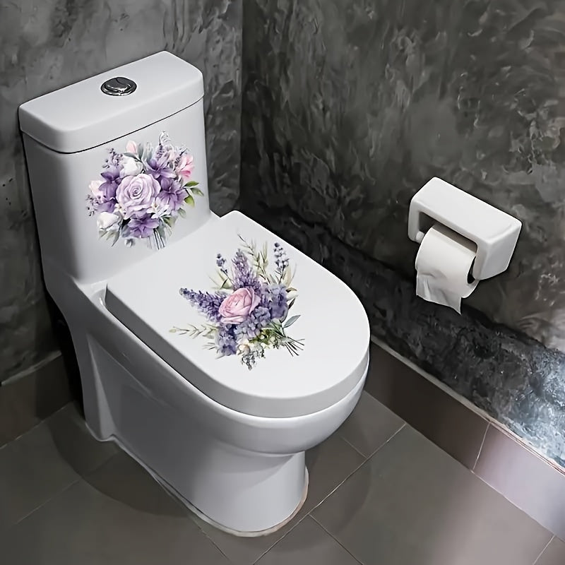 Uy dekoratsiyasi uchun binafsha gullar va barglar bilan bezatilgan hammom dekalar, suv o'tkazmaydigan hojatxona qopqog'i stikerlari.