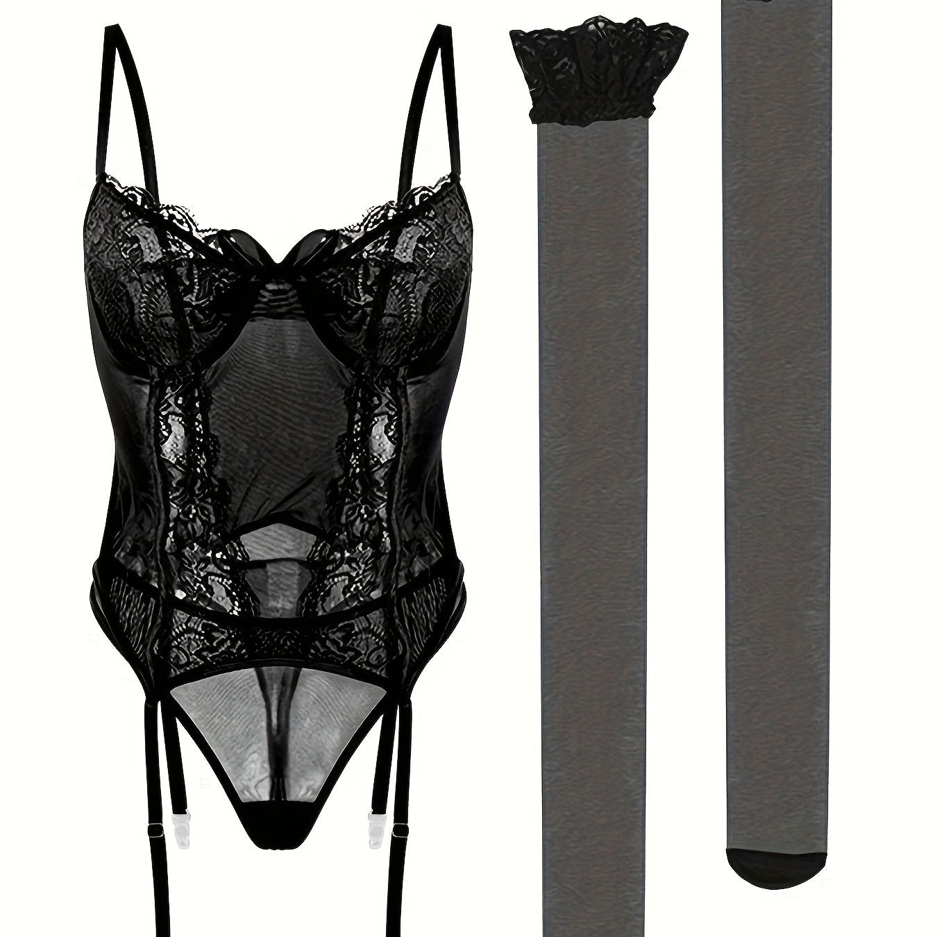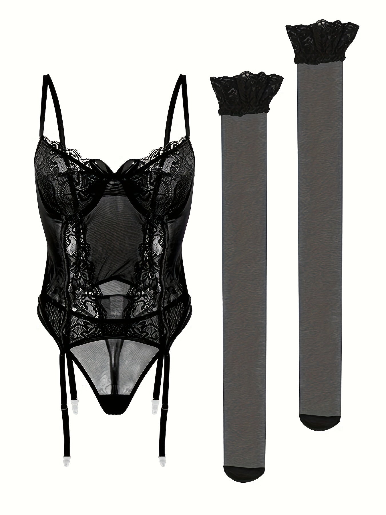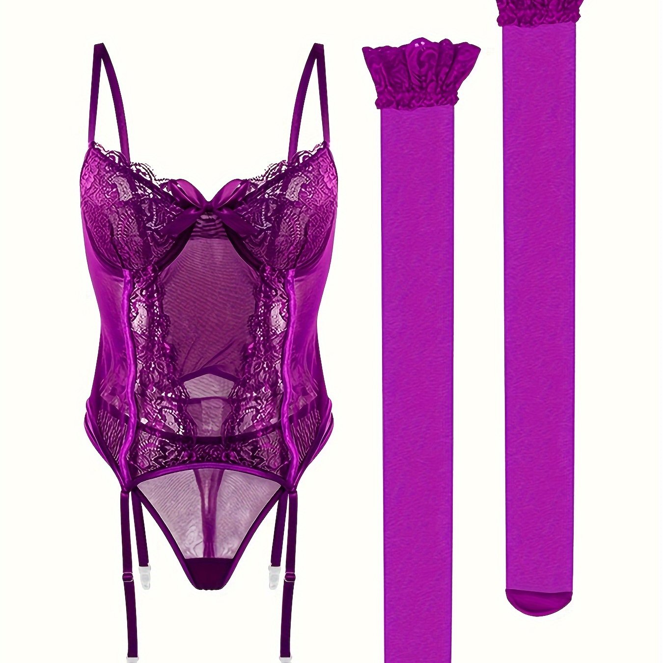 Binafsha ipli ichki kiyim to'plami: gullar bilan bezatilgan shaffof to'rli yuqori bel pantyhoselarni o'z ichiga oladi. Bayramga tayyor, jozibali ichki kiyim, katta o'lchamlarda.