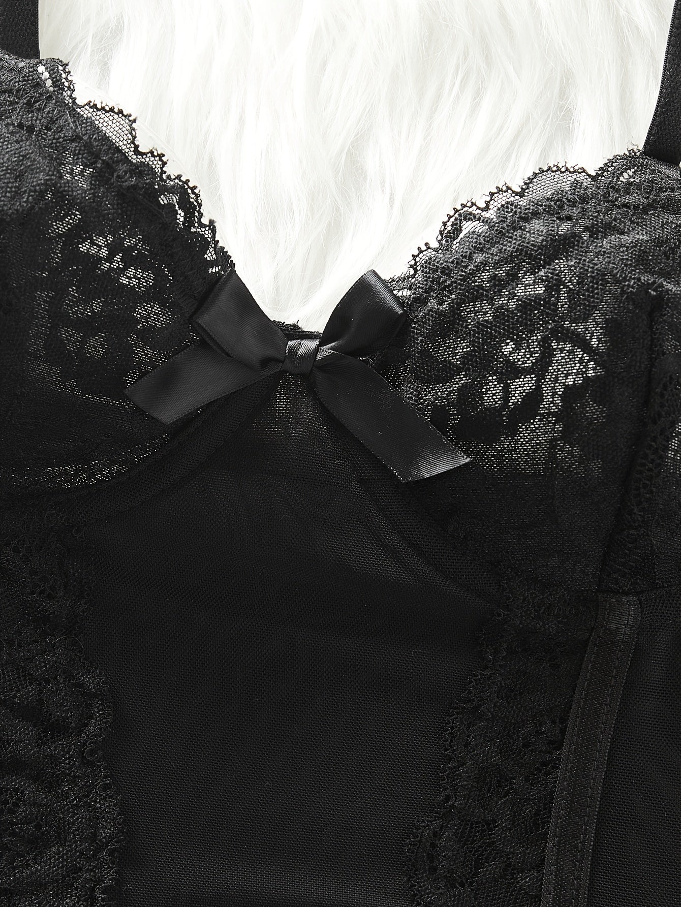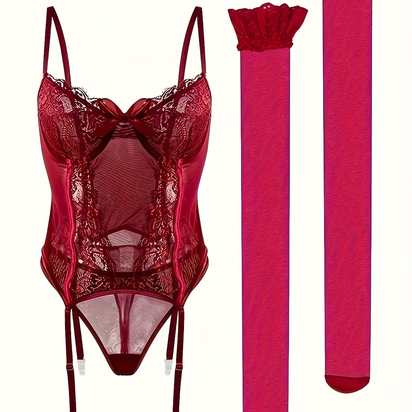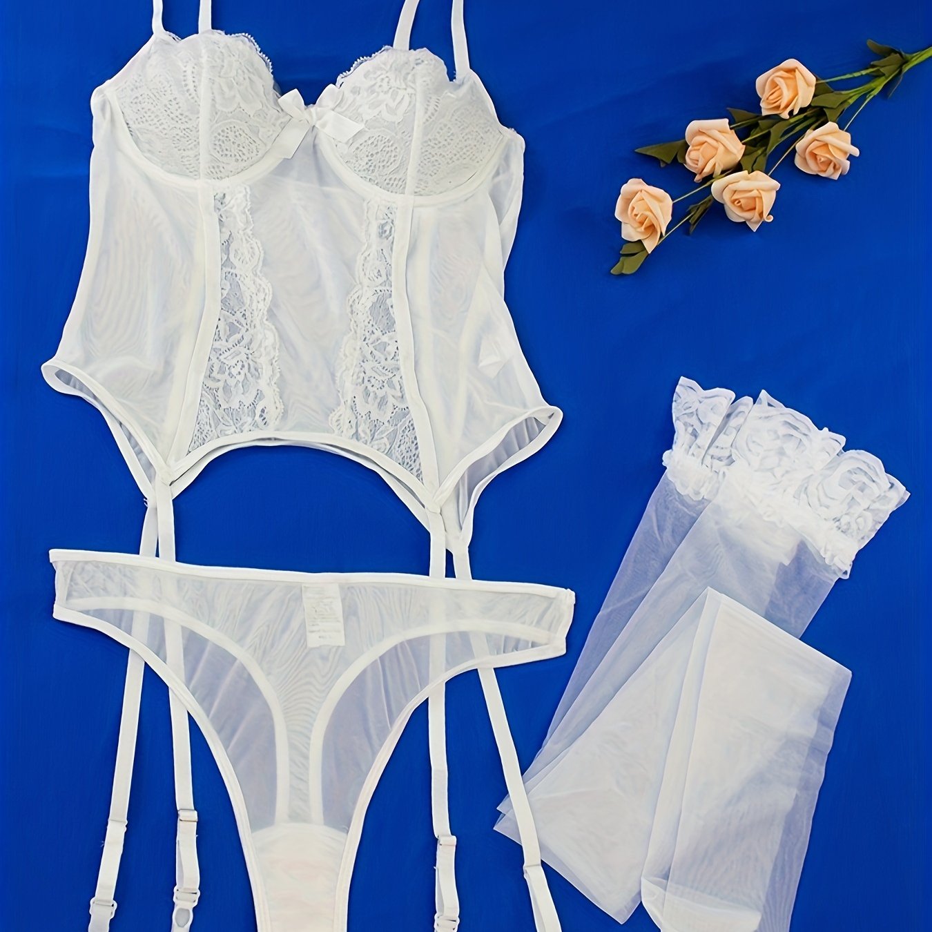Binafsha ipli ichki kiyim to'plami: gullar bilan bezatilgan shaffof to'rli yuqori bel pantyhoselarni o'z ichiga oladi. Bayramga tayyor, jozibali ichki kiyim, katta o'lchamlarda.