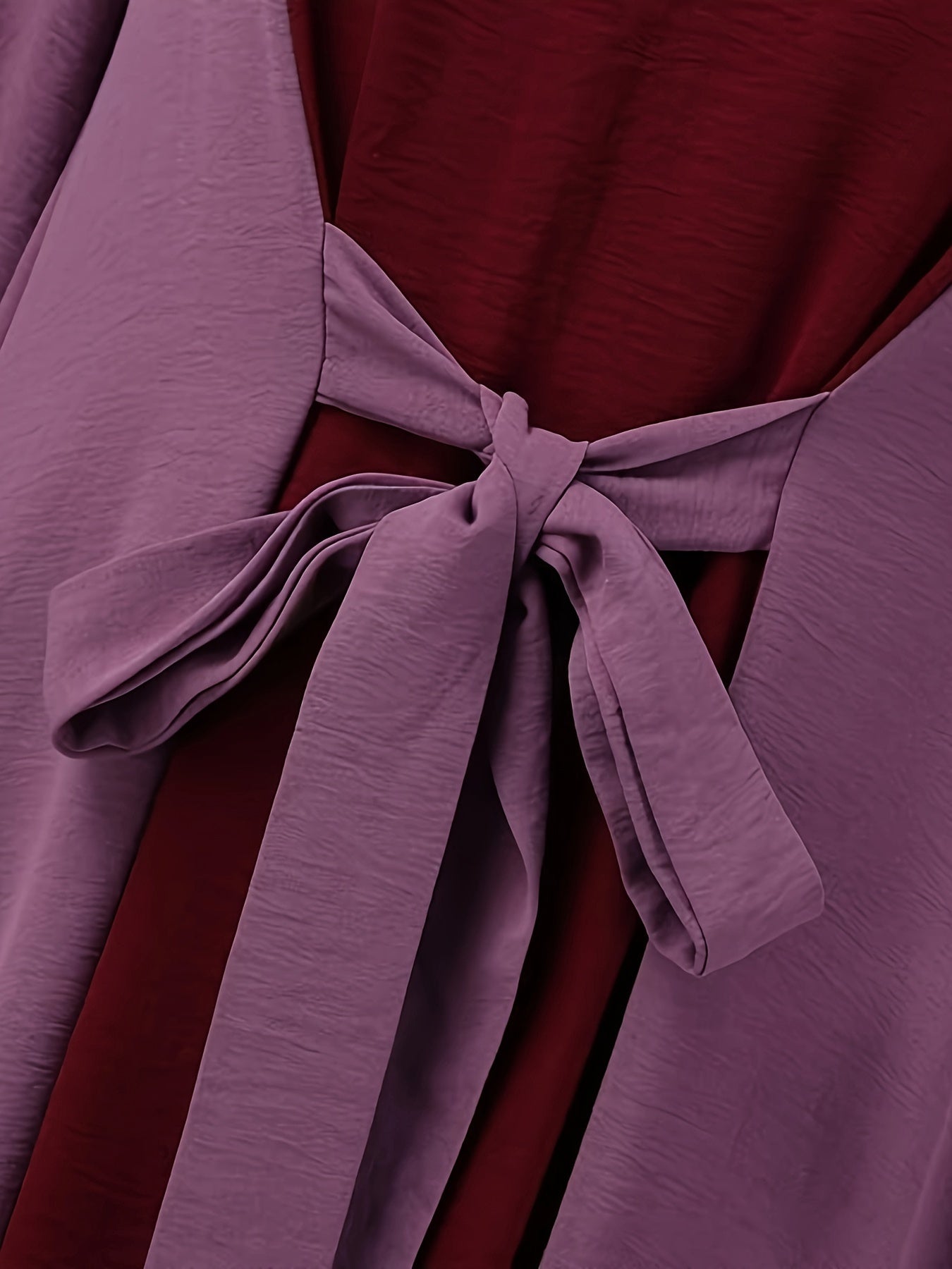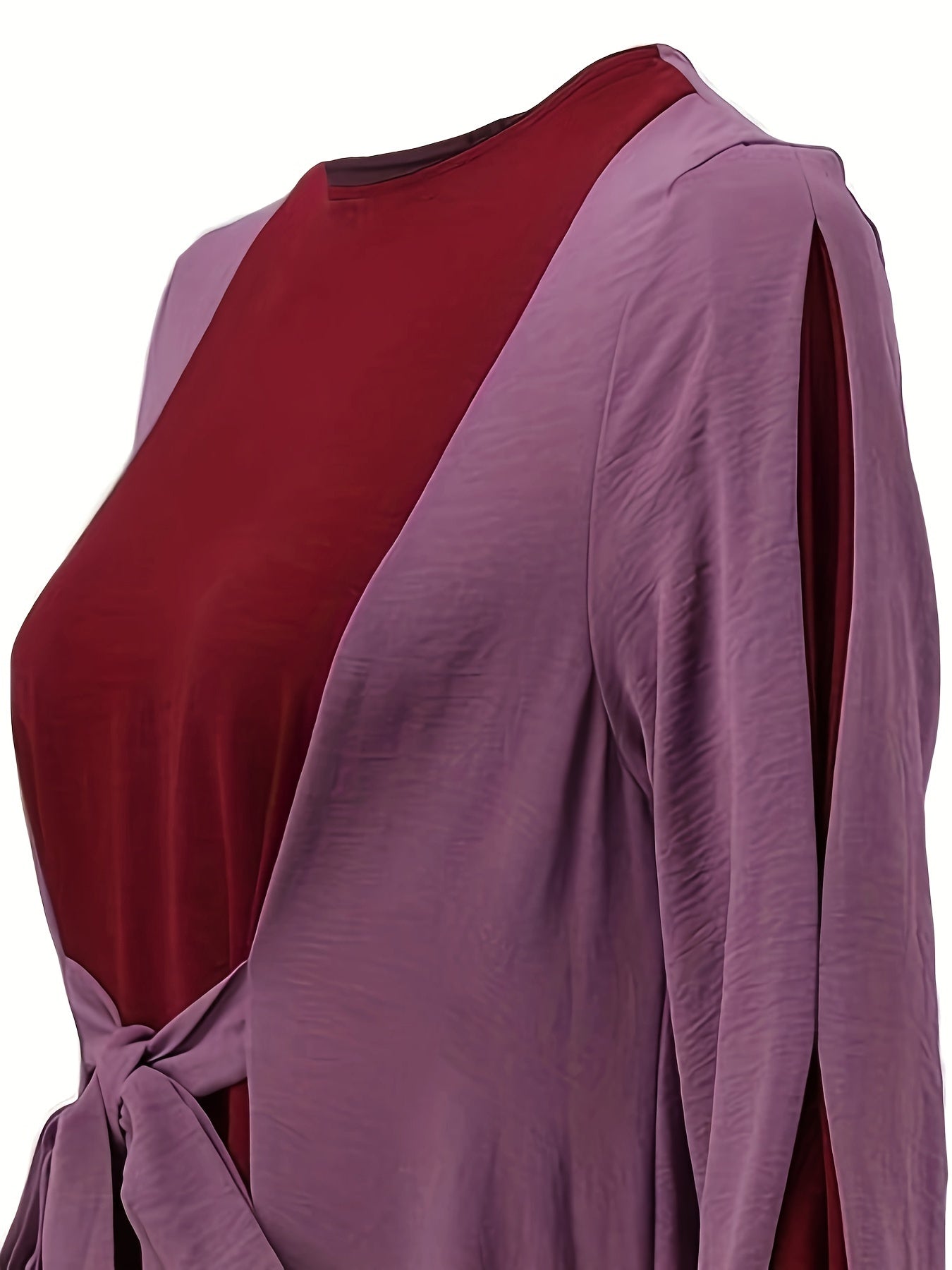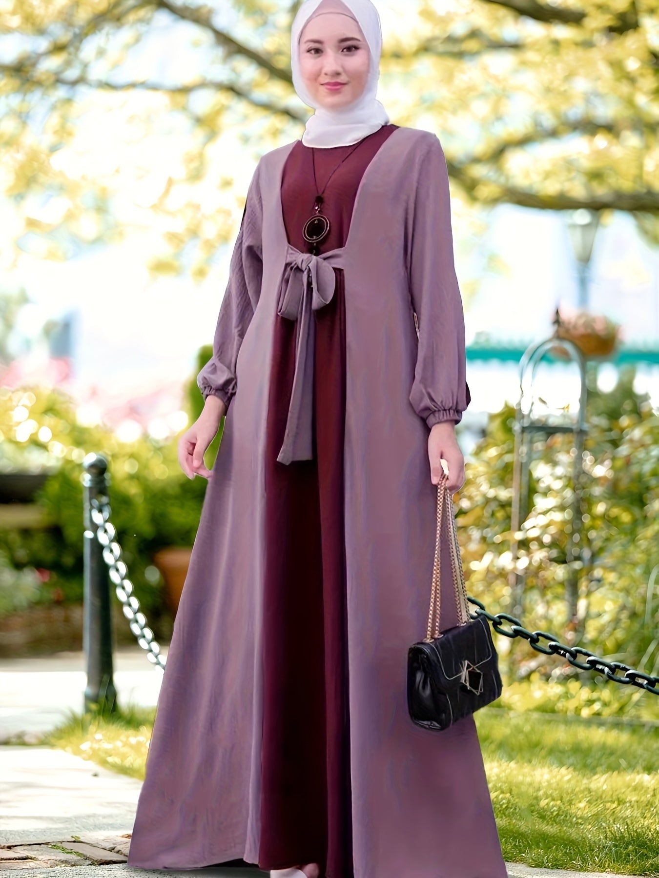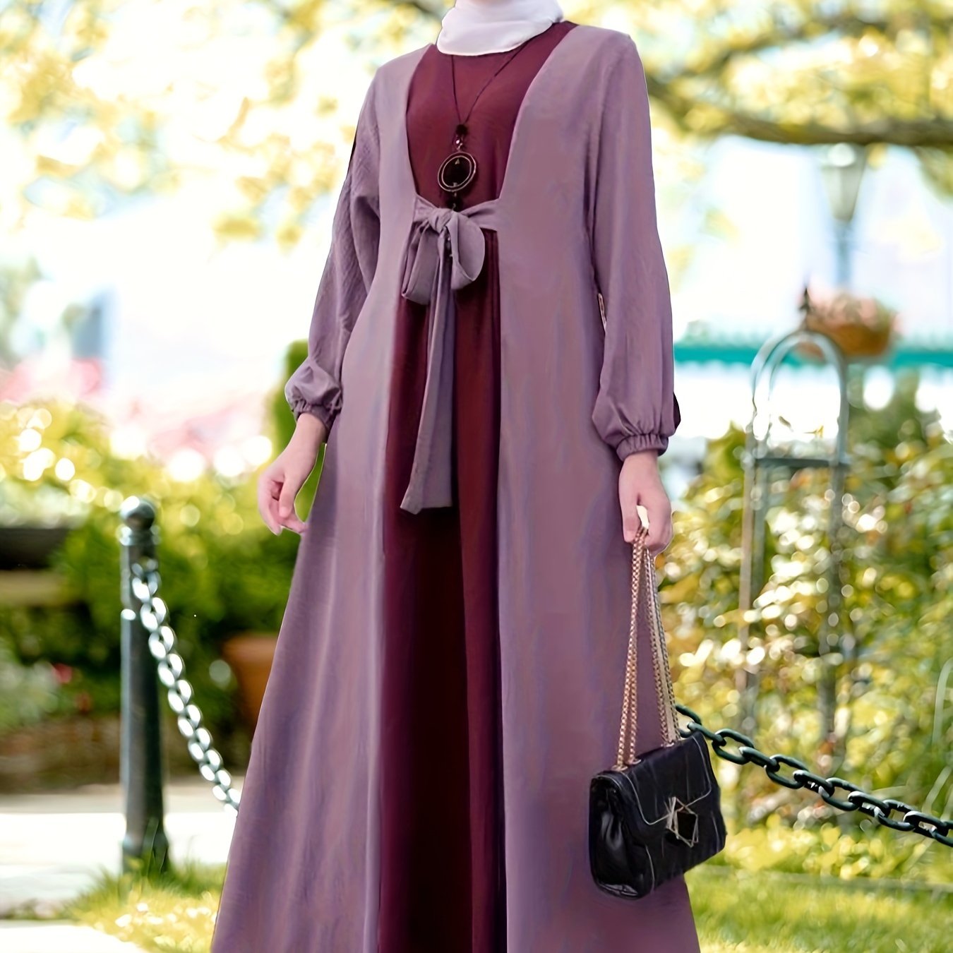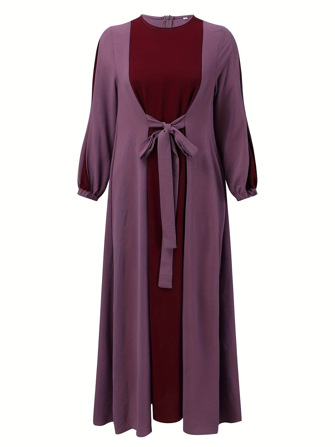 Ramazon ilhomlangan uzun ko'ylak, rangli kontrastli bel bog'ichi bilan, tashriflar uchun mukammal.