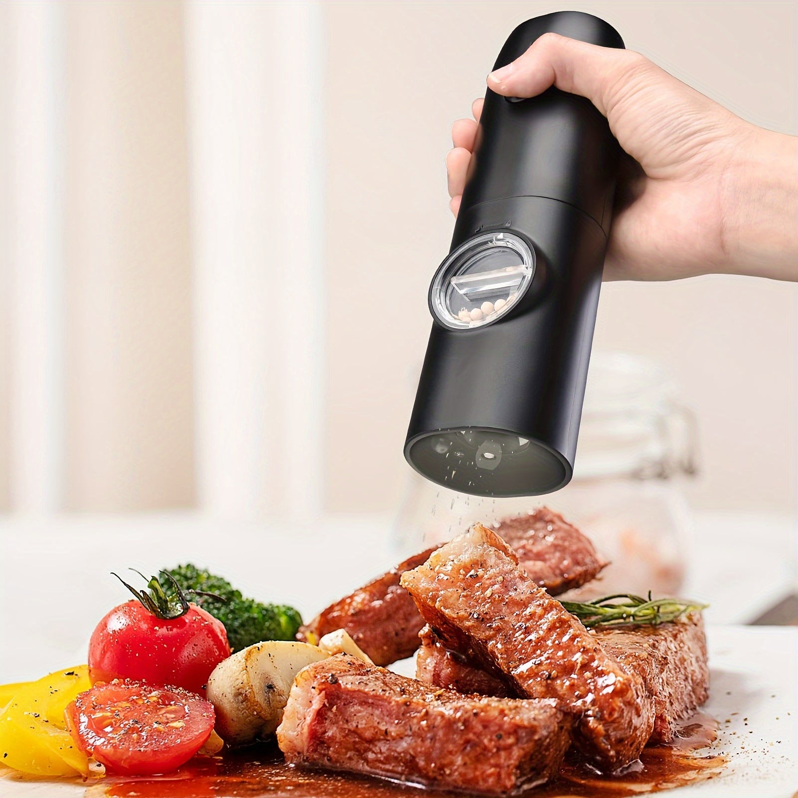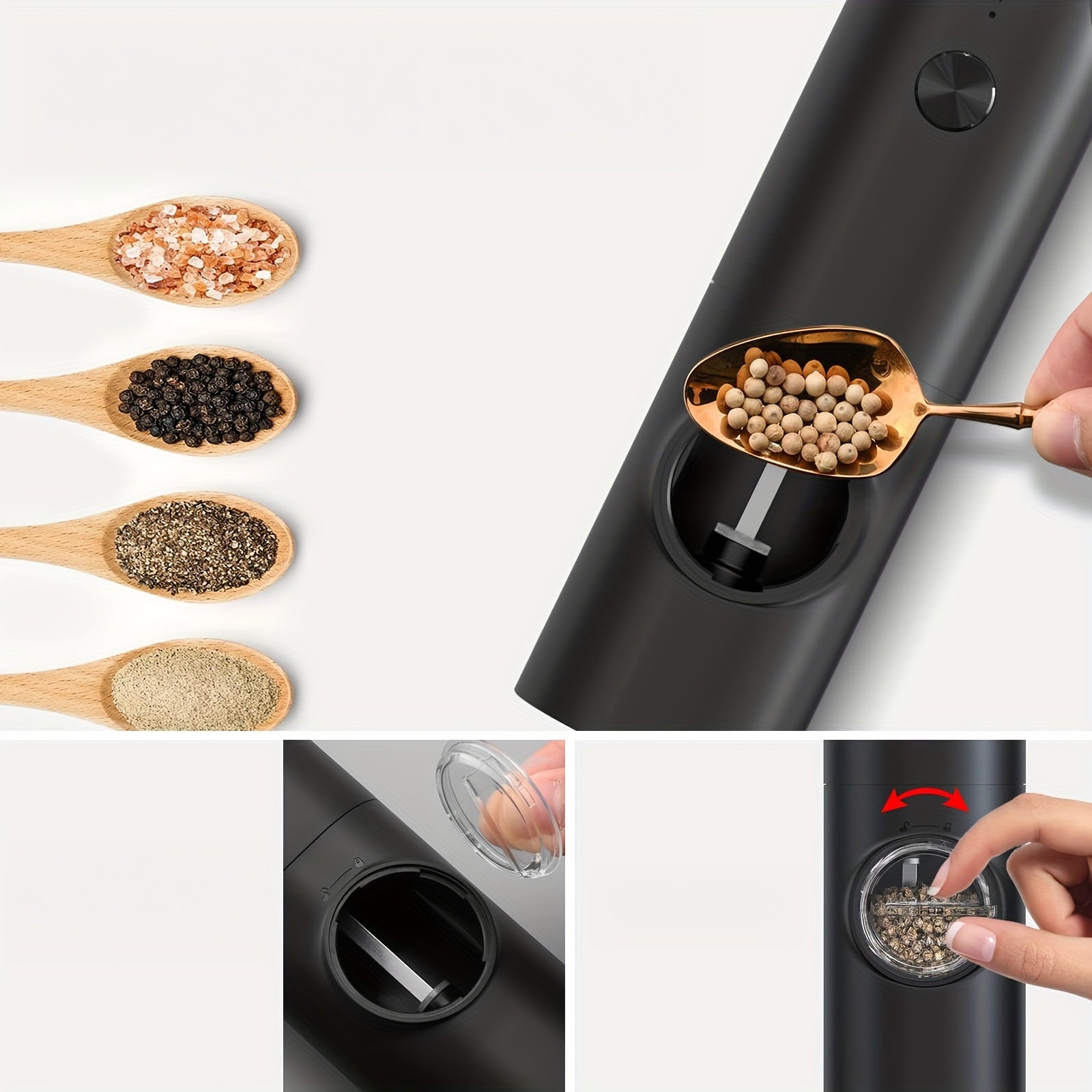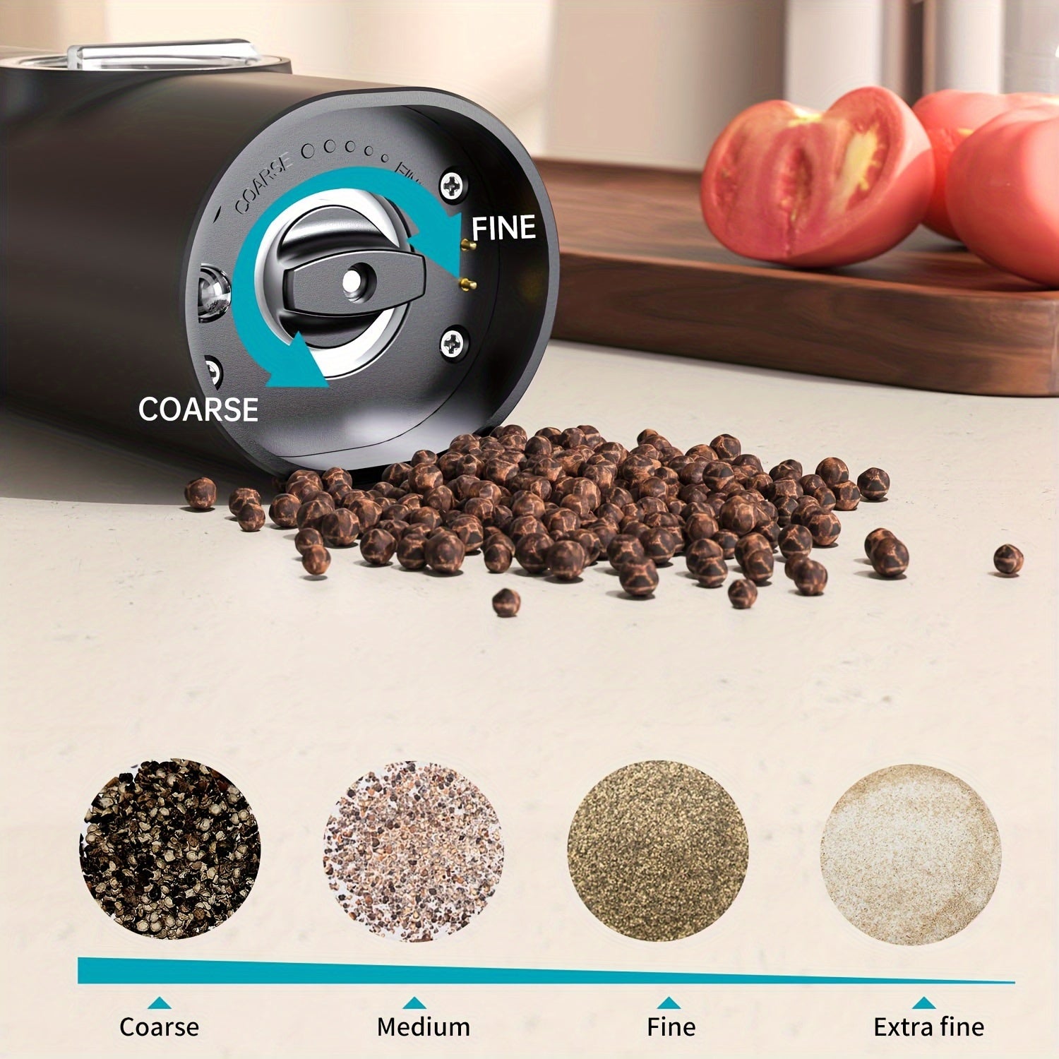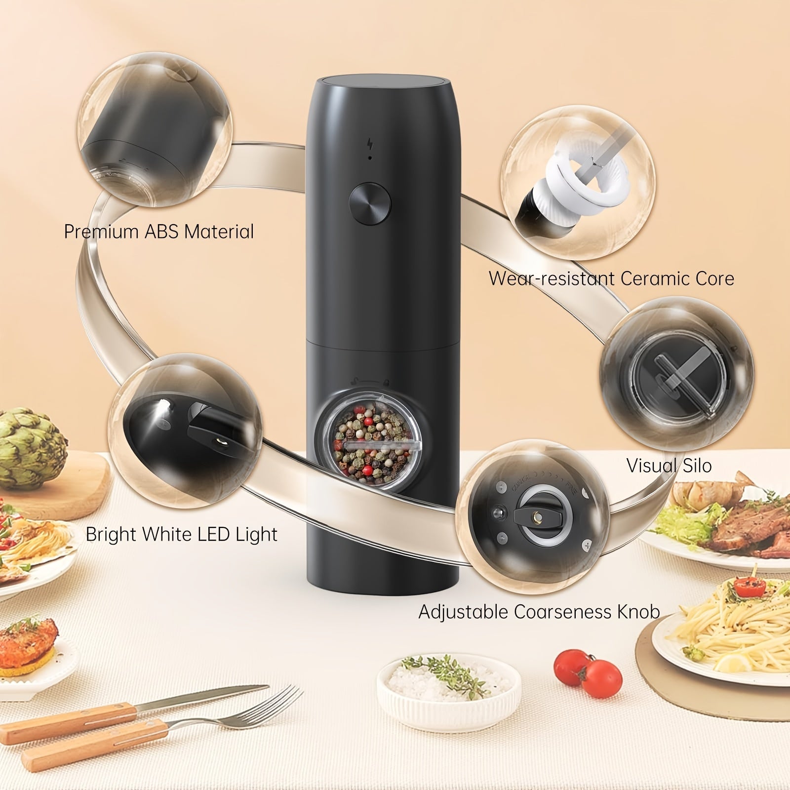 Qayta to'ldiriladigan elektr tuz va murch maydalagich, qora, USB LED chirog'i bilan, keramik maydalagich, sozlanadigan qattiqlik, bitta qo'l bilan boshqarish