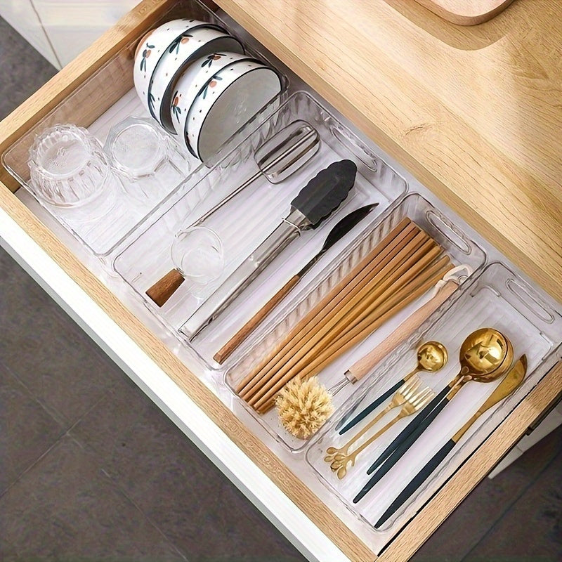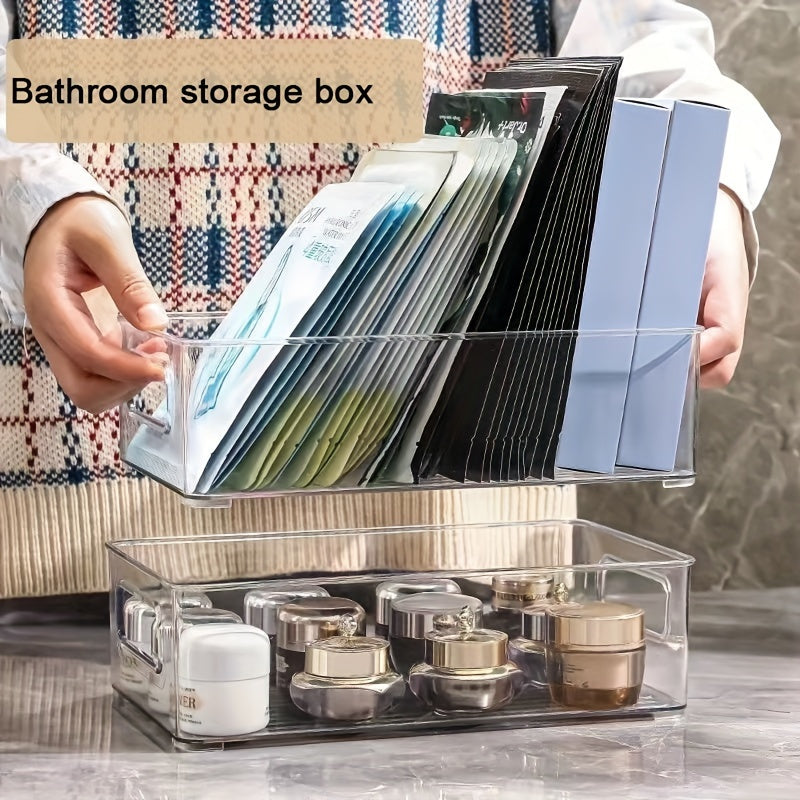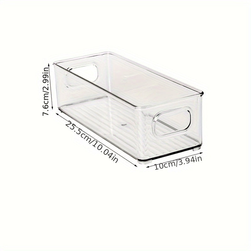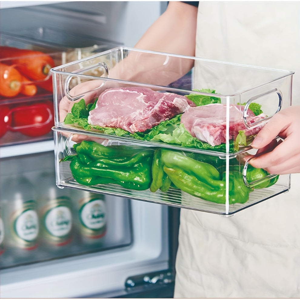 Shaffof plastikdan tayyorlangan tutqichi bo'lgan to'rtburchakli oshxona muzlatgichi tashkilotchisi - mevalar, sabzavotlar, go'sht, atıştırmalıklar va ichimliklar uchun mos oziq-ovqat xavfsiz saqlash qutisi.