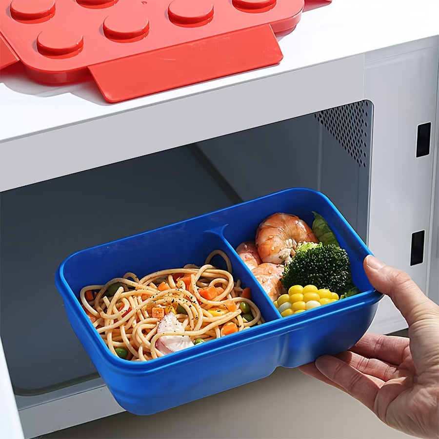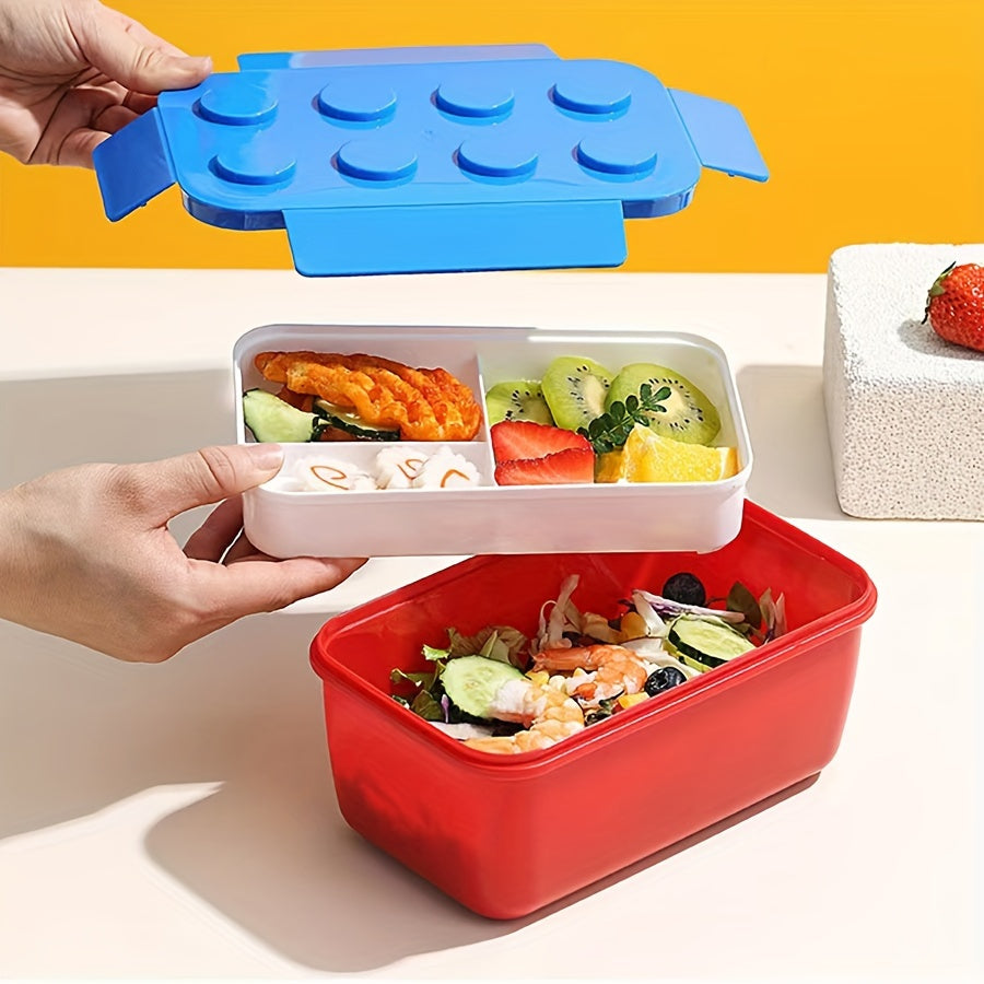 Qizil va ko‘k qurilish bloklari tushlik qutisi, idishlar bilan, suv o'tkazmaydigan, mikroto‘lqinli pechga mos, 3 bo‘limli Bento