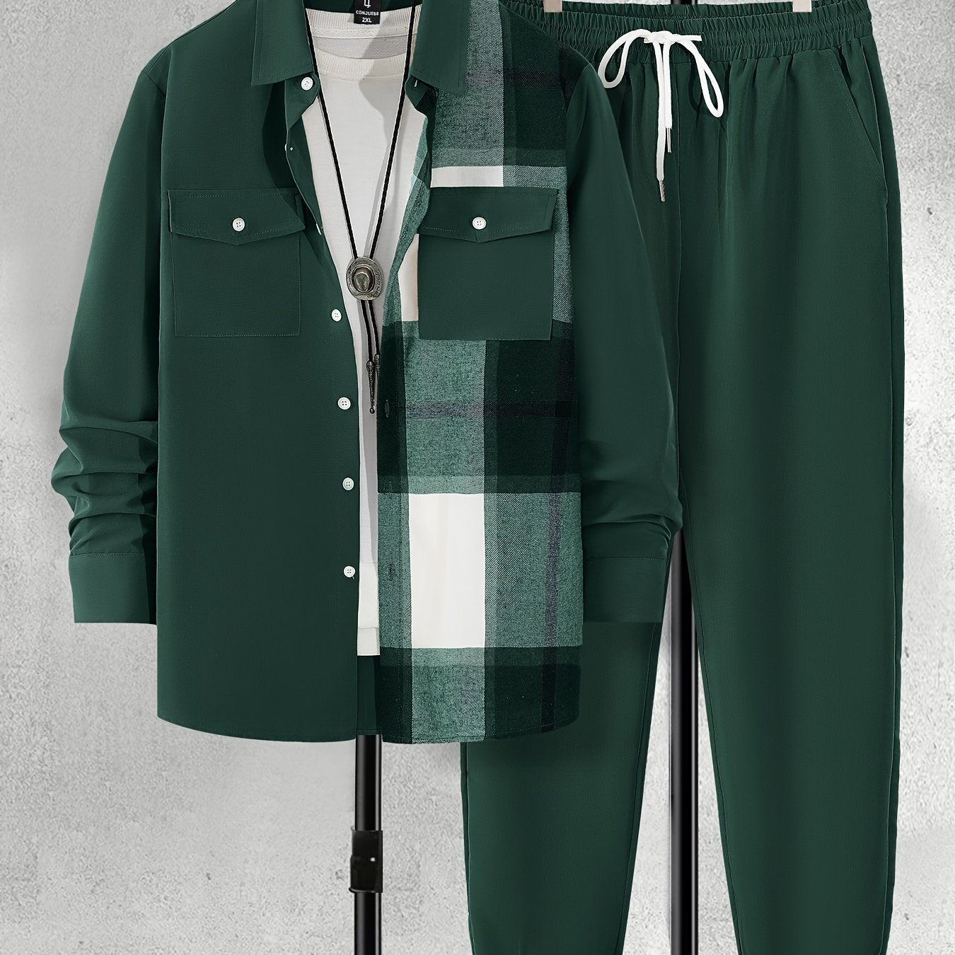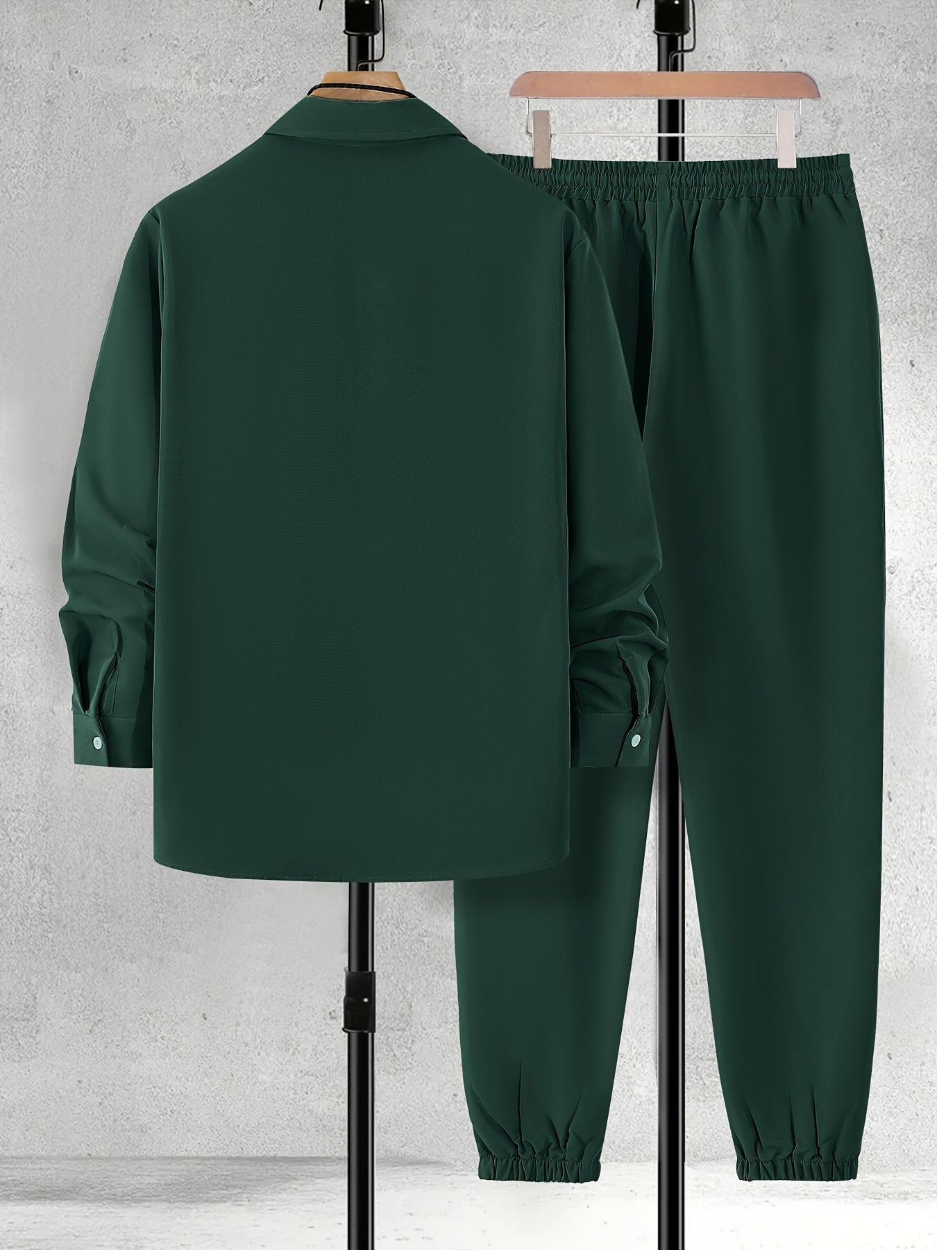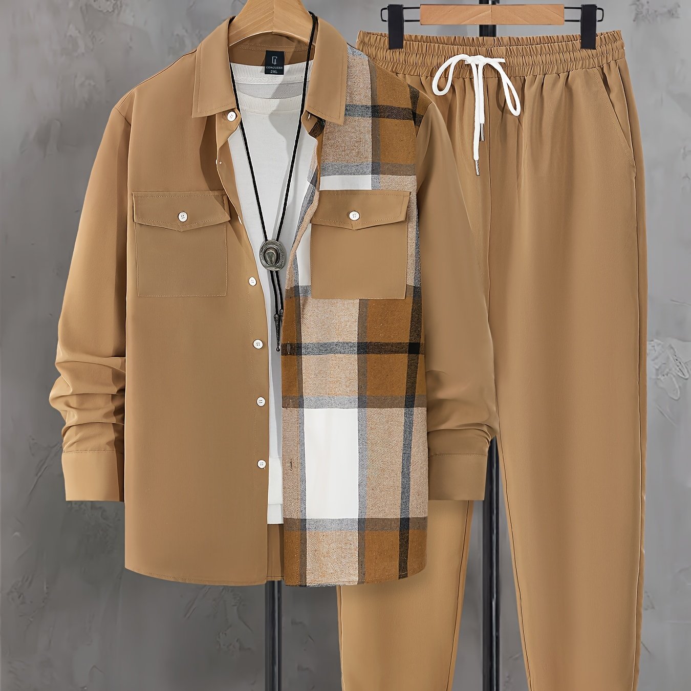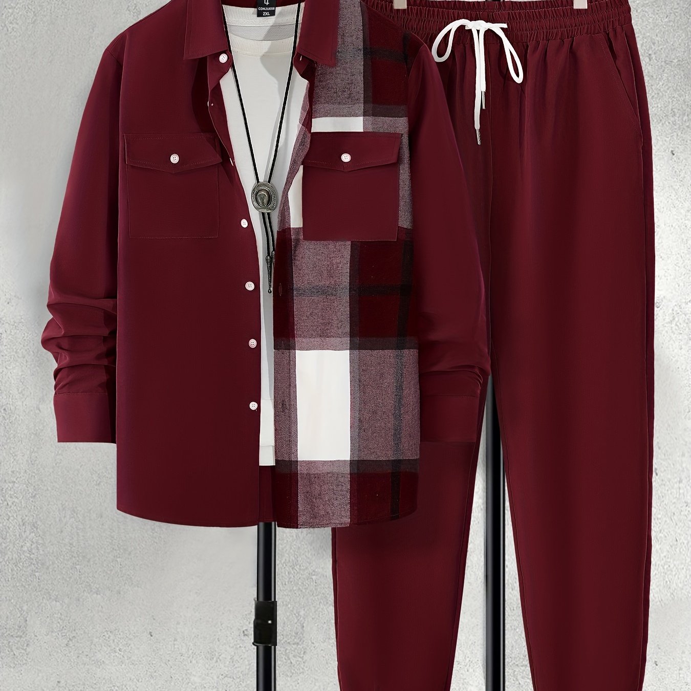 Katta o'lchamdagi erkaklar uchun qizil va jigarrang tekis to'qimalar bilan ikki qismli kuz flanel to'plami, cho'ntakli tugmachali ko'ylak va tortish belli shimlarni o'z ichiga oladi, tasodifiy kiyim uchun polyester matodan tayyorlangan.