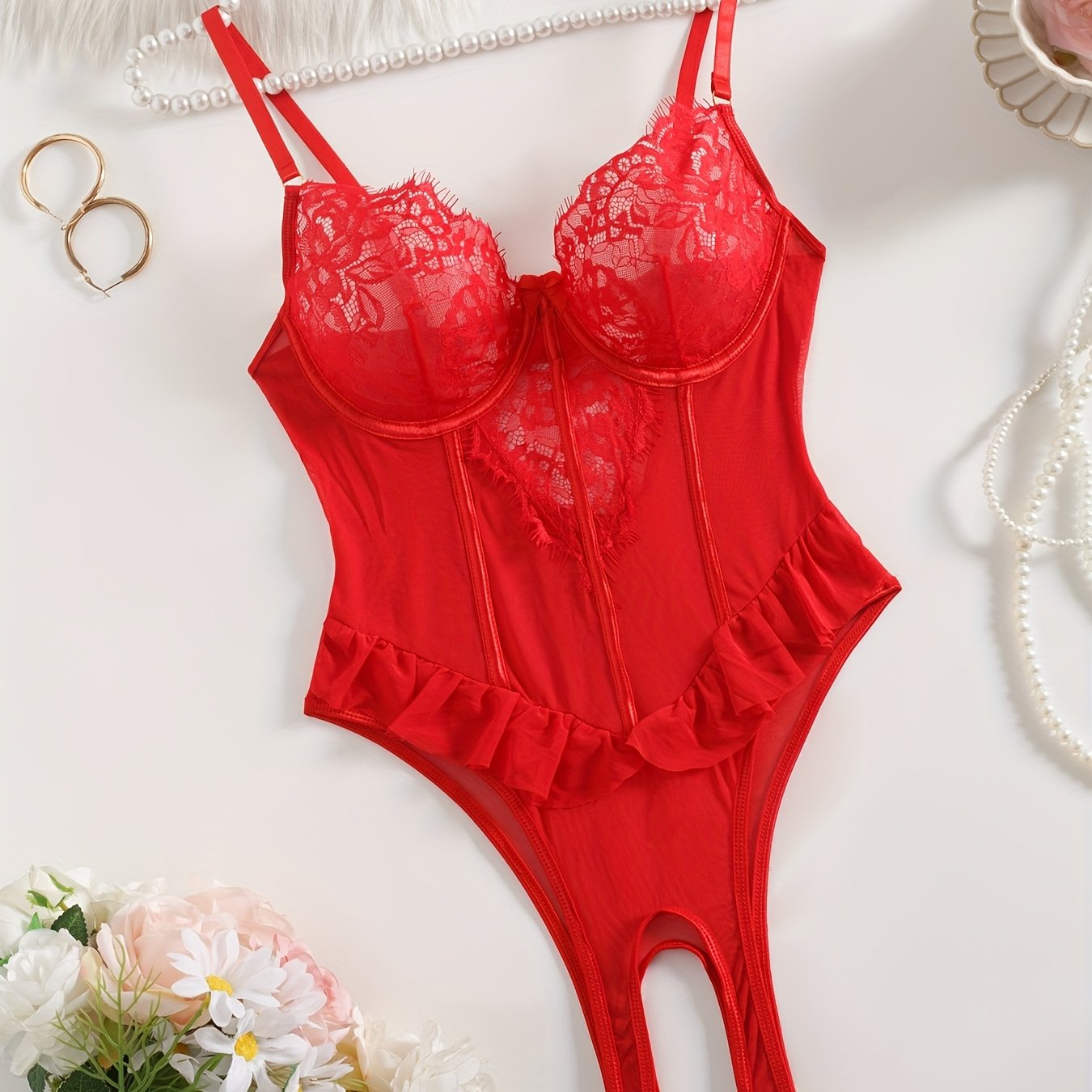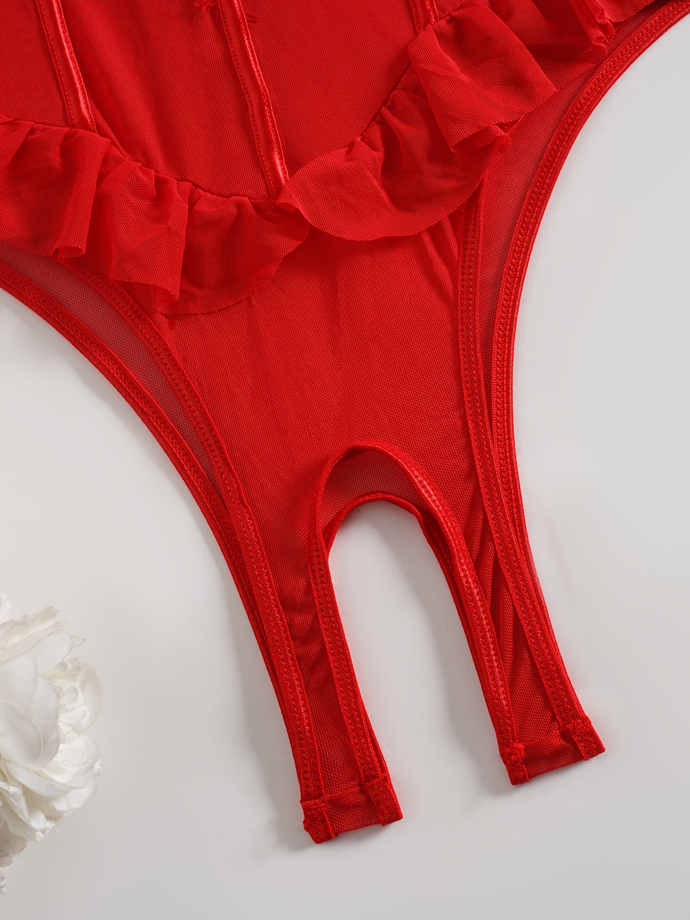 Qizil dantelli velur teddy, qirrali tafsilotlar bilan, simli qo'llab-quvvatlash va yuqori kesilgan, orqasiz dizayn. Gullar dantelli naqshlari, sozlanadigan kamarlar va dantel trim bilan yarim shaffof tuzilishga ega.