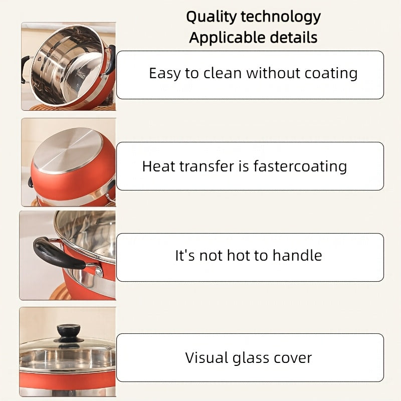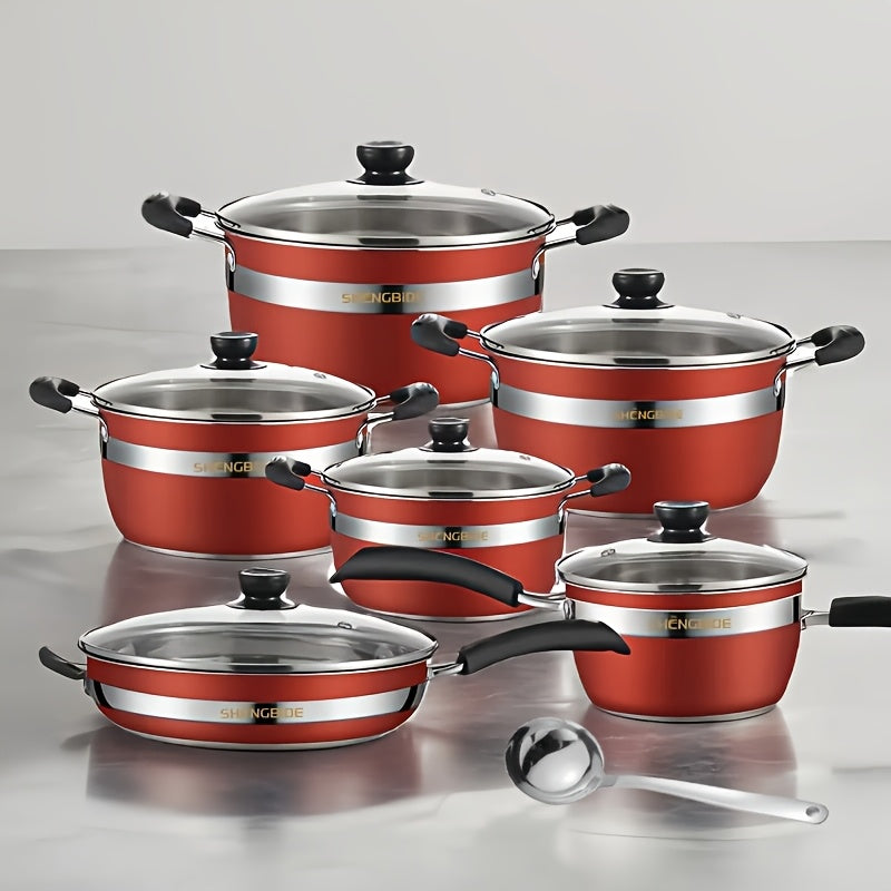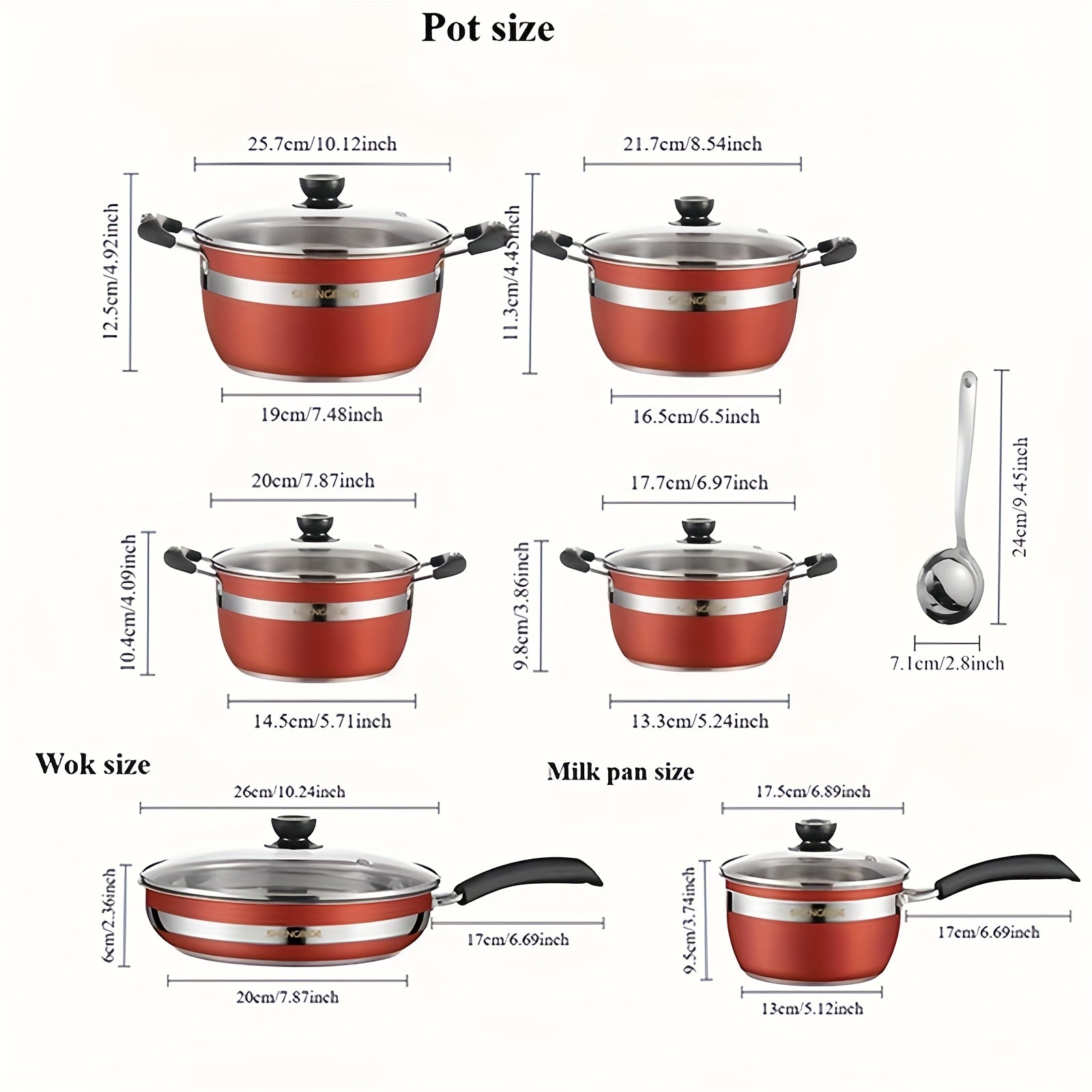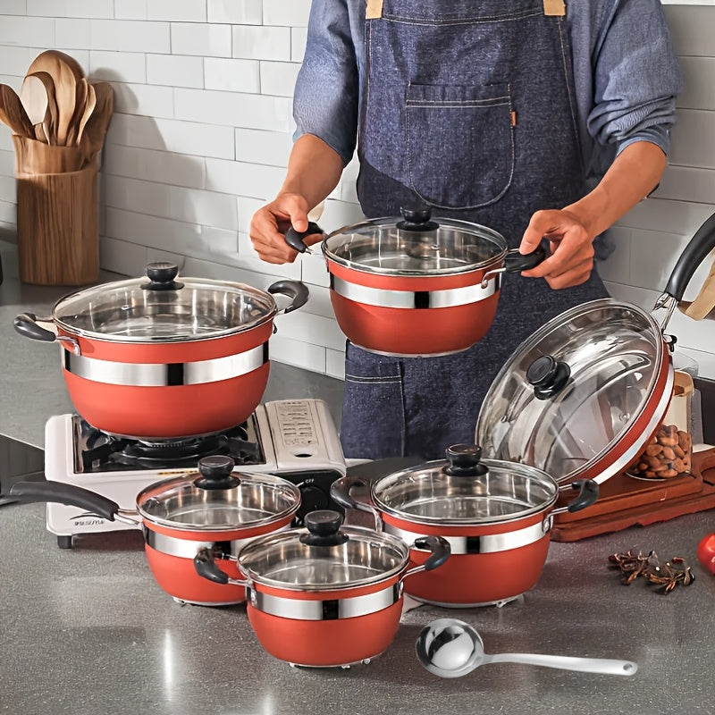Qizil zanglamas po'latdan yasalgan 13 dona idish-to'plam - Barcha plitalar uchun yopishqoq va issiqqa chidamli idishlar - Qovurish panasi, sosli idish va katta idish bilan to'liq - Sizning oshxonangizga zarur, mustahkam va ko'p funksiyali qo'shimcha