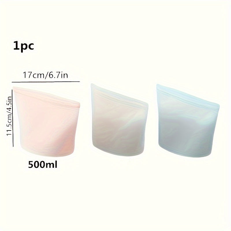 Qayta ishlatiladigan silikon oziq-ovqat saqlash sumkasi 500ml, oqmaslik uchun muhrlangan yangilik sumkasi, oziq-ovqat bilan aloqa darajasidagi muzlatgichda saqlash sumkasi