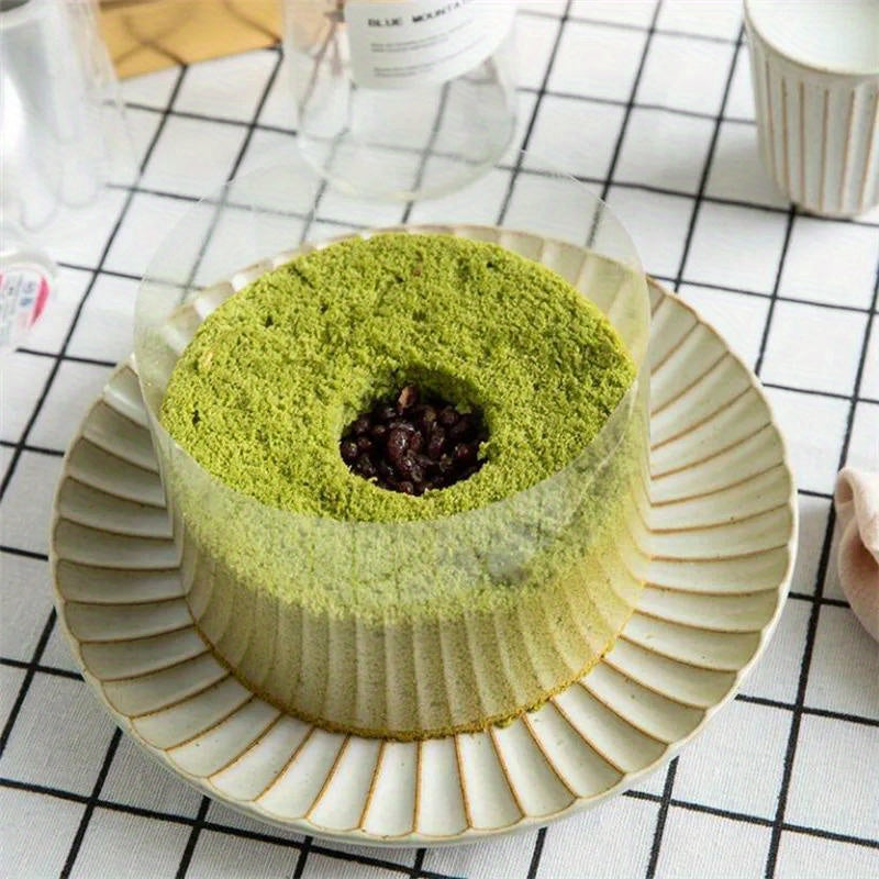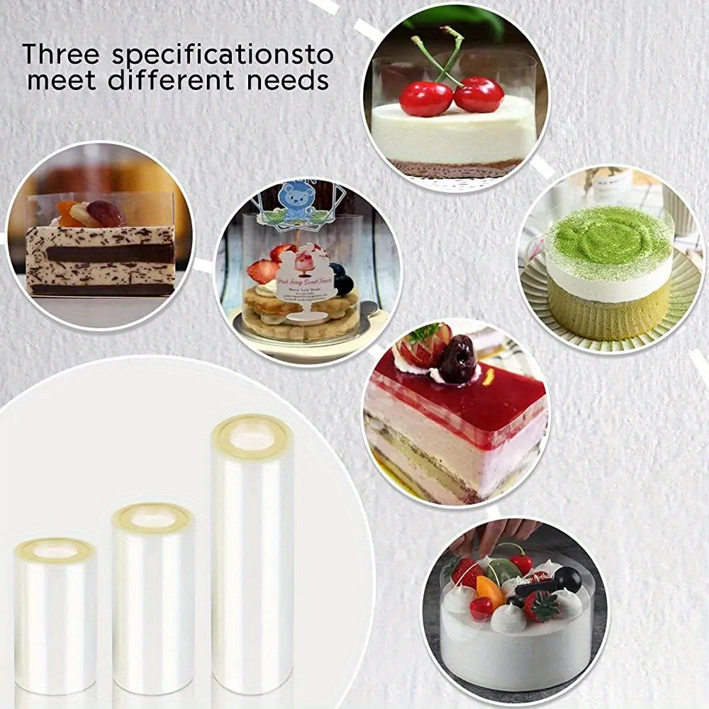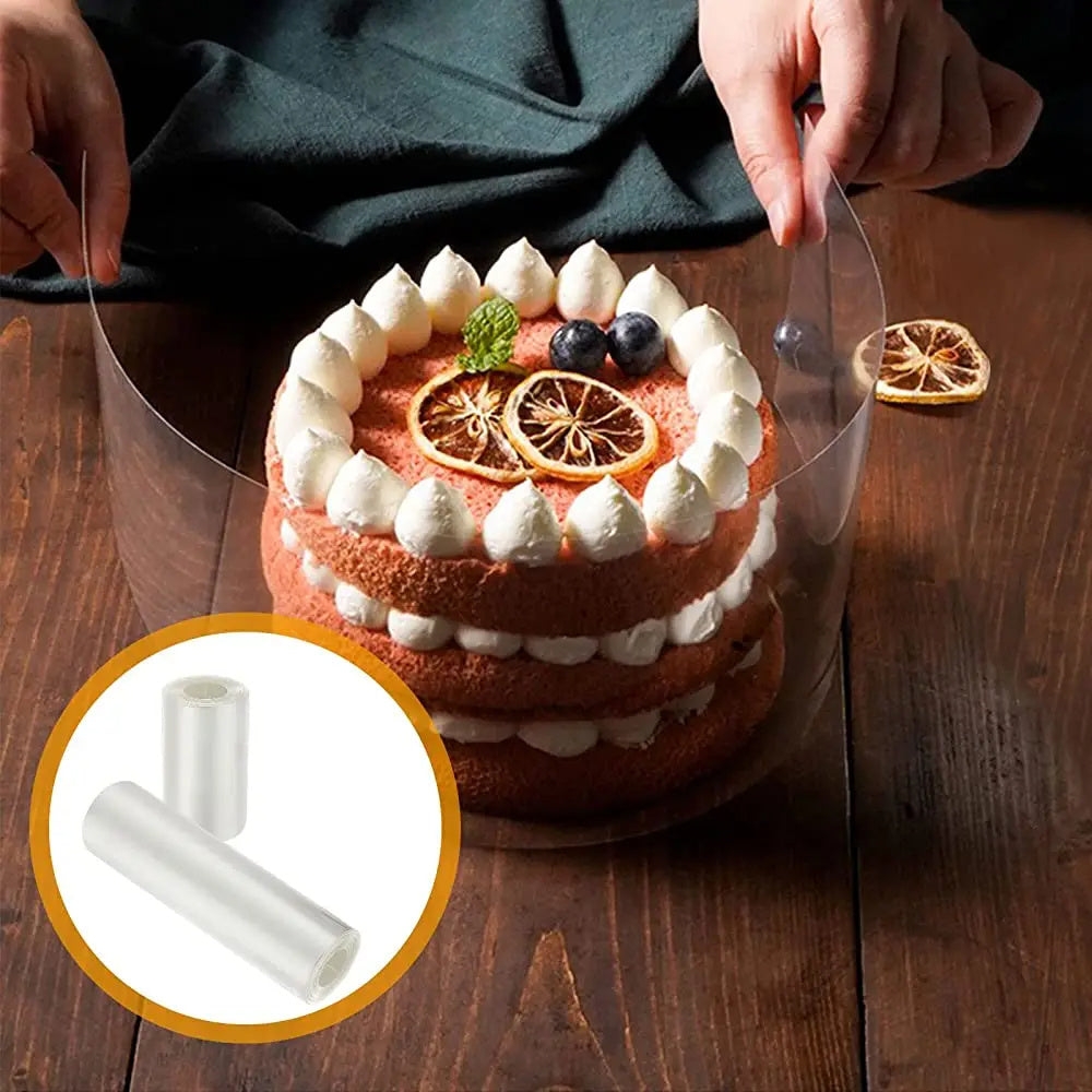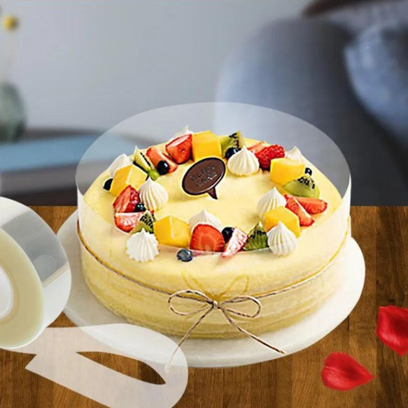 Shaffof asetat shokoladli konfet pishirish filmi bilan tayyorlangan qayta ishlatiladigan PET tort qopqog'i, qulflanishi bilan, muzlatgichda saqlash uchun mos. O'lchamlari 8 sm x 10 m yoki 10 sm x 10 m da mavjud.