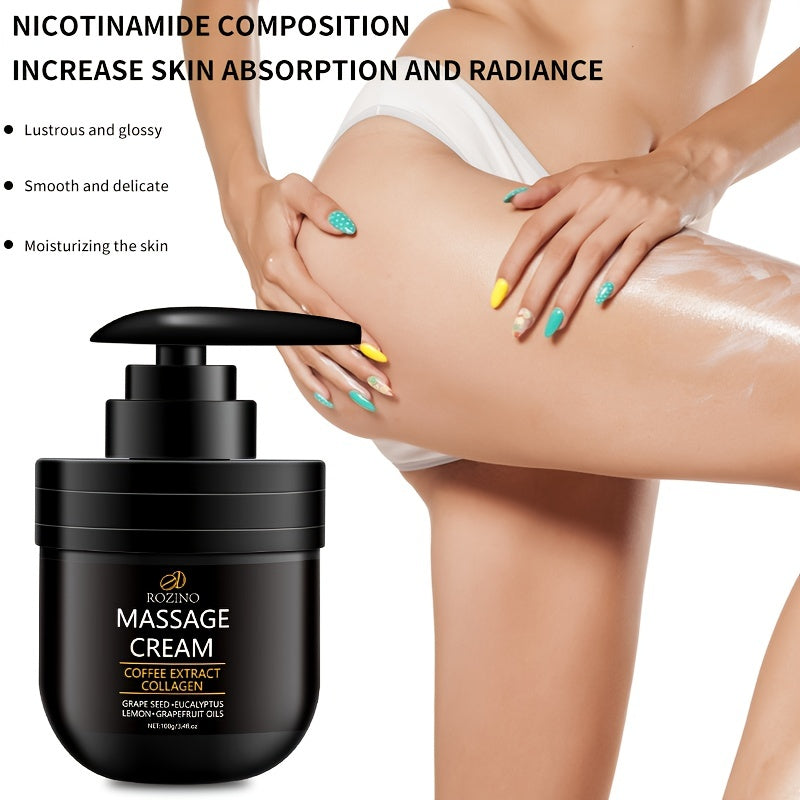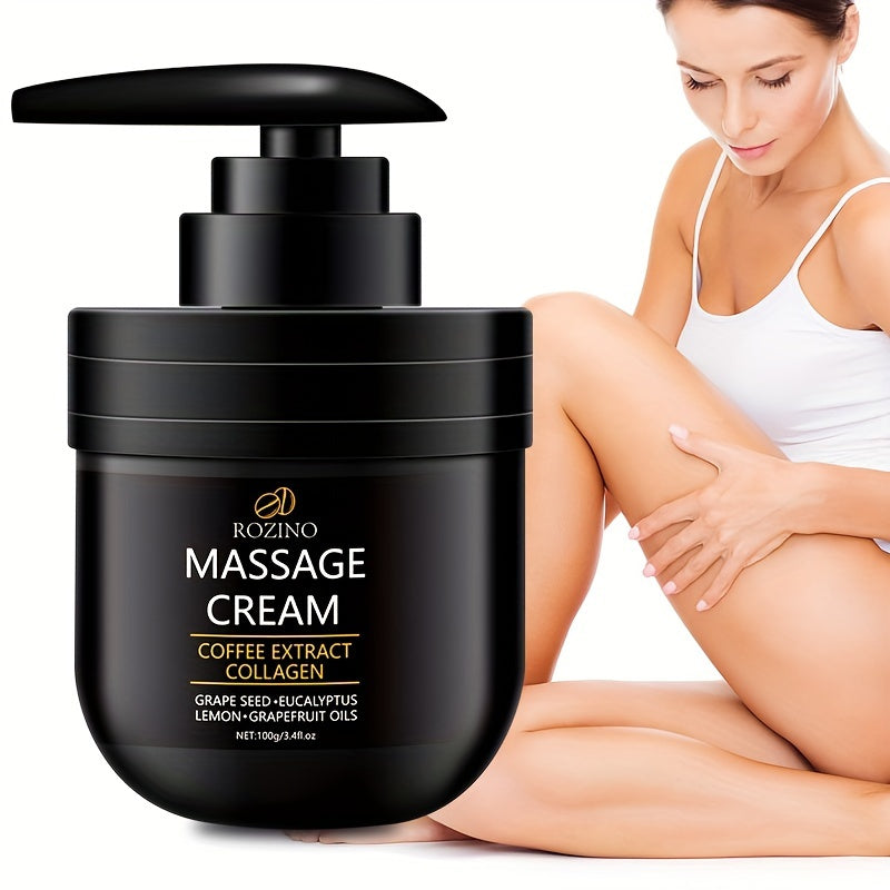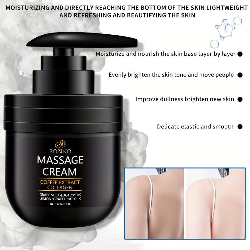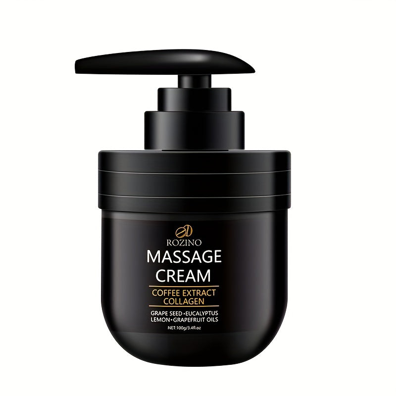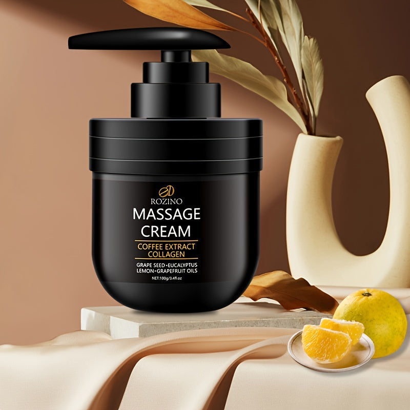 ROZINO Kofe ekstrakti, kollagen, uzum urug'i, eukalipt, limon va greypfrut yog'lari bilan massaj kremi terini namlaydi, yorqinlashtiradi va oziqlantiradi.