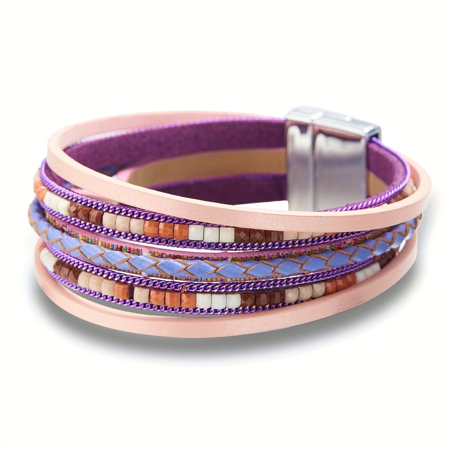 Rustik-chic, qo'l bilan tayyorlangan qatlamli sun'iy charm bilaguzuk, magnit qotishma qopqog'i bilan - har qanday vintage ilhomlangan kiyimlar uchun klassik qo'shimcha, bohem uslubidagi modachilar uchun mukammal.
