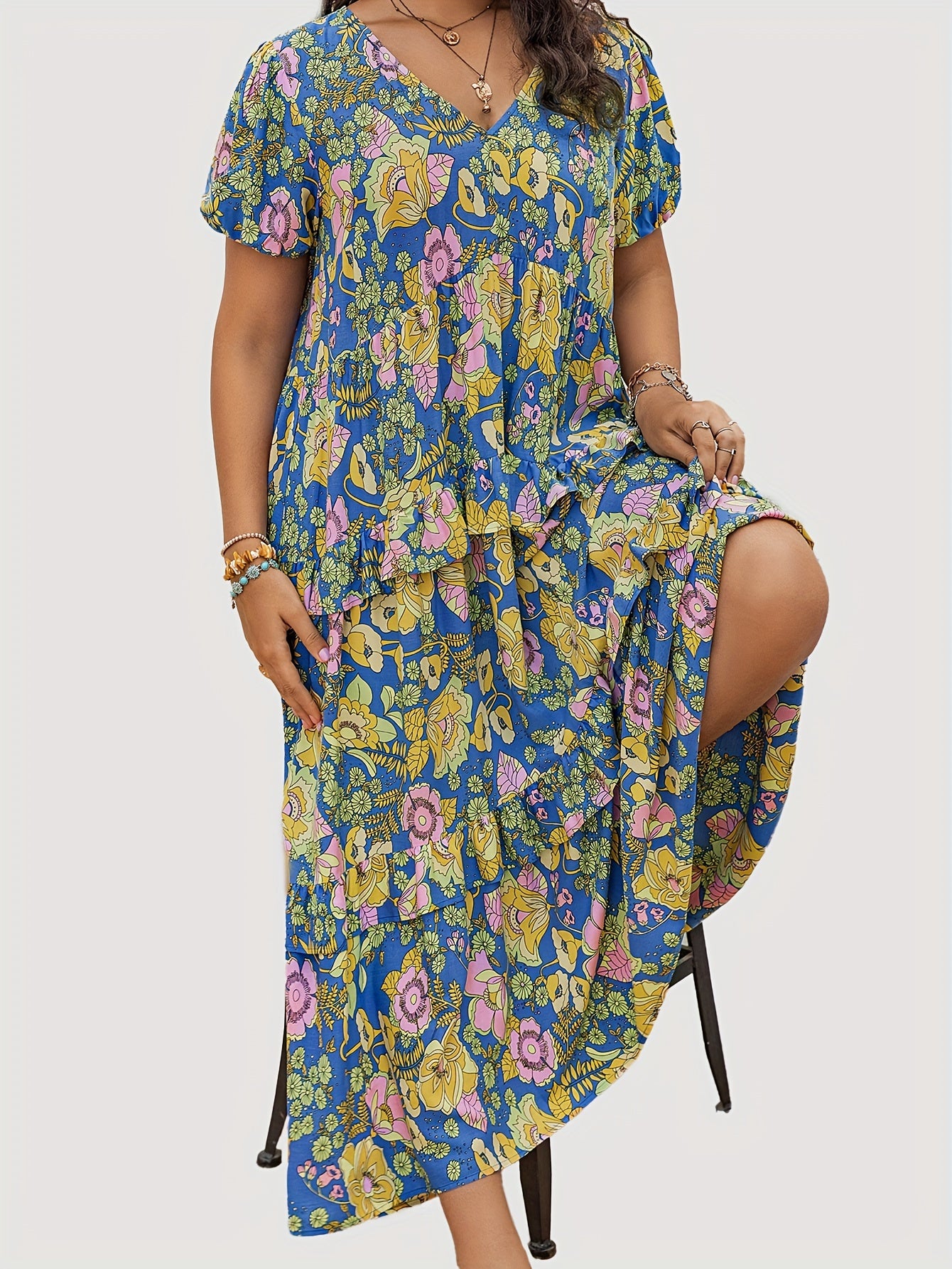 Boho Chic yozgi kiyi ayollar uchun, pleated ruffle uzun bo'yli, gullar bilan bezatilgan V-neck, ko'p ranglarda