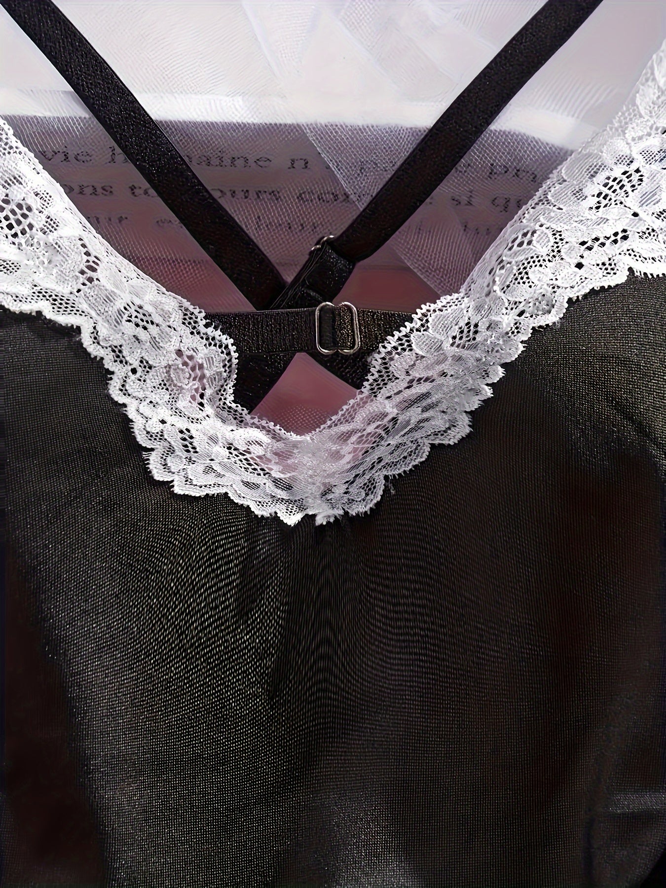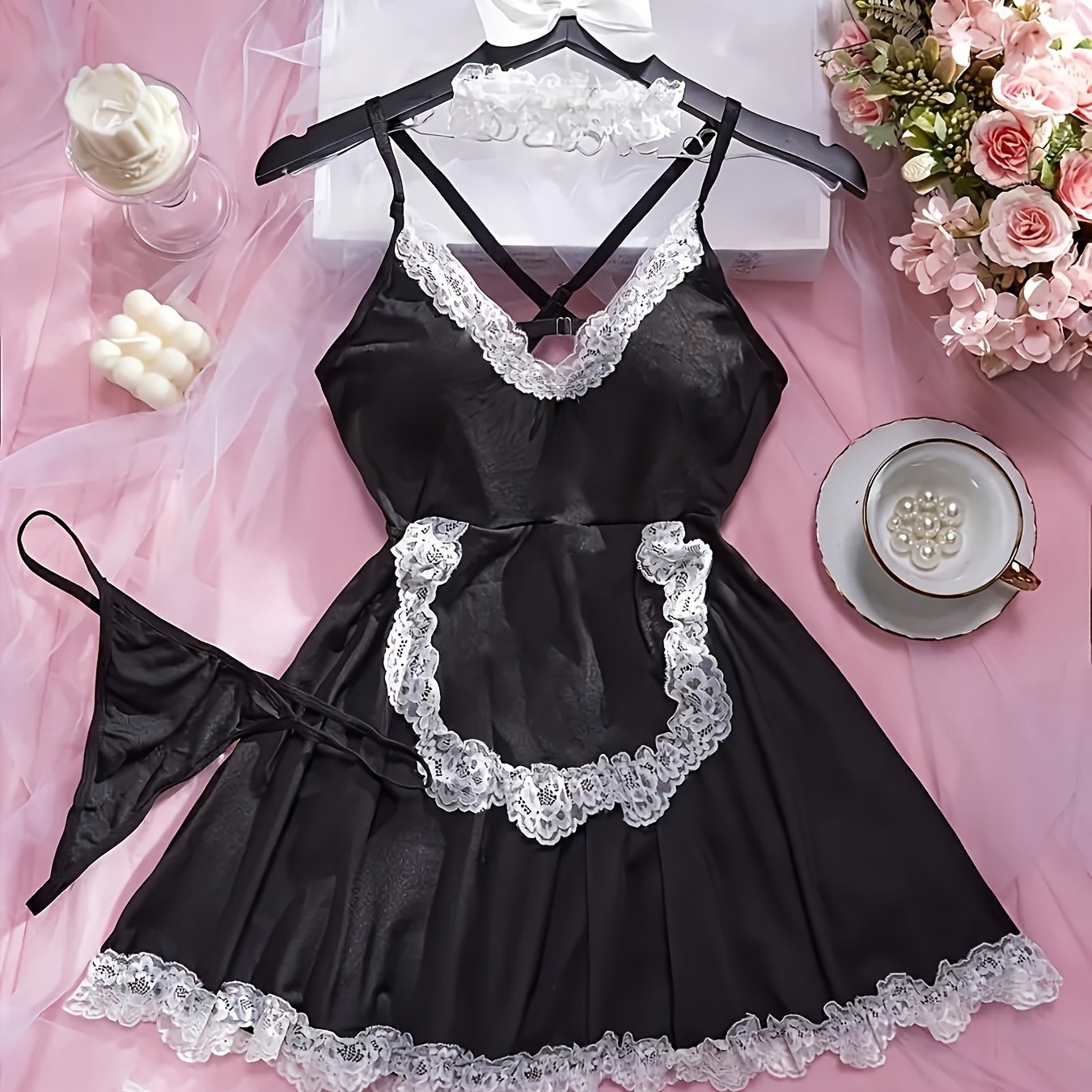 Jozibador to'rt qismli to'plam, xizmatkor formasi, ichki kiyim, oyoq halqalari, marjon va ichki kiyim.