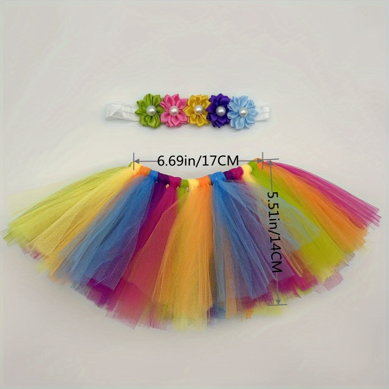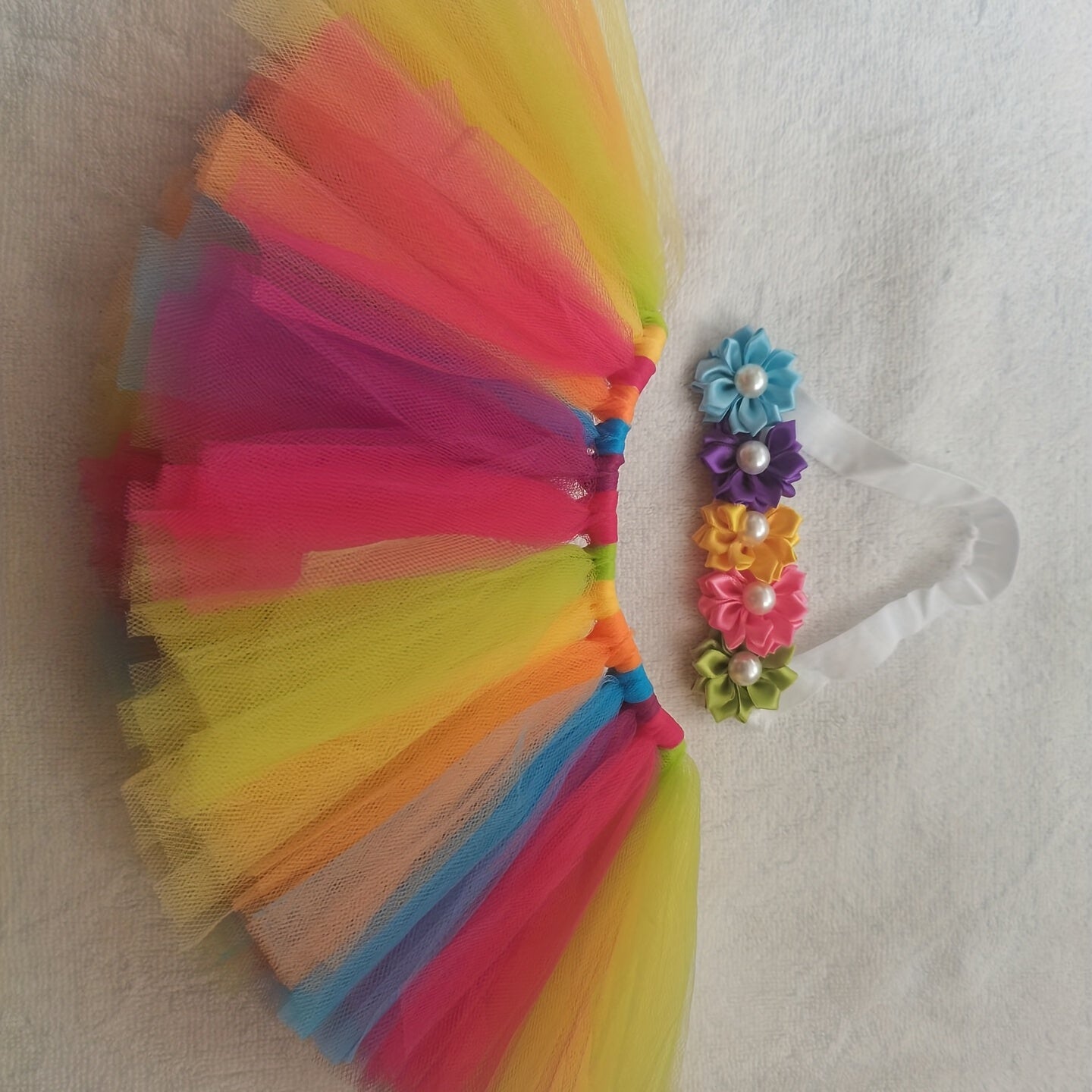 To'plamga Kamalak rangli tutu yubka, qizlar uchun ko'ylak, gullar bilan bezatilgan bosh bant va fotosurat aksessuarlar kiradi.
