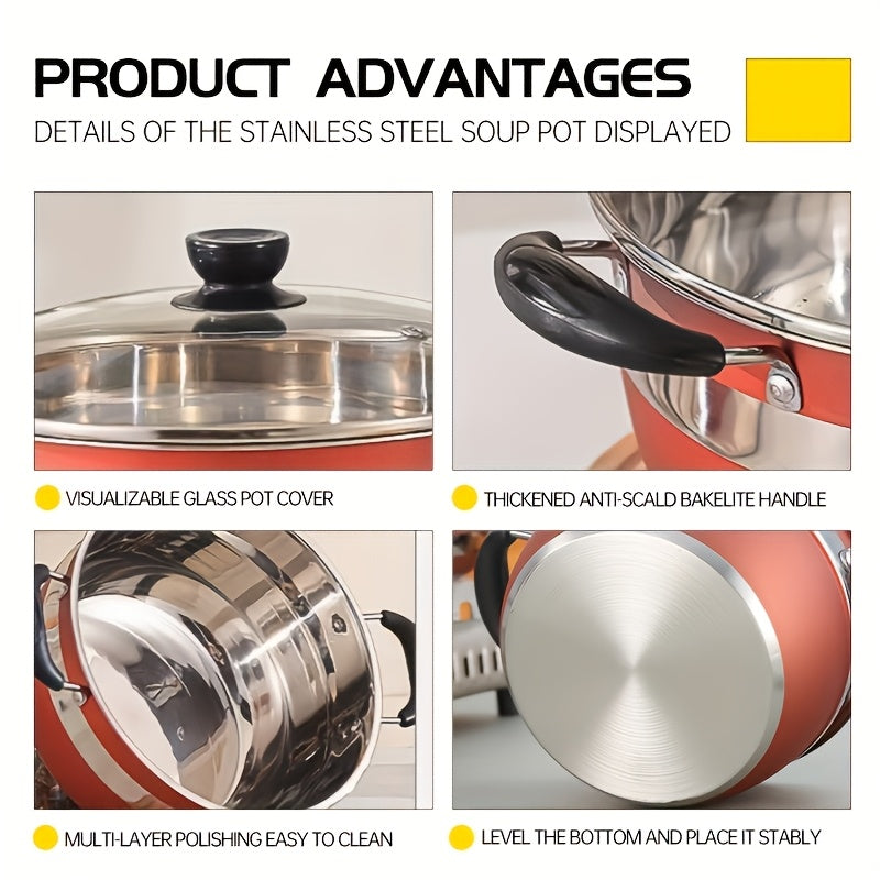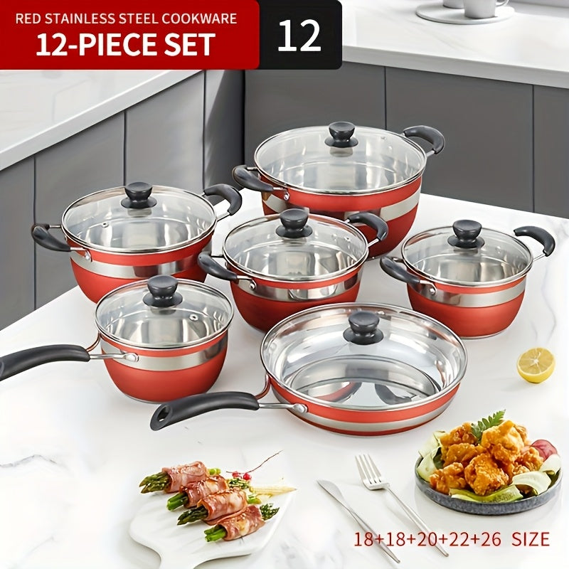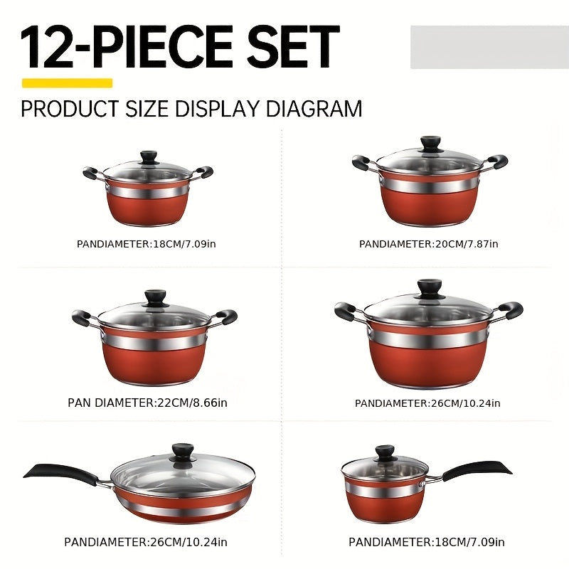12 dona zanglamas po'latdan yasalgan qozonlar to'plami, qalinlashtirilgan yopishqoq qovurish qozoni, sut qozoni va ikki qavatli sho'rva qozoni bilan, chegara orti oshpazlik uchun ideal.