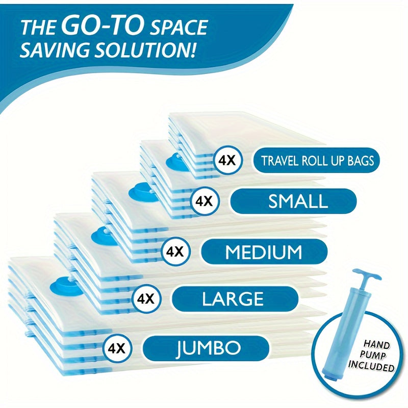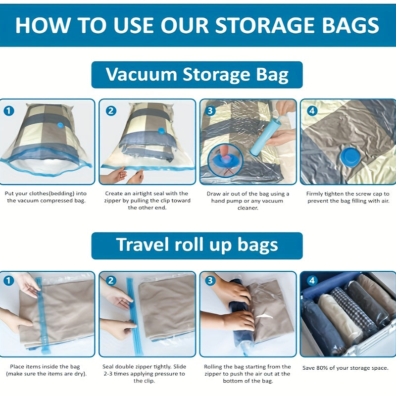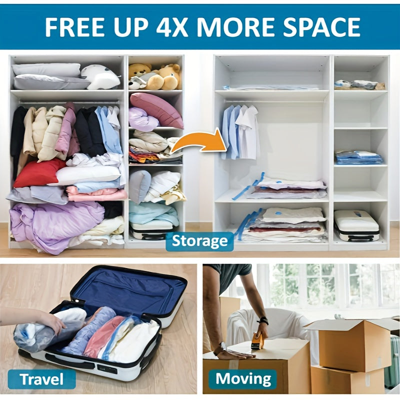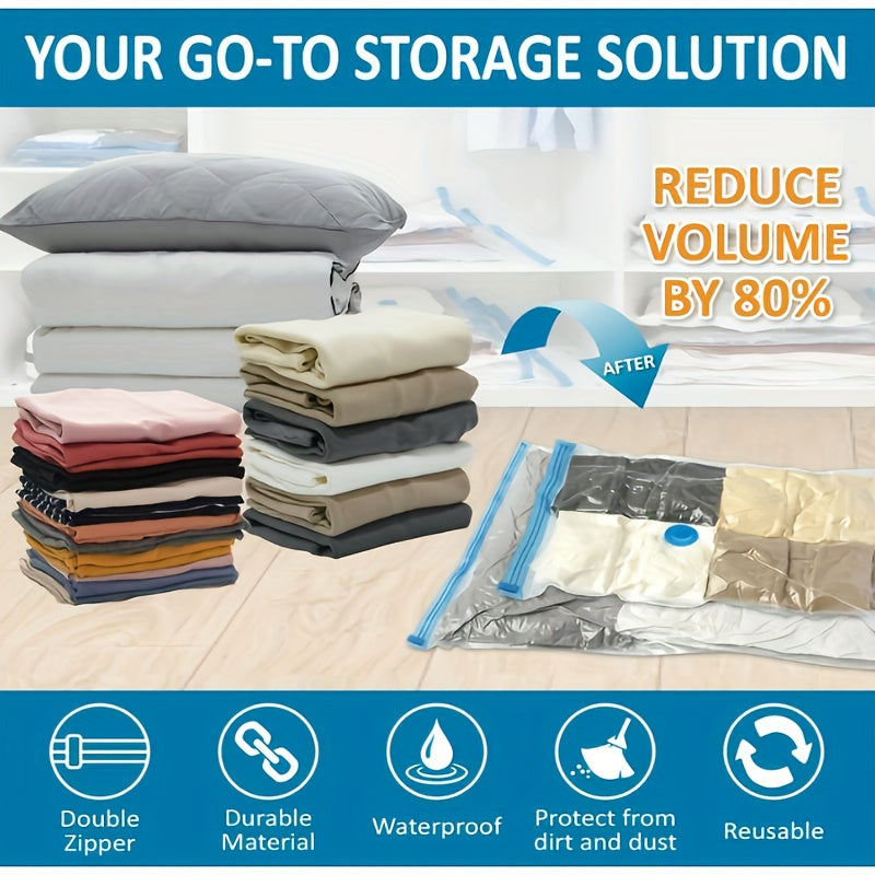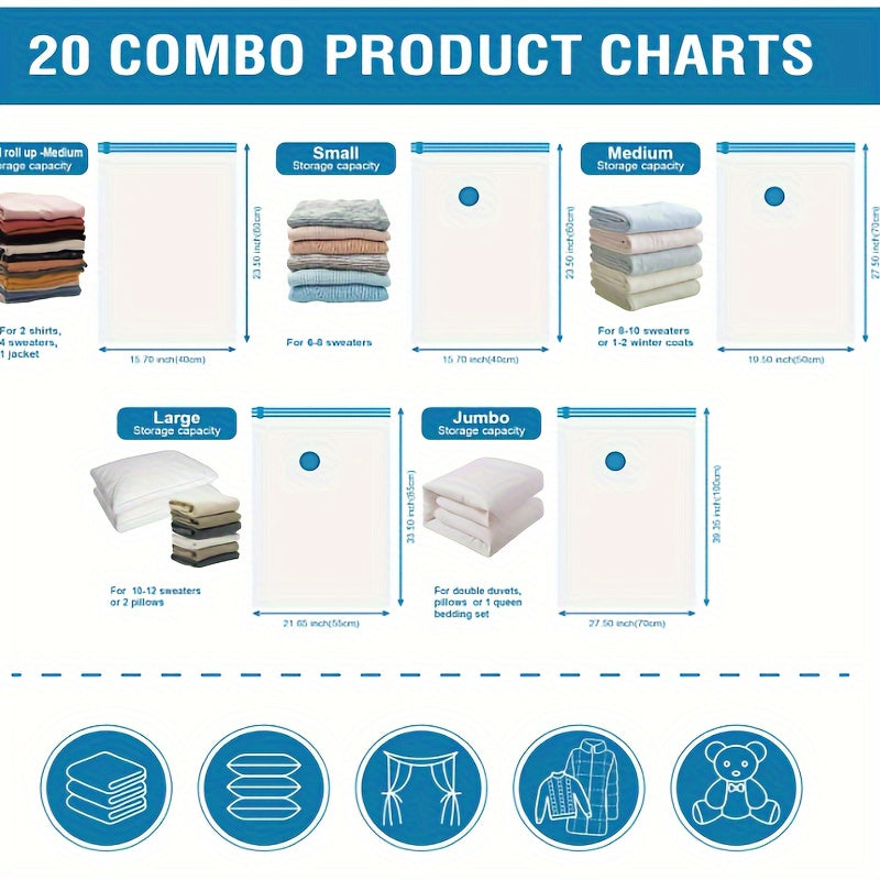 20 ta vakuum siqish saqlash sumkasi to'plami, kiyimlar, ko'rpa va ko'ylaklar uchun havo o'tkazmaydigan saqlash idishlari, yotoqxona, shkaflar va yotoqxonalarda joyni tejovchi tashkilotchi, sayohat uchun zarur joyni tejovchi