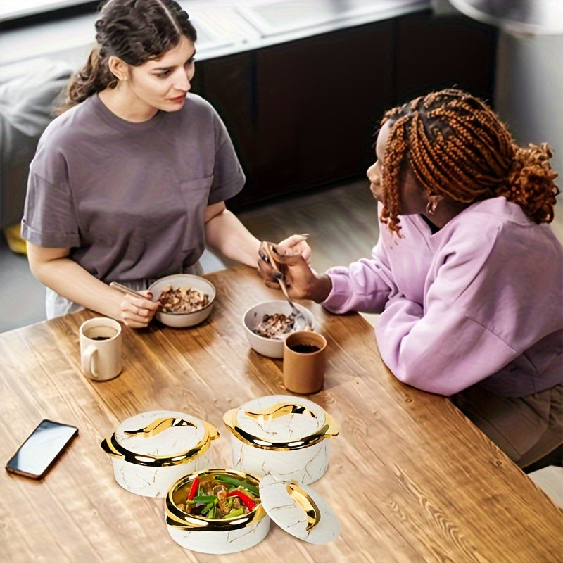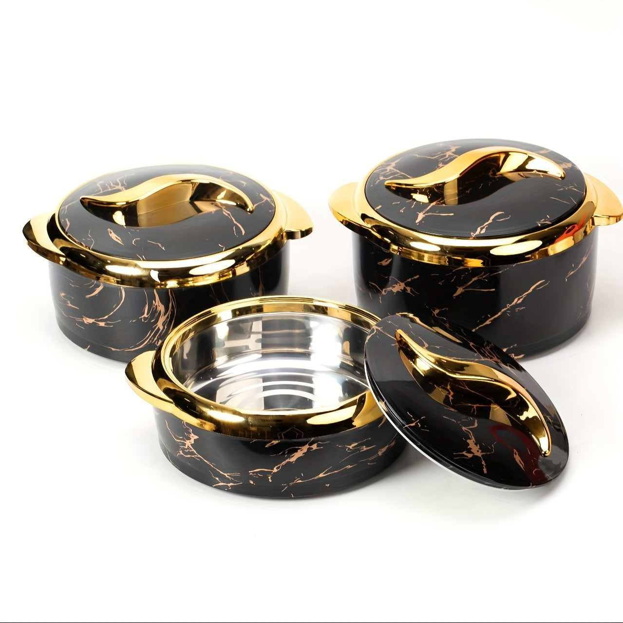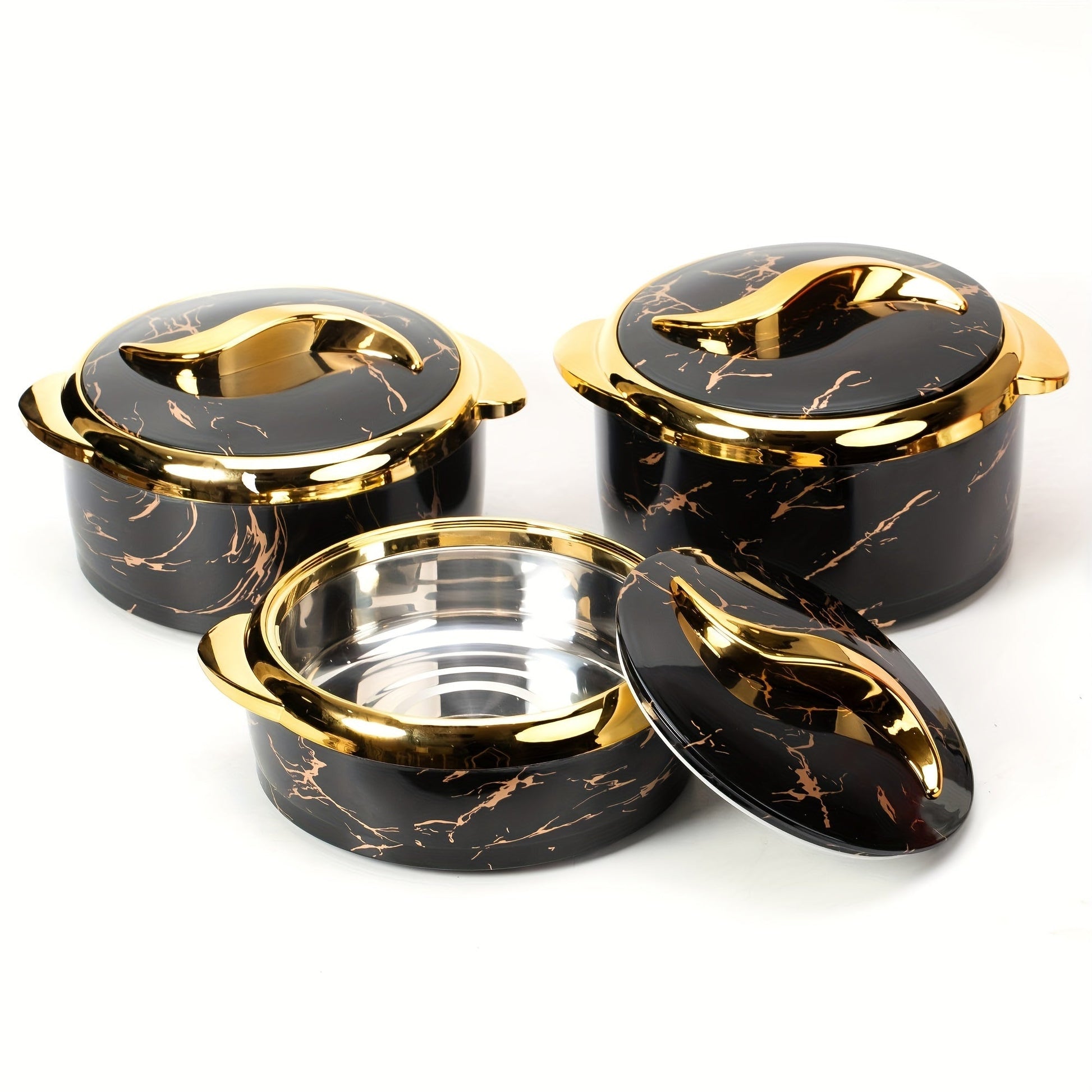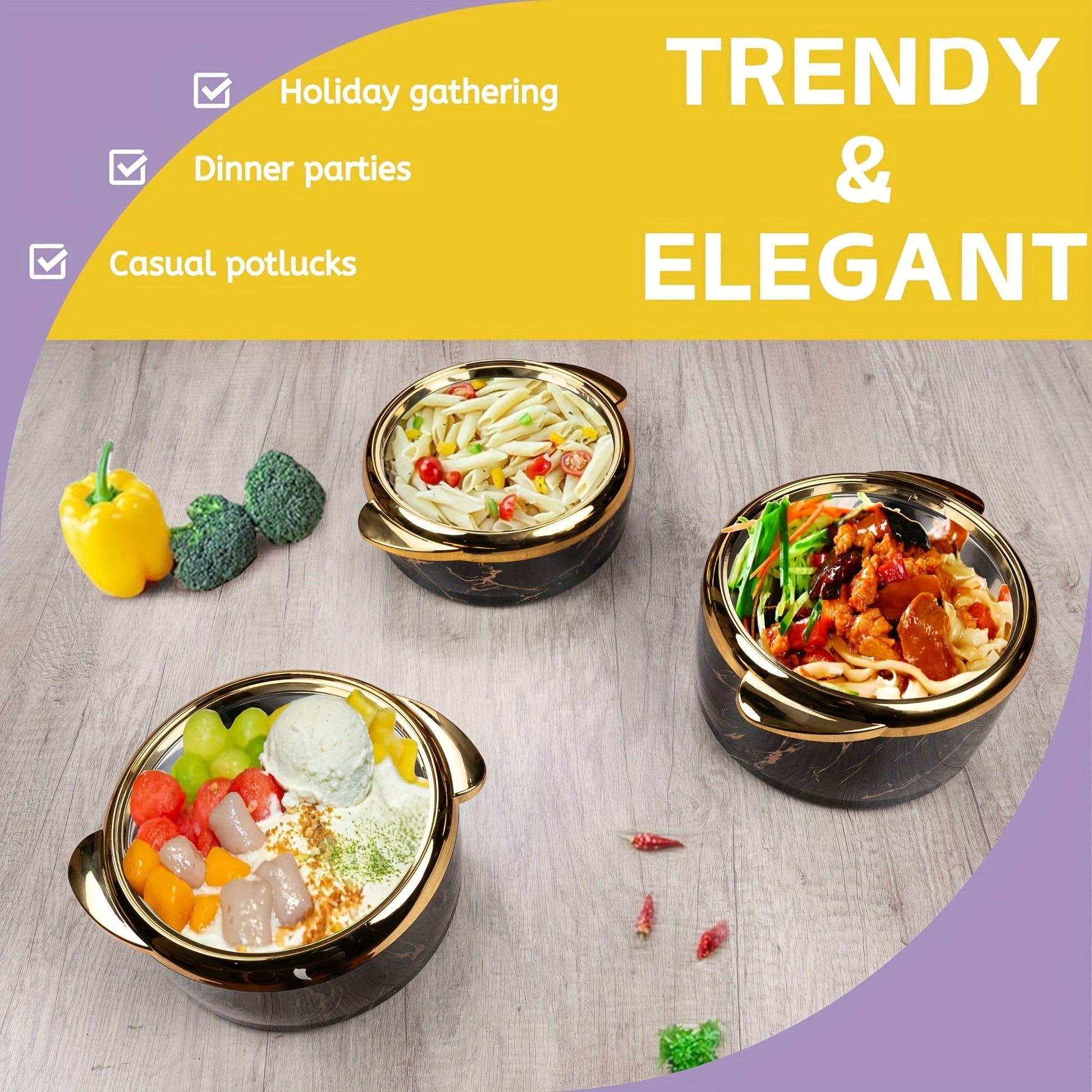 Stainless steel konstruktsiyali va qopqog'li 3 ta termal kaserollardan iborat to'plam - Ovqatni issiq va sovuq saqlash uchun izolyatsiya qiladi, bufetlar yoki ofis stolida xizmat qilish uchun ideal. Taomlarni issiq va yangi saqlash uchun mukammal.