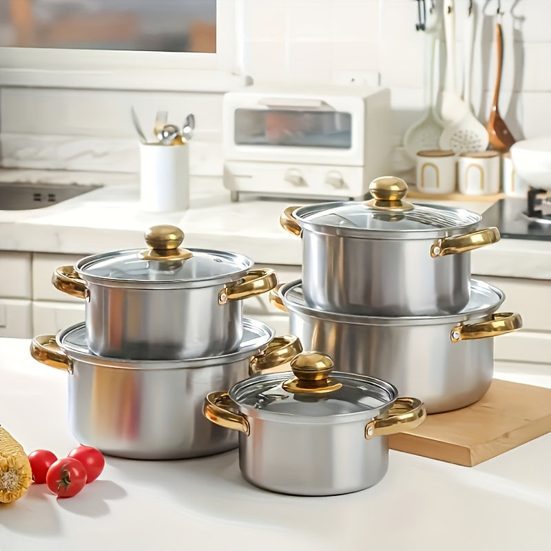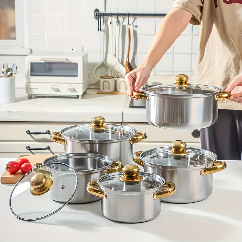 O'n dona oshxona to'plami: Tashqi foydalanish uchun zanglamaydigan po'latdan yasalgan sho'rva qozonlari to'plami, oltin qoplamali ikki tutqichli.