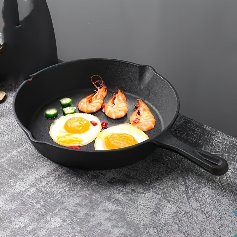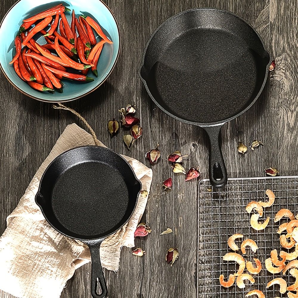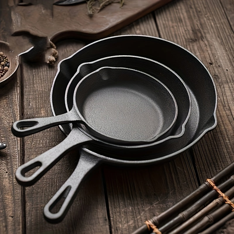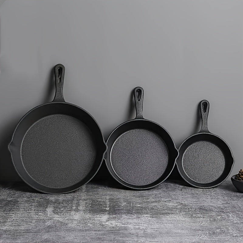Uchta mustahkam quyma temir qozonlar to'plami, yopishqoq qoplama, tekis pastki va 16 sm, 20 sm va 26 sm o'lchamlari bilan, induksion pechlar uchun mos.