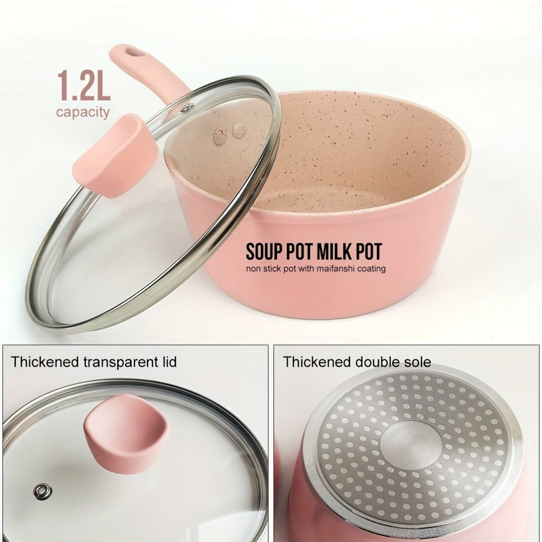 Uchta yopishqoq alyuminiy idishlar to'plami, mustahkam va issiqlikka chidamli bo'lishi uchun mo'ljallangan. Ushbu qozonlar va skovorodkalar tozalash oson, ovqat tayyorlashni osonlashtiradi. Ular elektr, induksiya va gaz pechlari bilan mos keladi.