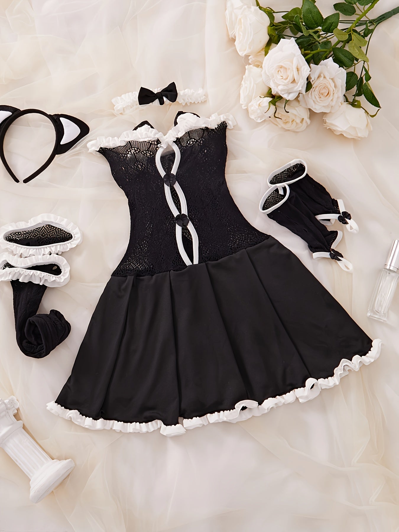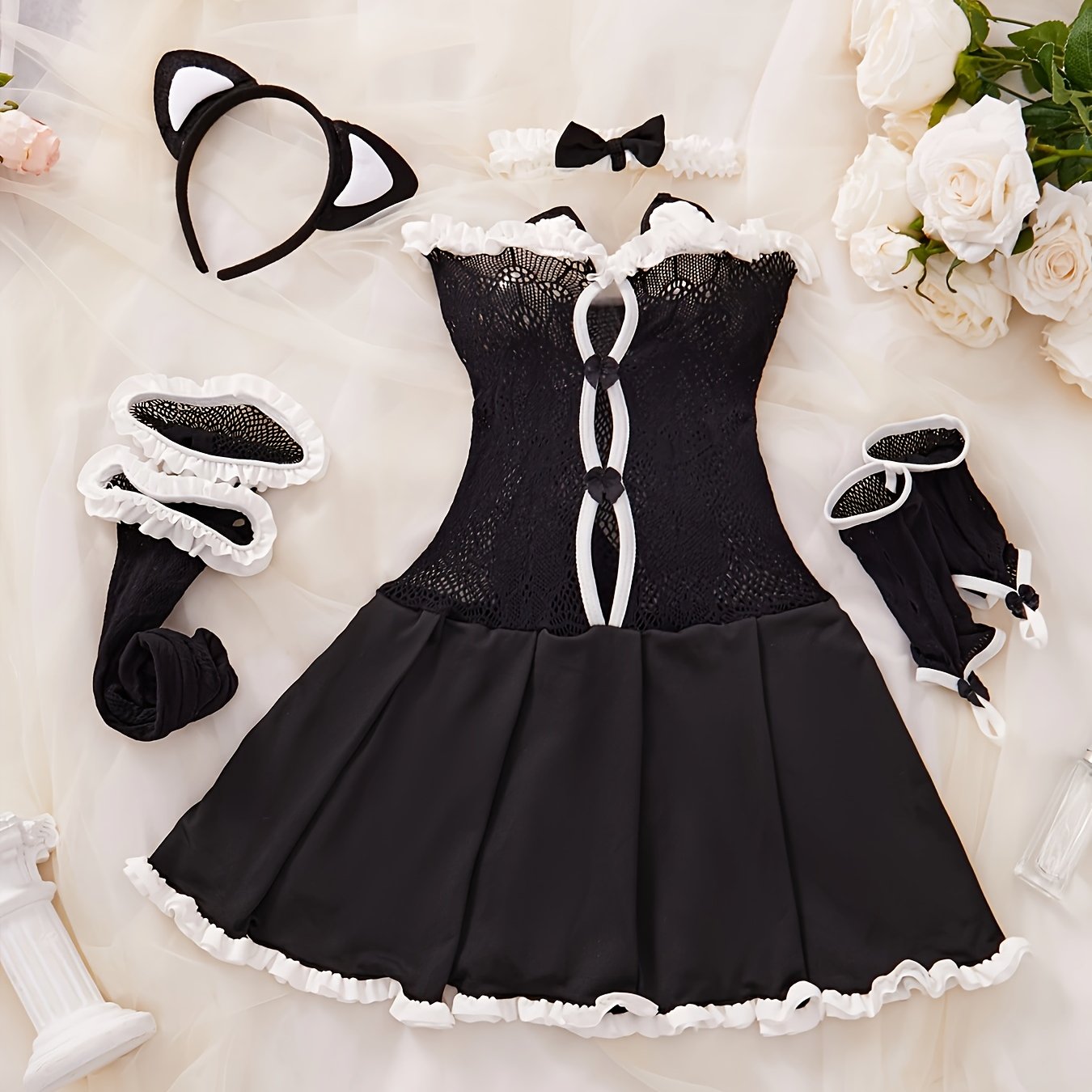 Jozibali ichki kiyim to'plami boshband, kamon, kiyim, qo'lqop va tarmoq paypoqlardan iborat.