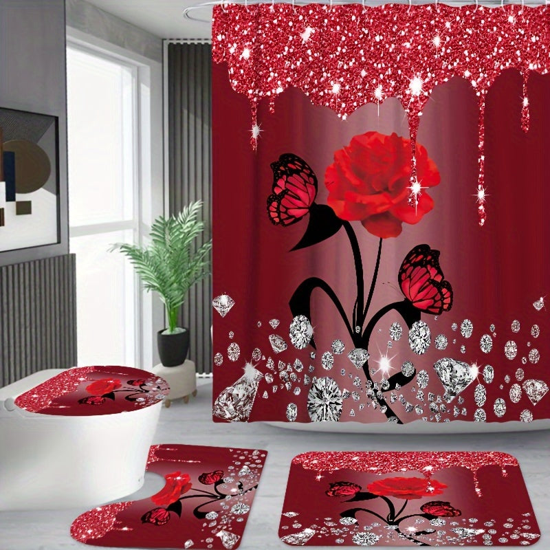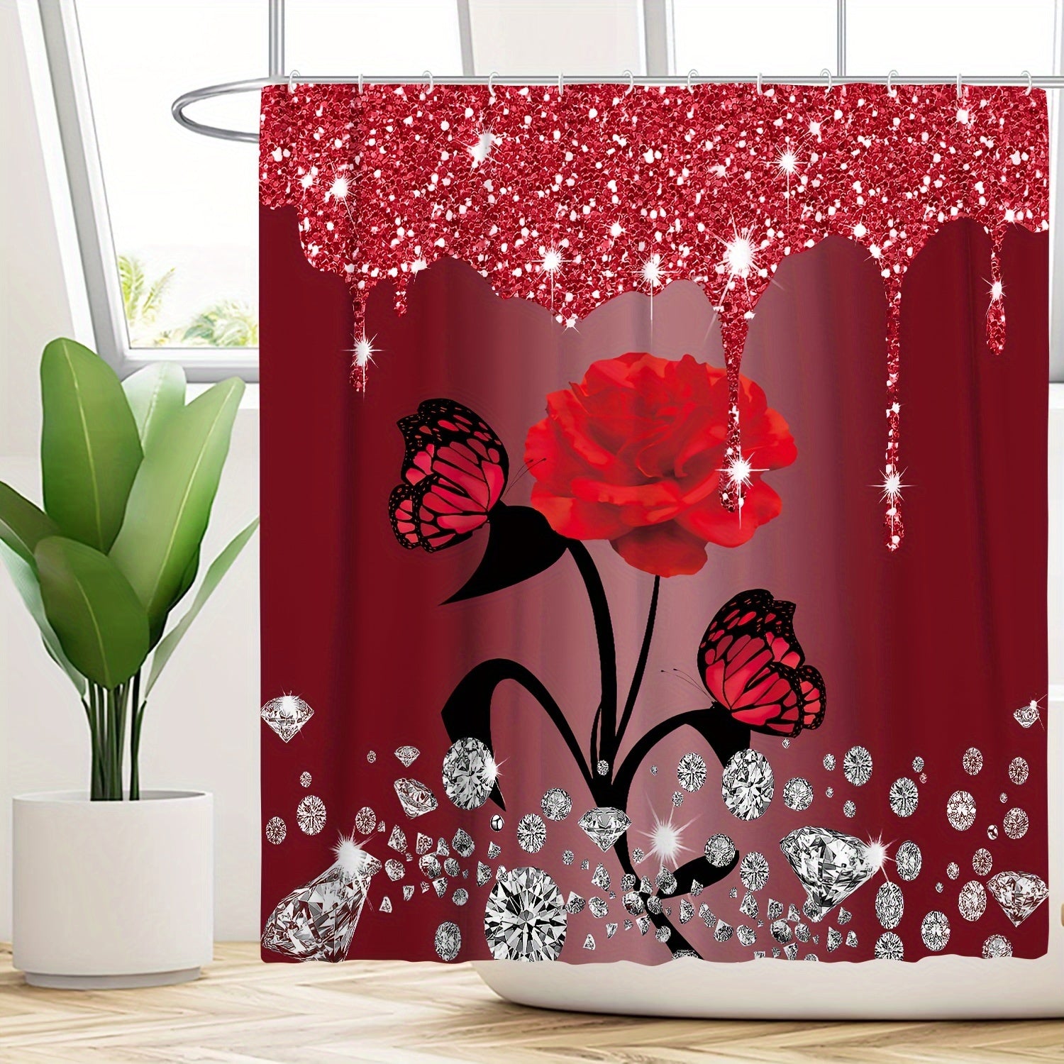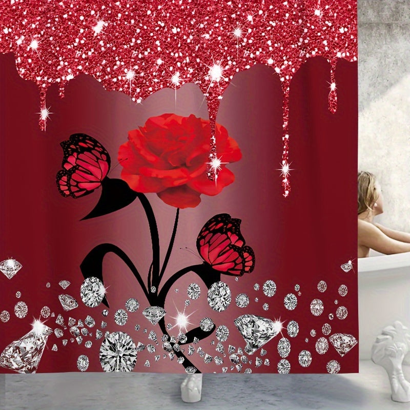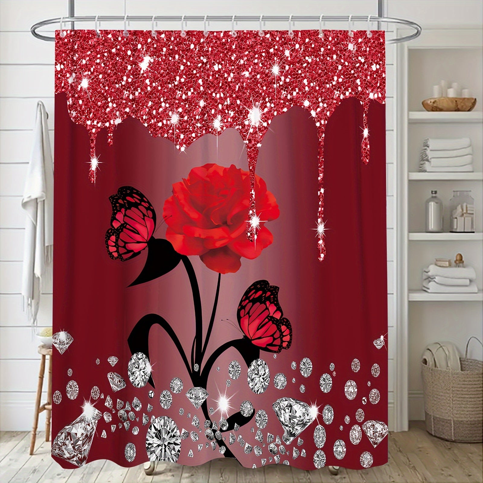 Qizil g'isht toshli kapalak va atirgul dizayni bilan dush pardasi, 1, 3 yoki 4 dona mavjud.