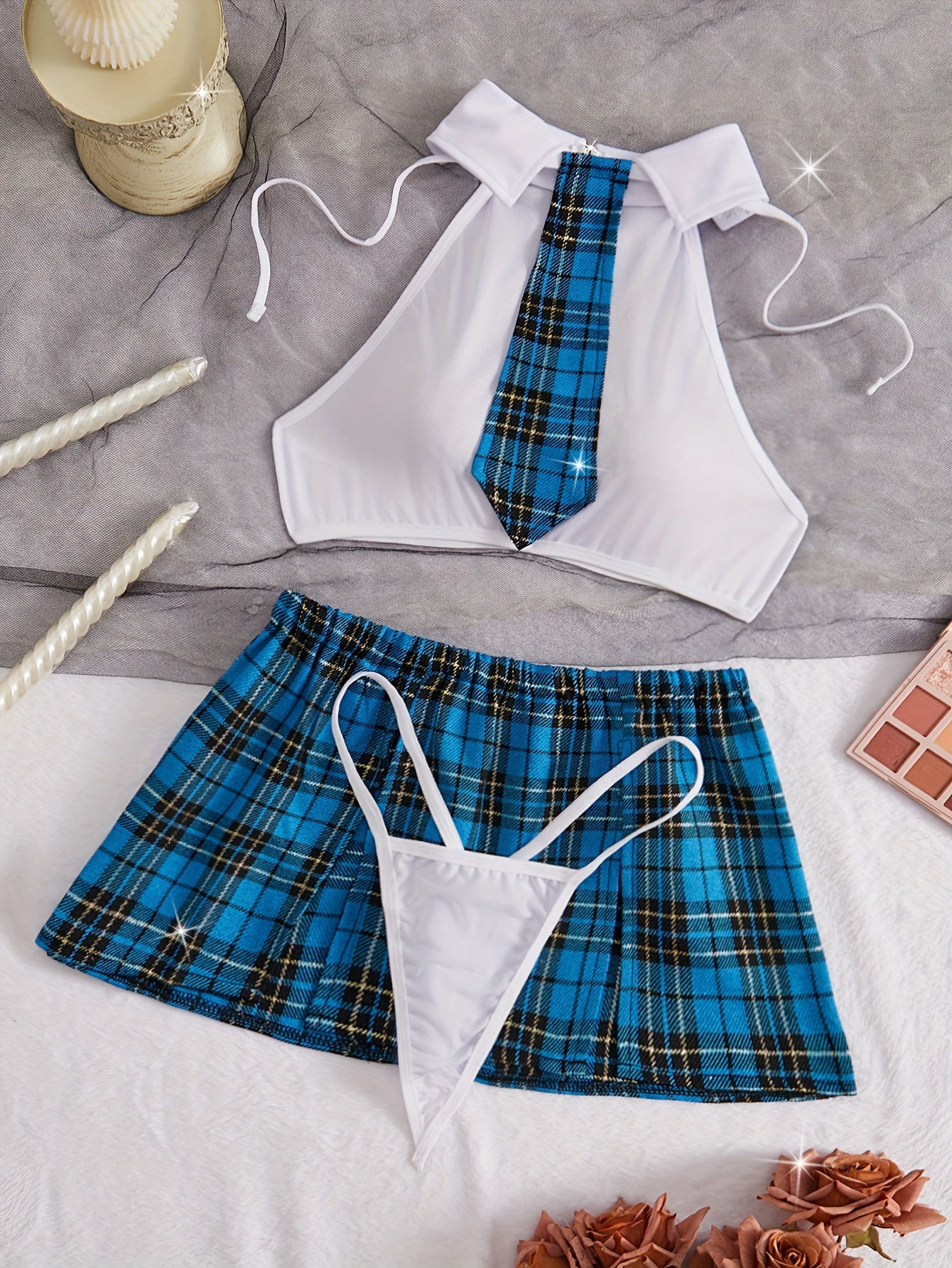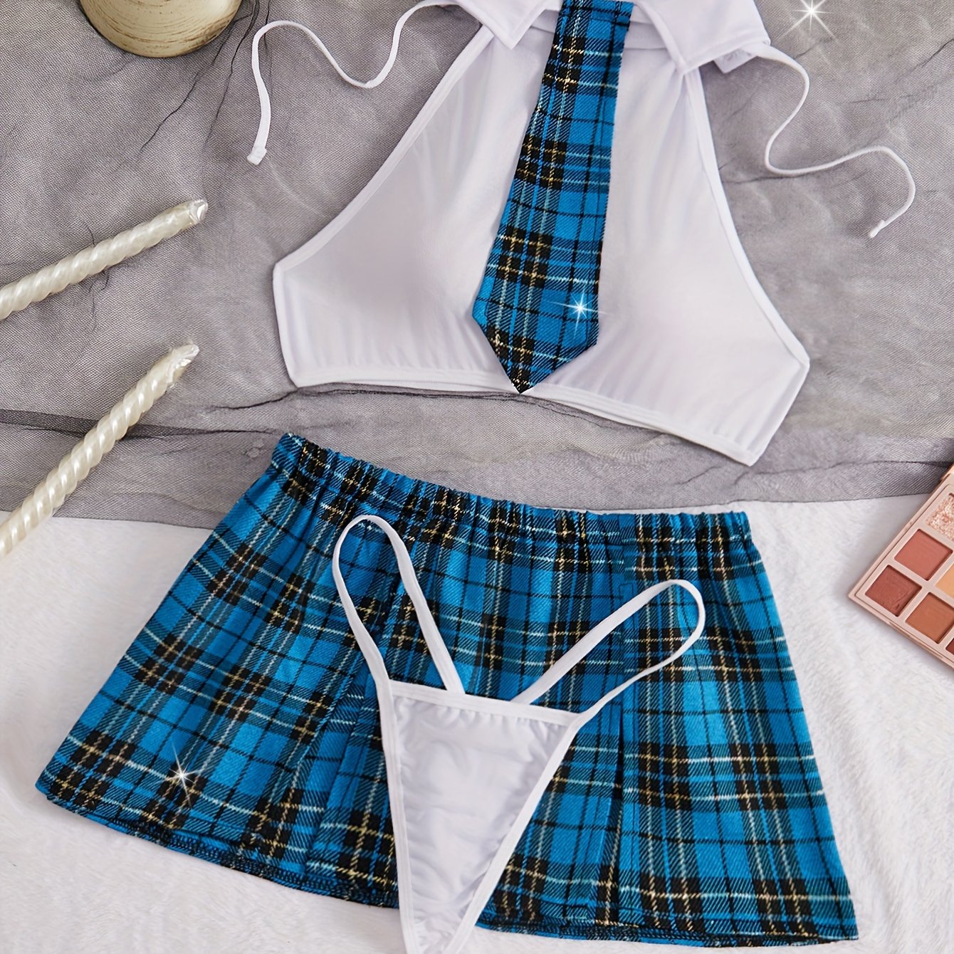 "Yubka, yenglar, forma, ichki kiyim to'plami, yengsiz yuqori, bo'yin bog'ichi, thong va yubka - 4 dona, ayollarning rol o'ynash uchun ichki kiyimlari"