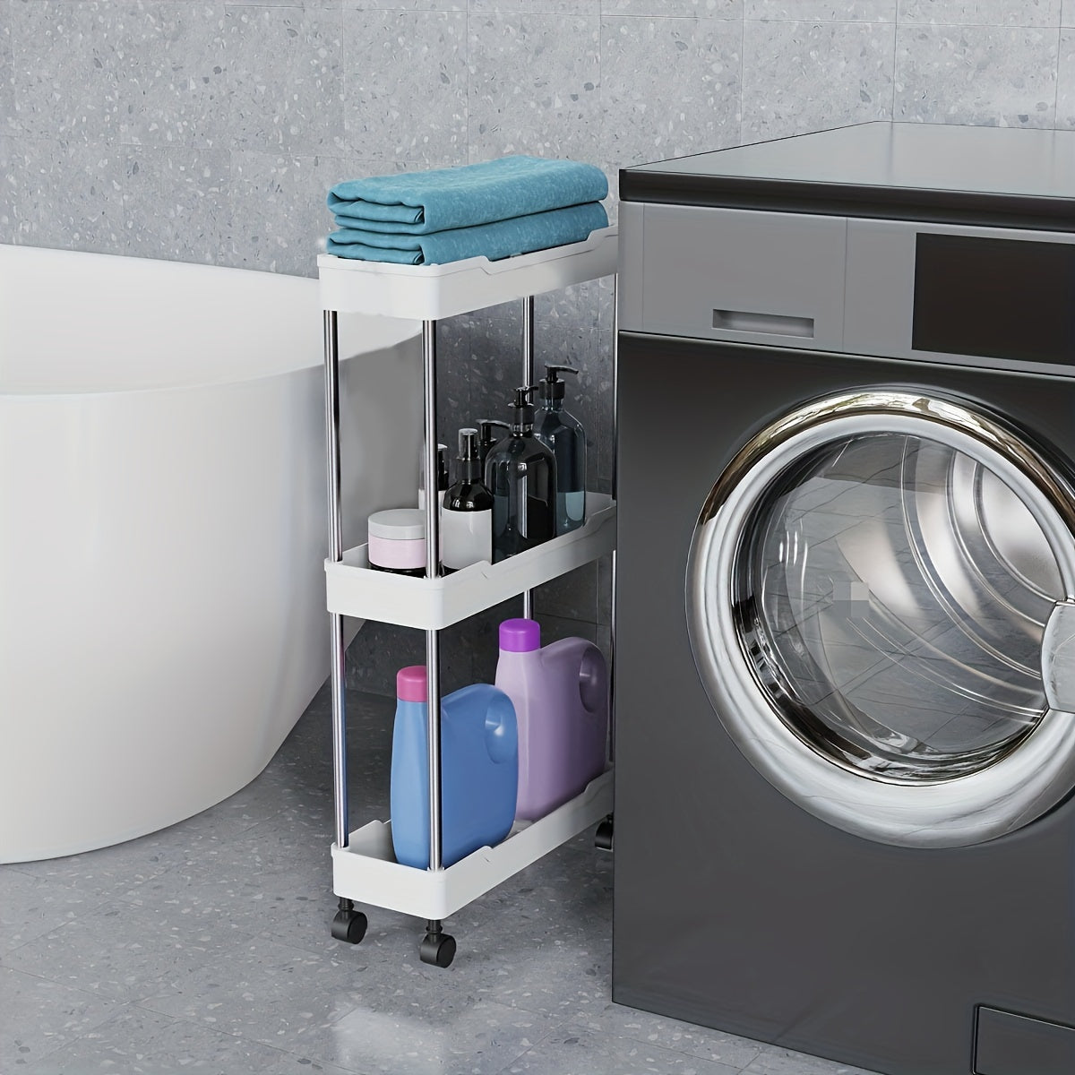 Oq plastikdan yasalgan, oson harakatlanuvchi g'ildiraklari bilan hammom uchun ingichka aylanuvchi saqlash aravachasi. Tor joylar va hammomni tartibga solish uchun mukammal. Zamonaviy saqlash uchun metall qo'llab-quvvatlash ustunlari mavjud.