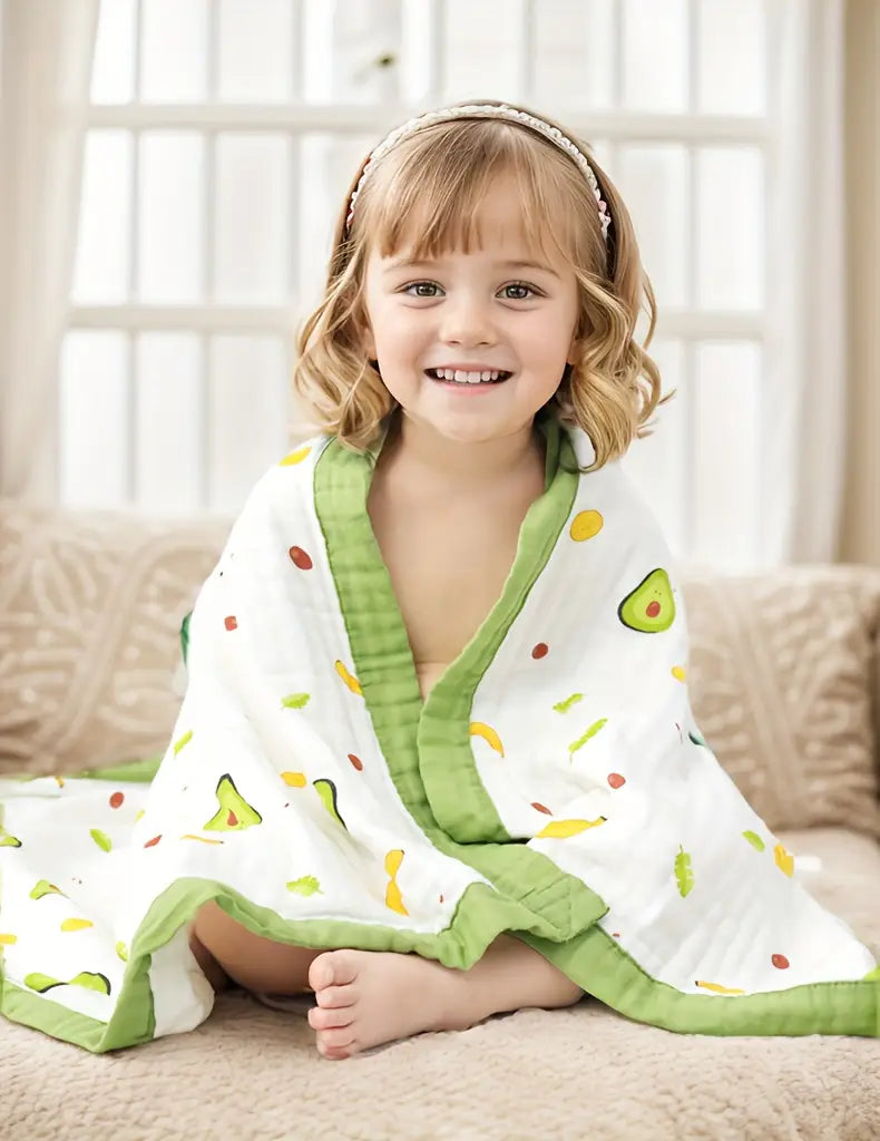 109.22x109.22 sm o'lchamdagi yumshoq paxta bolalar sochiq, multfilm avokado dizayni bilan. Yuqori namni so'rish qobiliyatiga ega, mashinada yuvish mumkin va 0-14 yoshgacha bo'lgan bolalar uchun mos.
