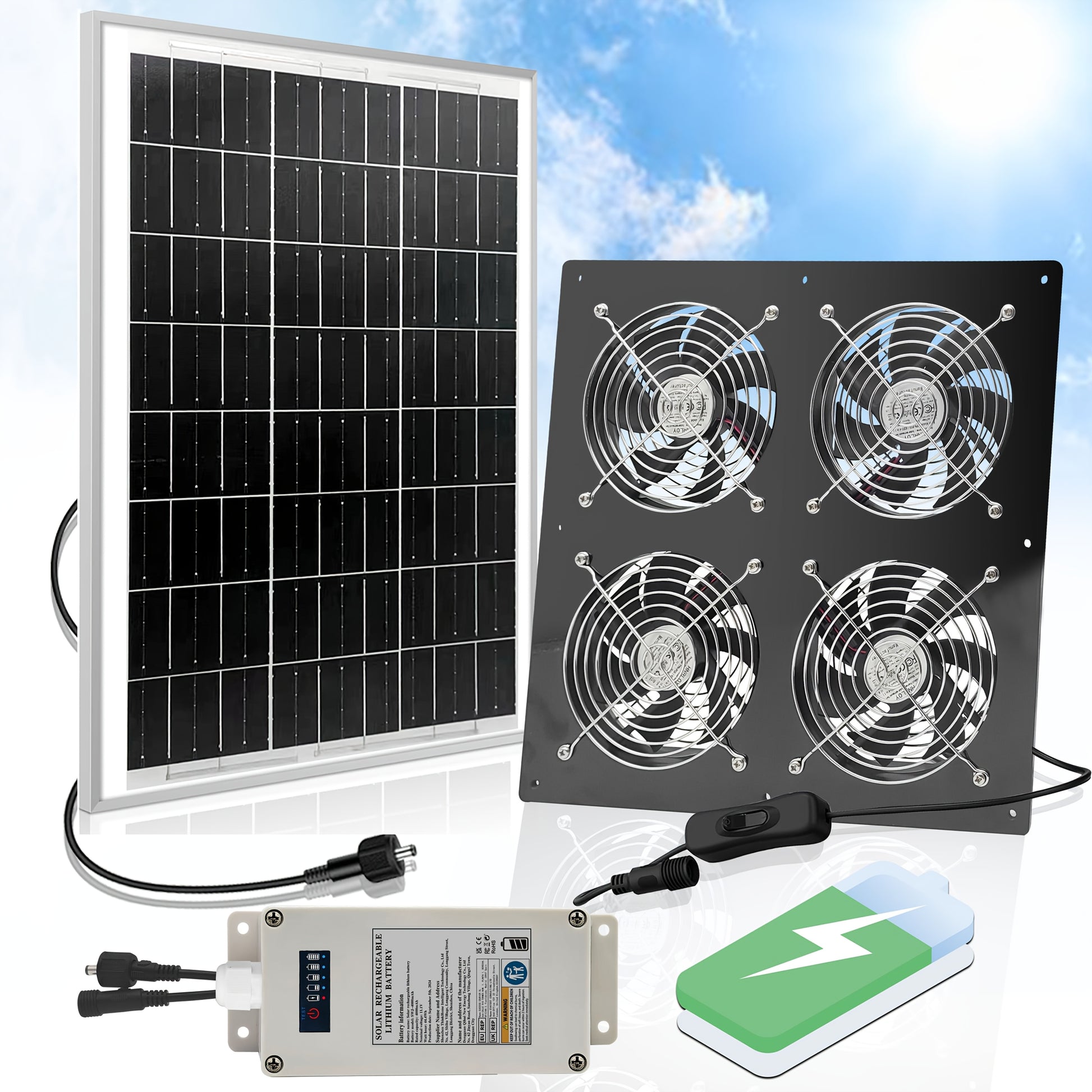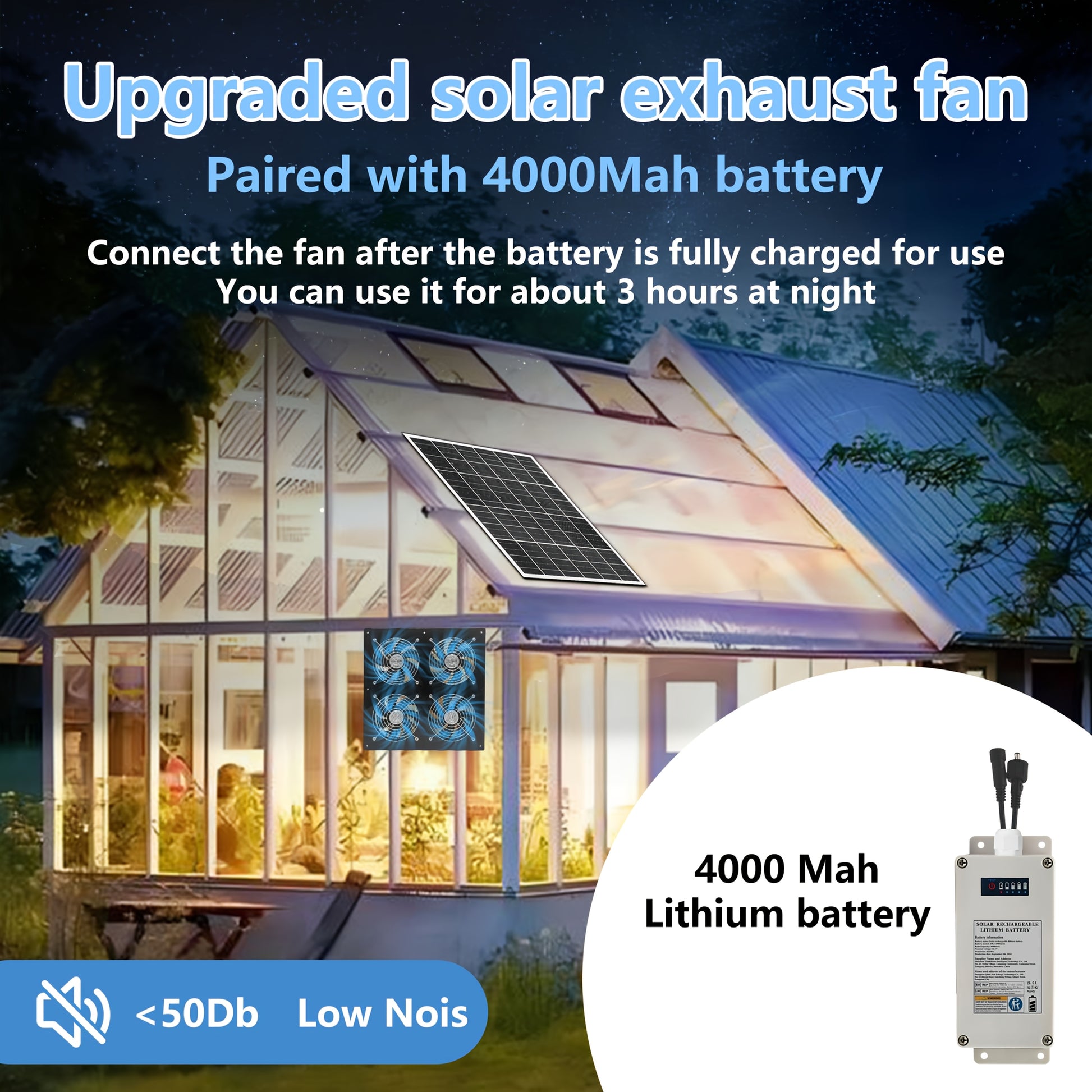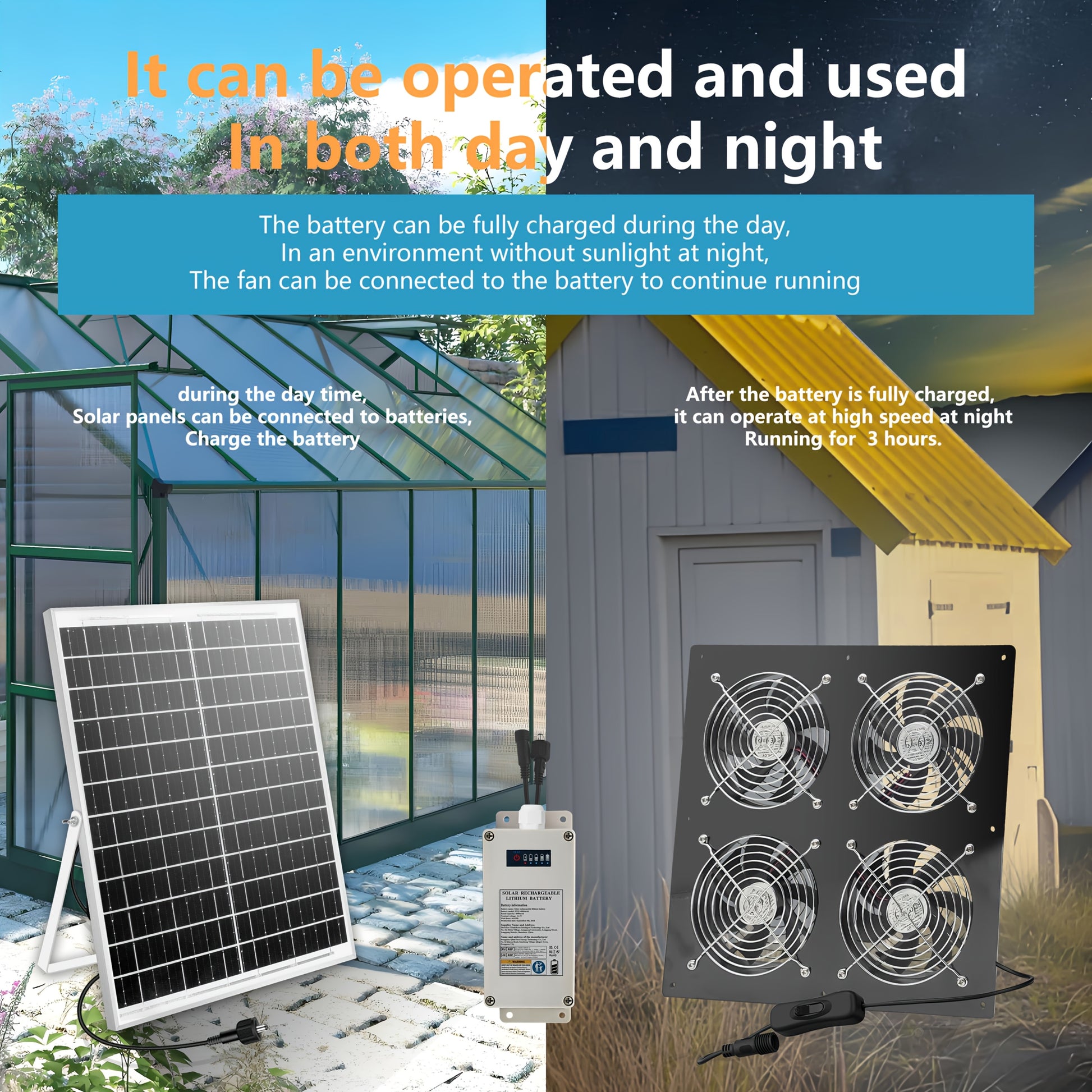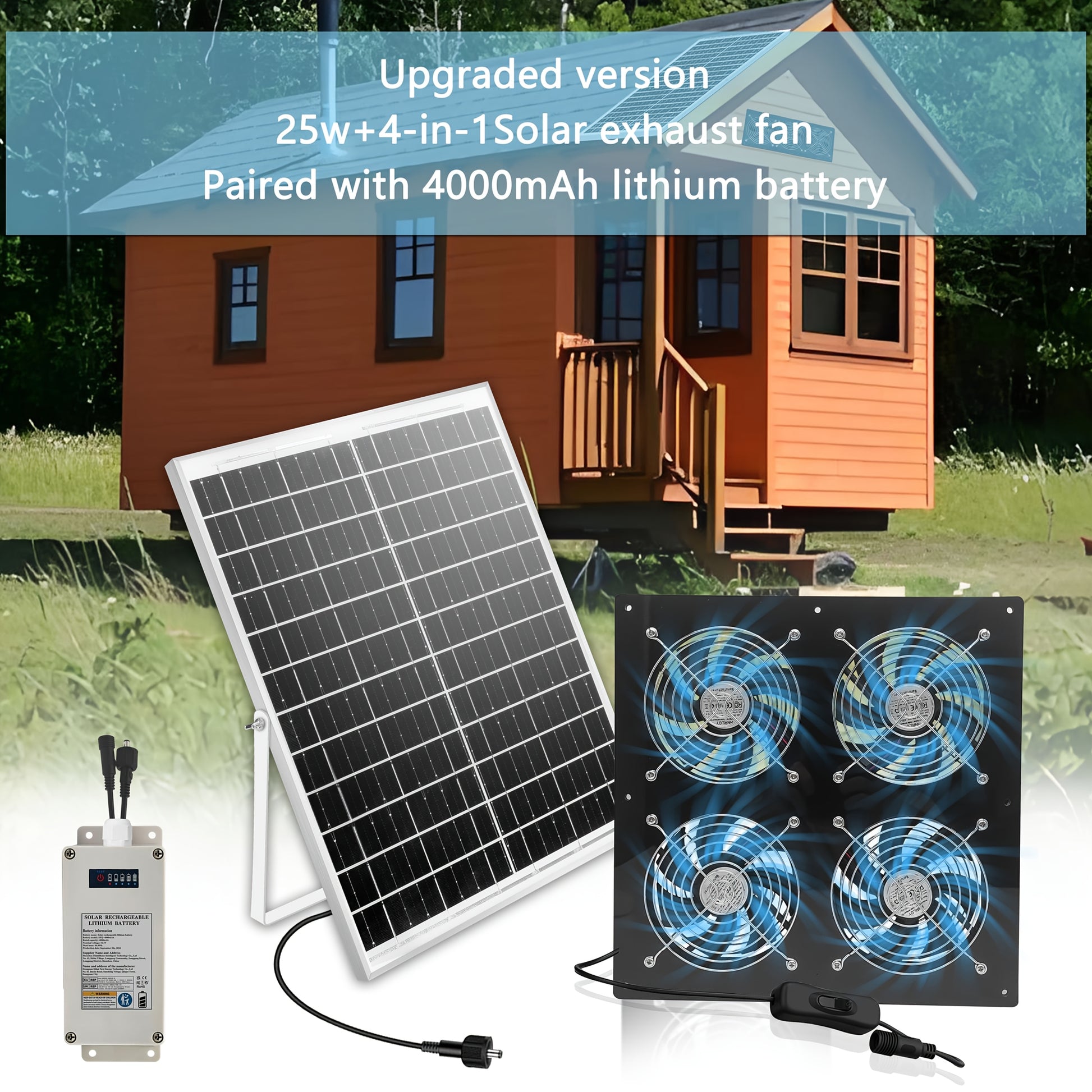 Quyosh energiyasi bilan ishlaydigan 25W ventilyator, litiy batareya bilan, it uylarida, issiqxonalarda va podvalda foydalanish uchun