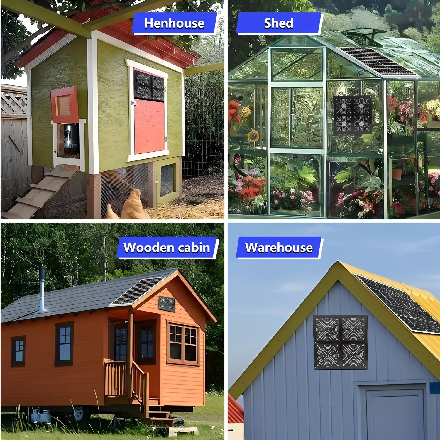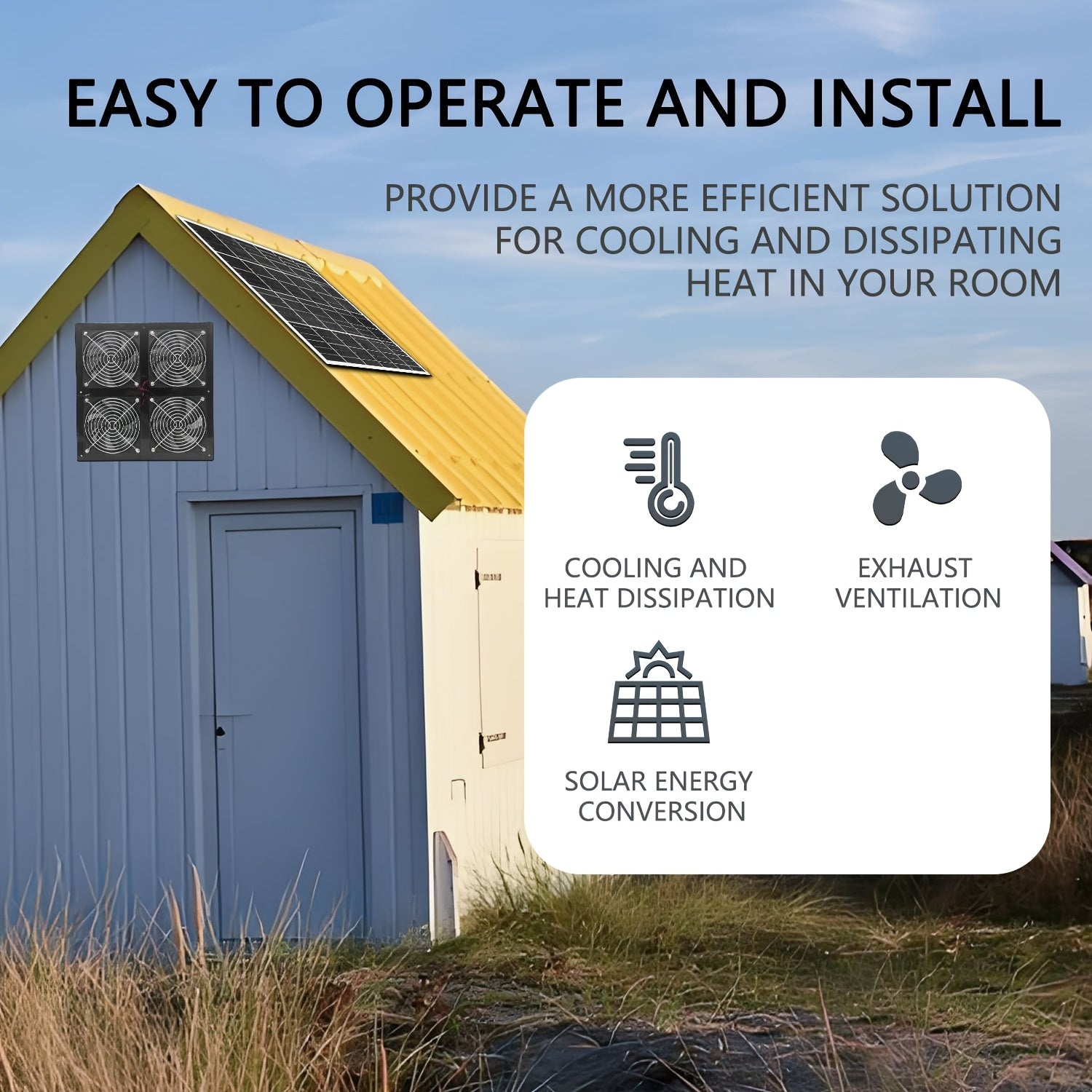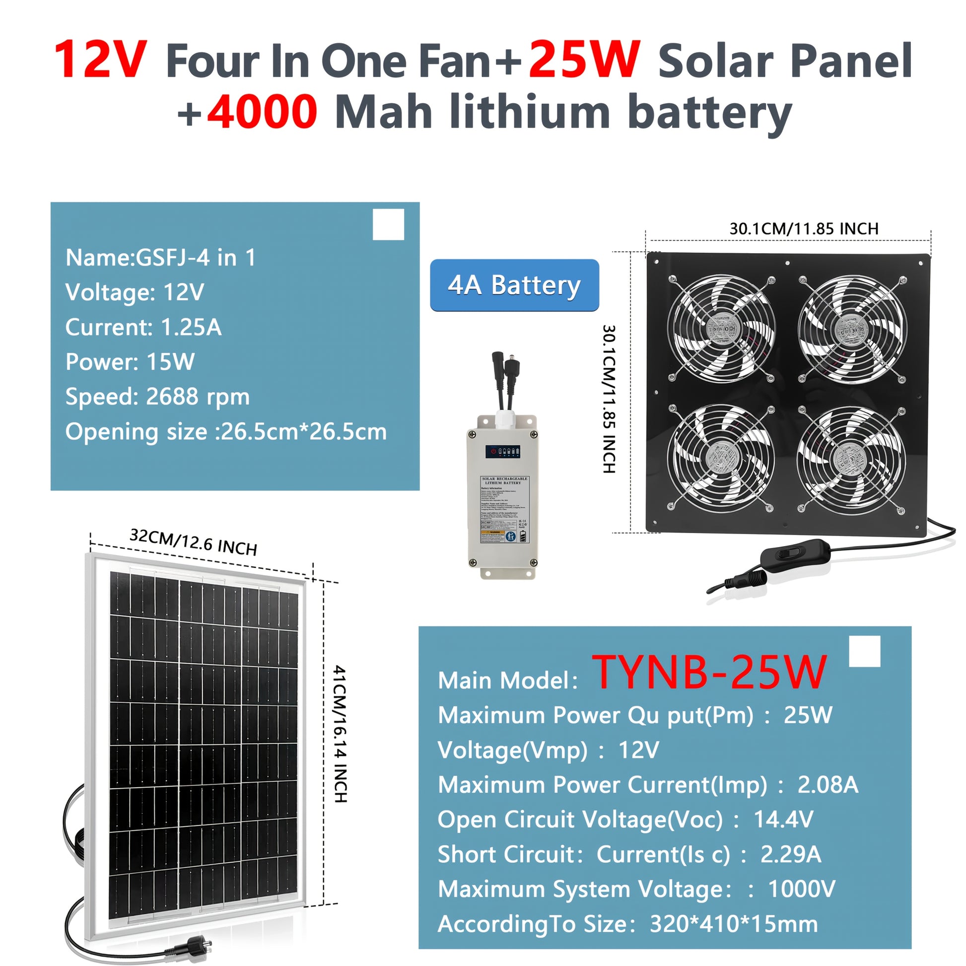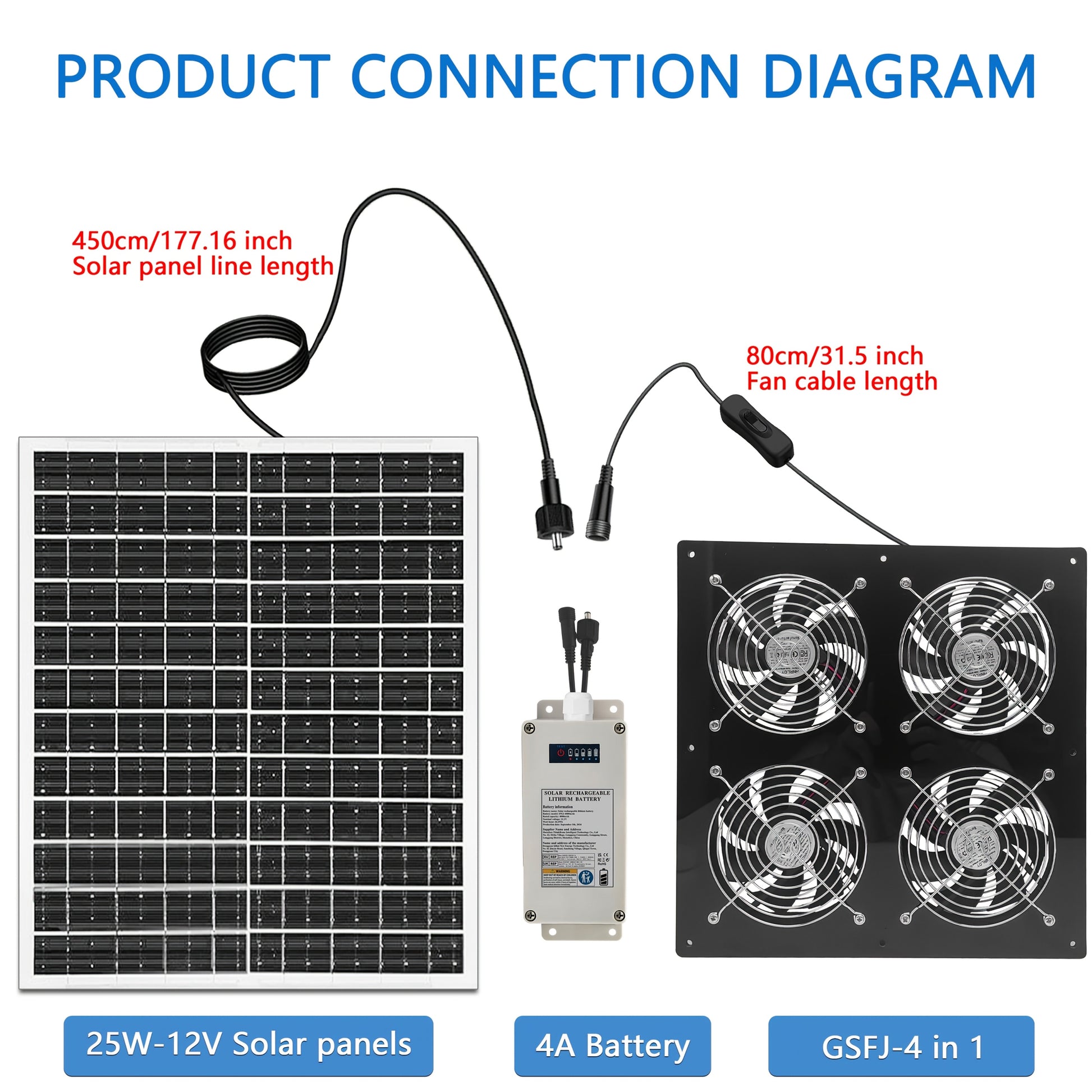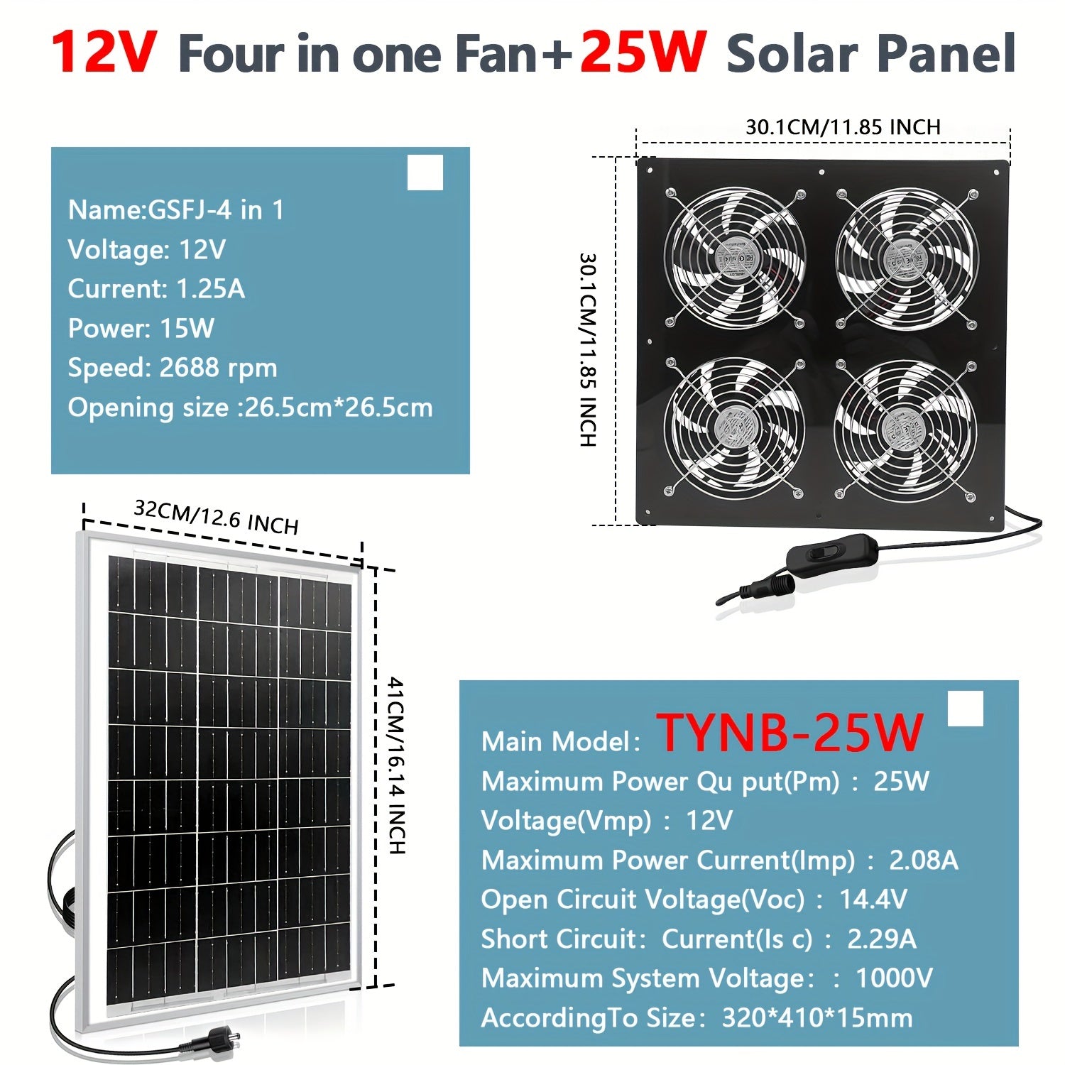 Quyosh energiyasi bilan ishlaydigan 25W ventilyator, litiy batareya bilan, it uylarida, issiqxonalarda va podvalda foydalanish uchun