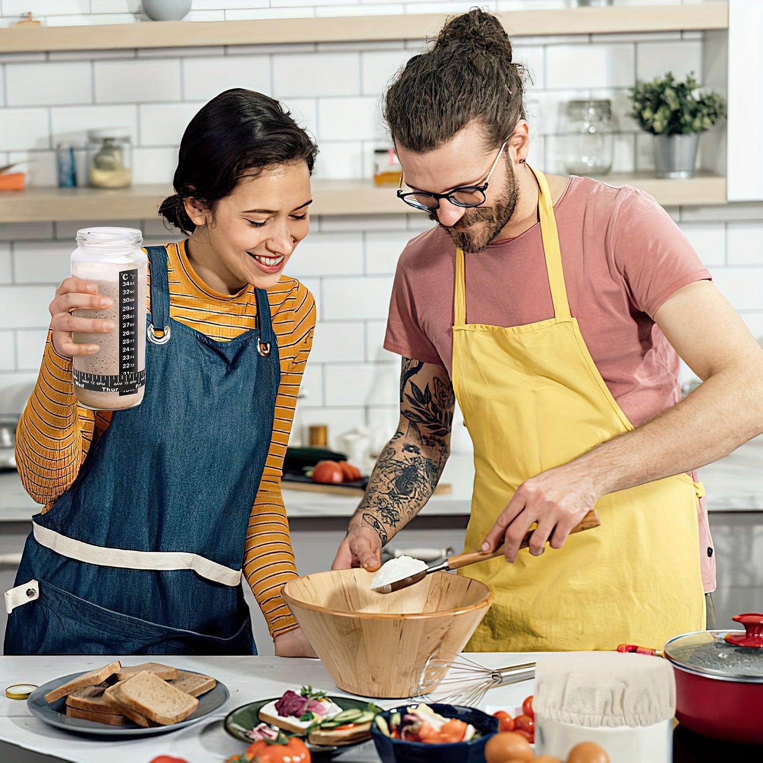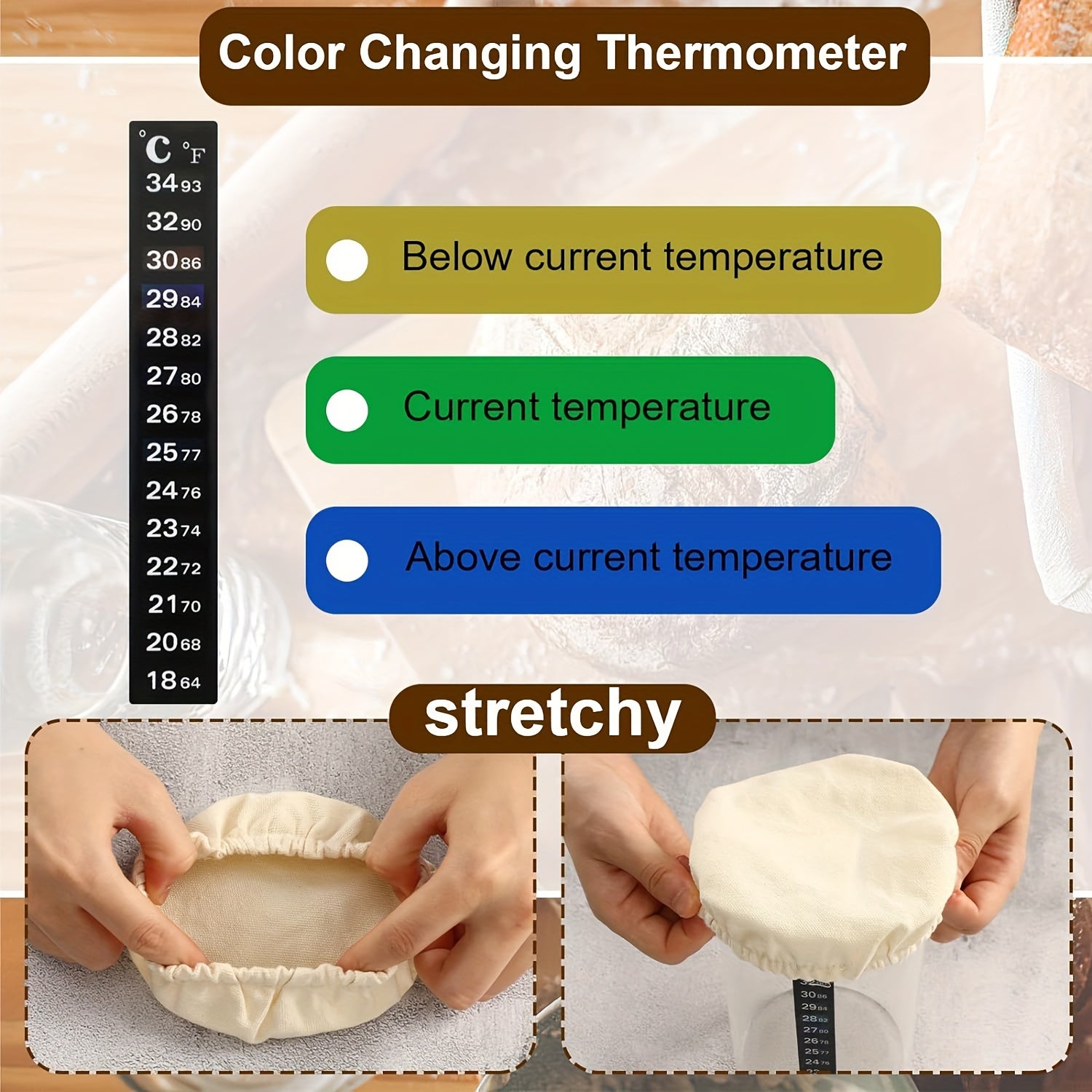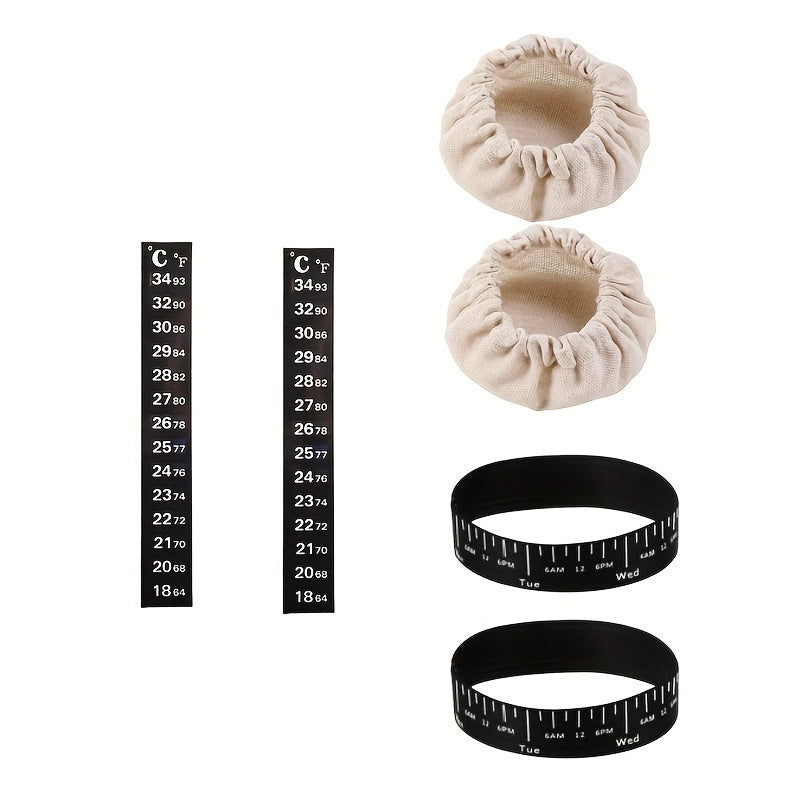 Sourdough Starter Kit to'plamiga mato qopqoq, harorat o'lchagichi va 7.62-10.16 sm idishlar uchun sana belgilagichi kiradi.