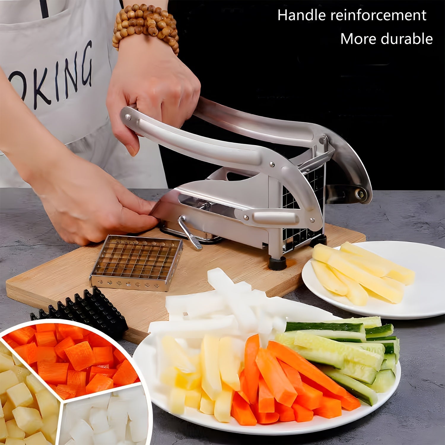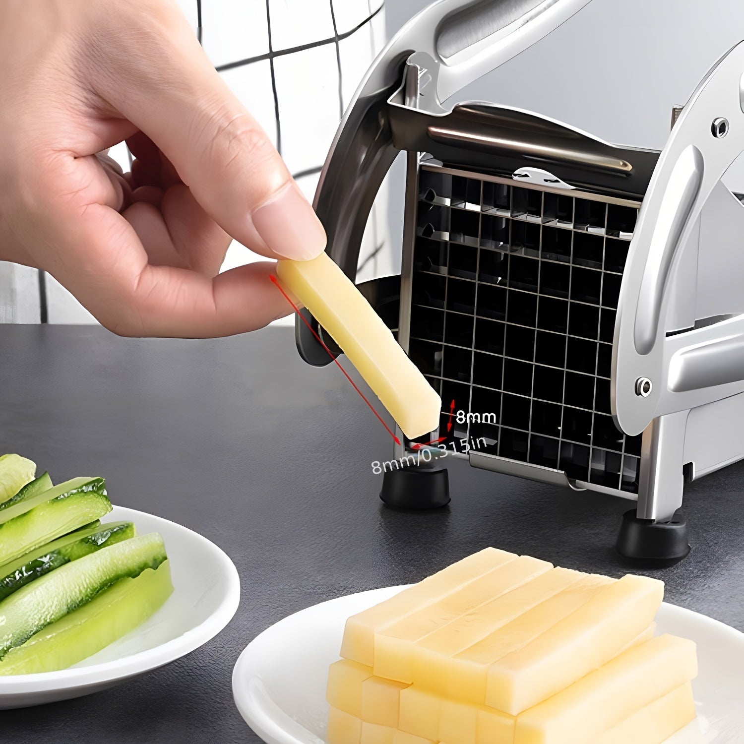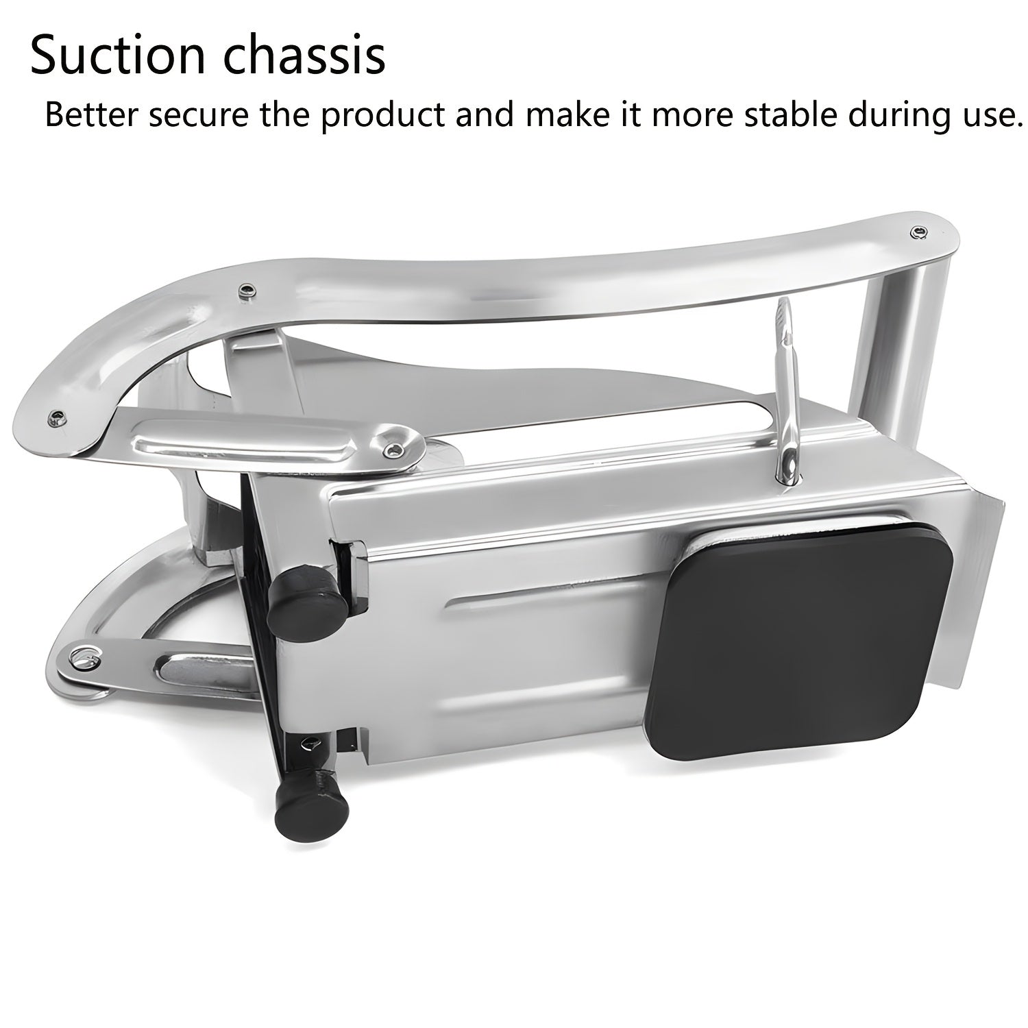 Yaxshilangan dizaynga ega zanglamas po'latdan yasalgan kartoshka kesgichi va oson foydalanish uchun vakuumli asos - uy va professional oshxonalar uchun ko'p maqsadli sabzavot va meva kesgichi