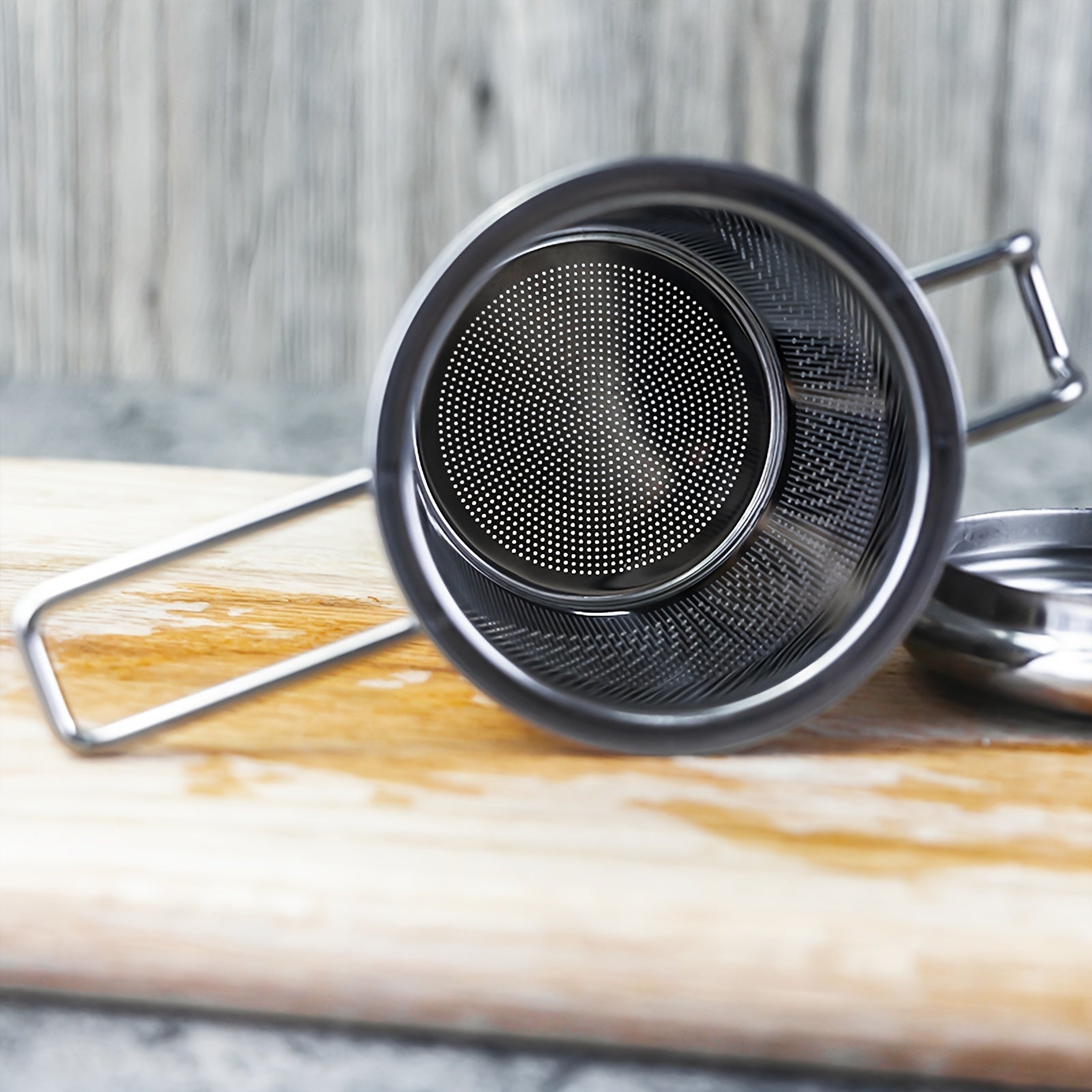 Naychali tutqich va qopqoq bilan zanglamaydigan po'latdan yasalgan choy filtri - bo'sh choy va qahva qoldiqlari uchun ko'p maqsadli choy to'kmasi, issiqlikdan himoya dizayni bilan.