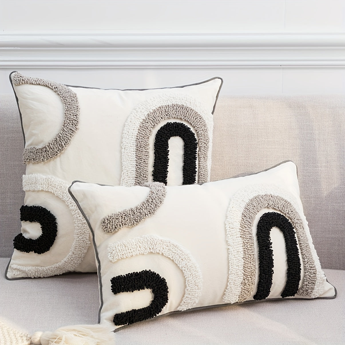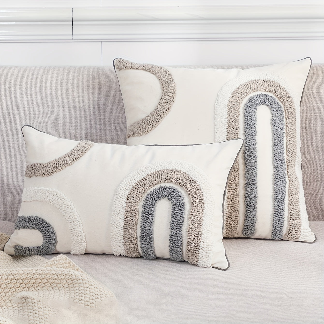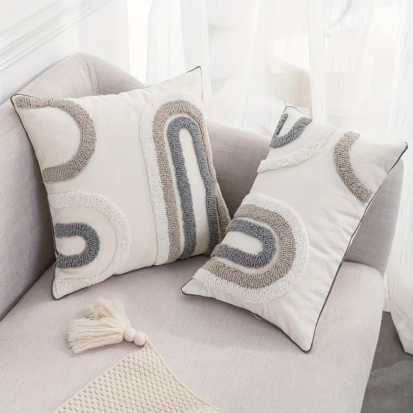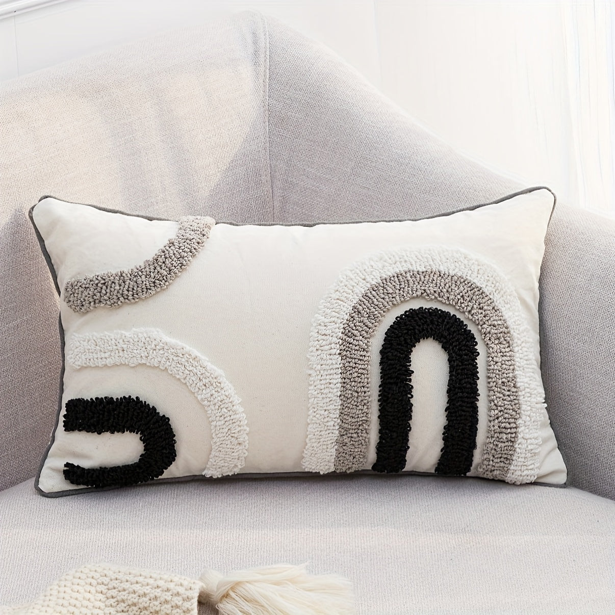 Skandinaviya bohem uslubida chiziqli U-shaklidagi yostiq qopqog'i, yotoqxona va yashash xonasi divan yostiqlari uchun velur qirralar bilan tayyorlangan.