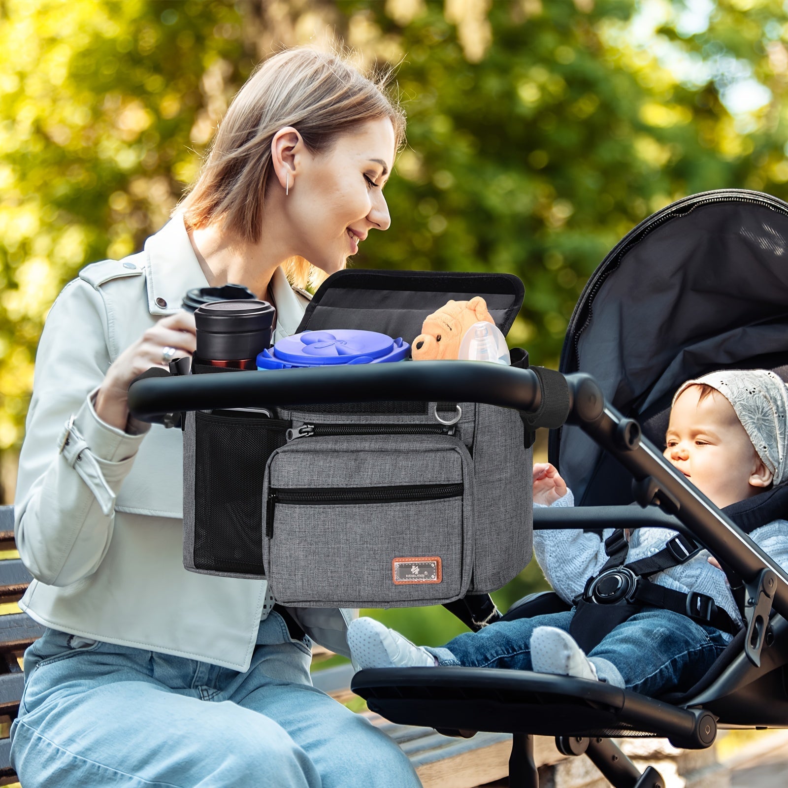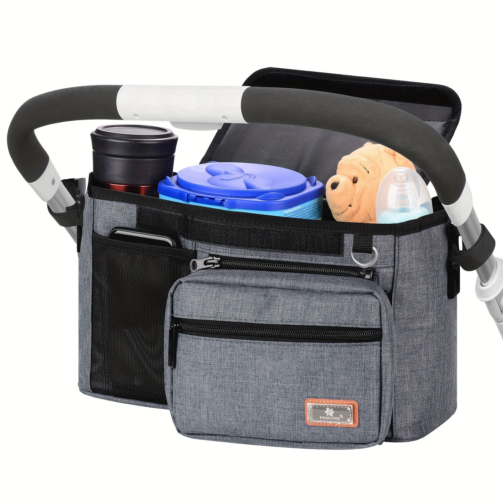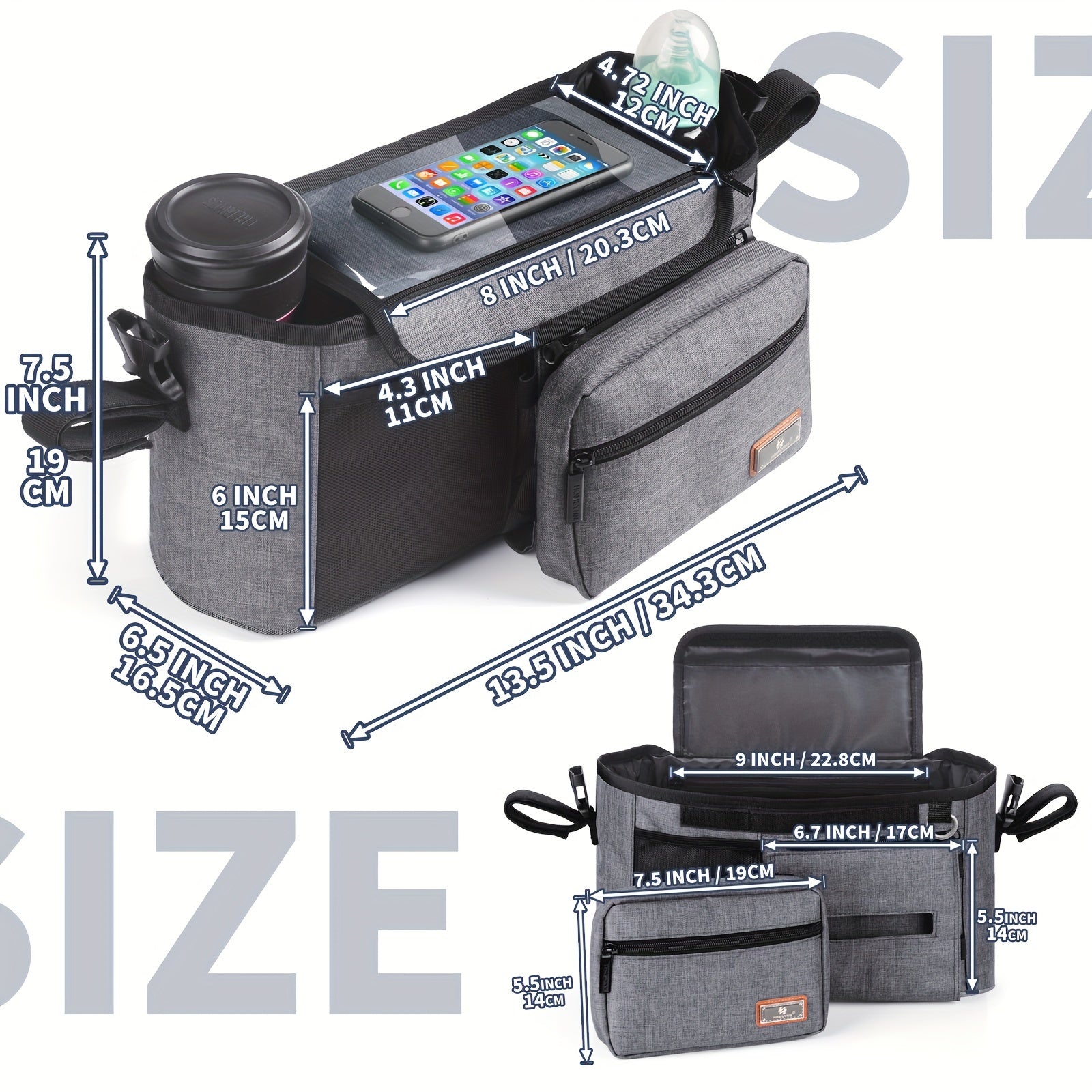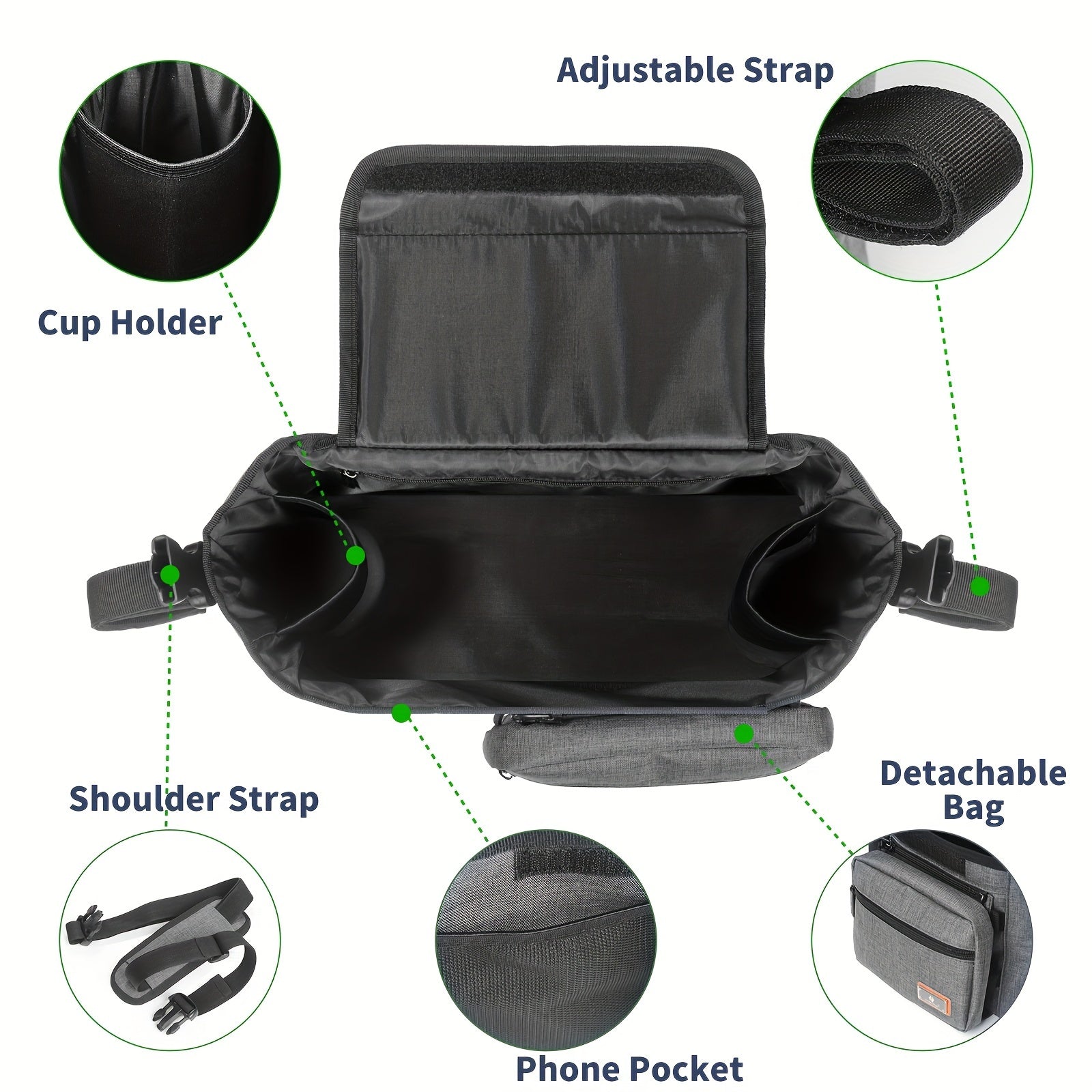 Ajratiladigan fermuarlı sumka, salfetkalar uchun joy, telefon cho'ntagi, shisha ushlagich va yelka tasmalari bilan aravachalar uchun tashkilotchisi - yuguruvchilar va aravacha qoplari uchun ideal, aksessuarlarni tartibga solish uchun mukammal.