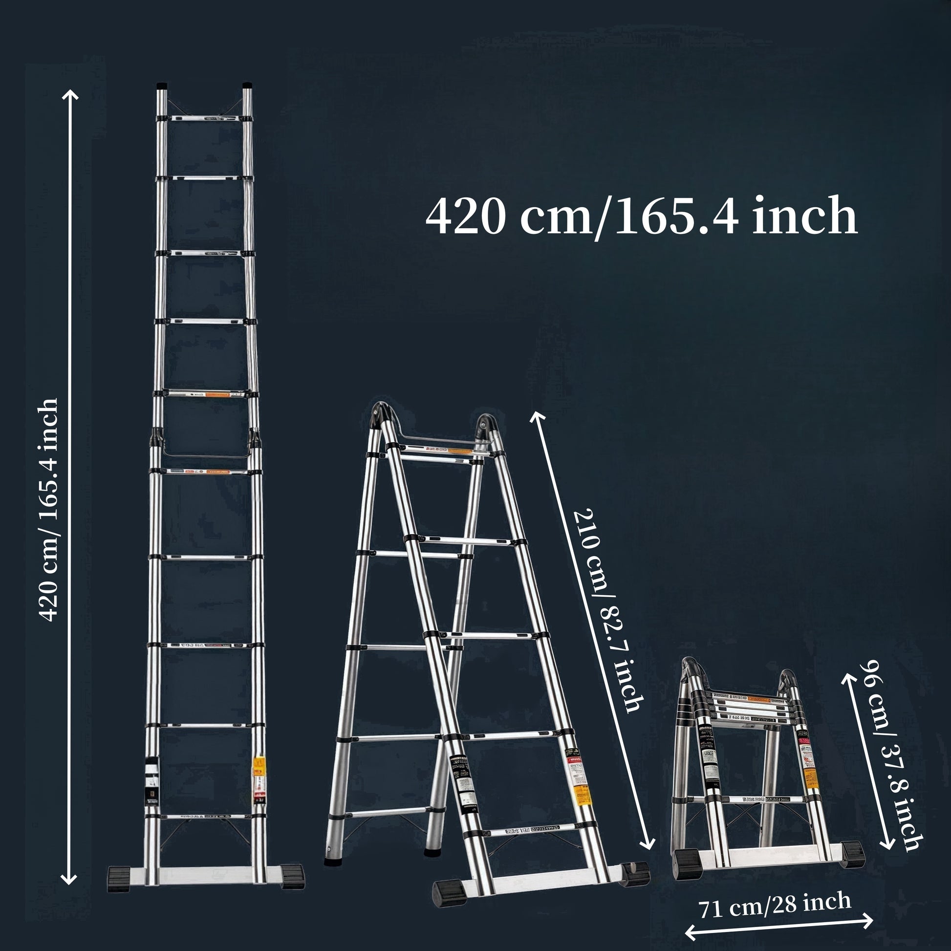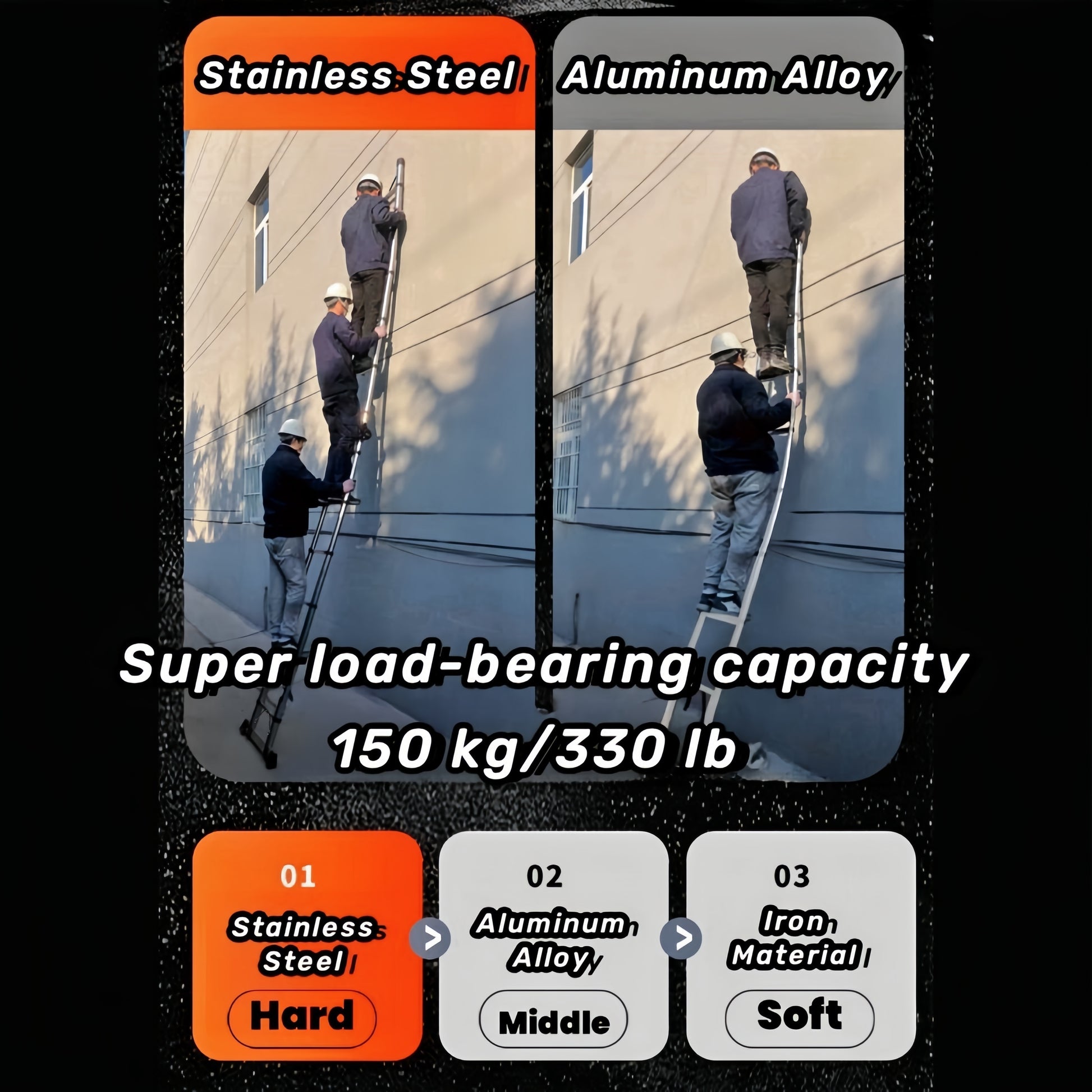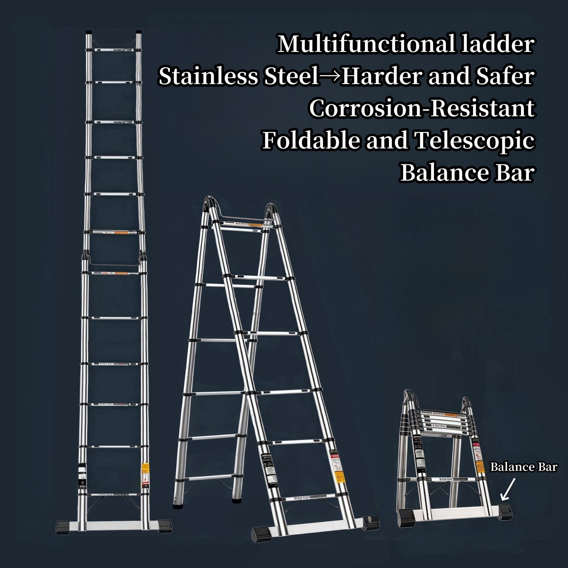 Mustahkam zanglamas po'latdan yasalgan egiluvchan zinapoya, muvozanat barasi bilan, 149.69KG yuk ko'tarish qobiliyati. Tashqi va ichki foydalanish uchun juda yaxshi.