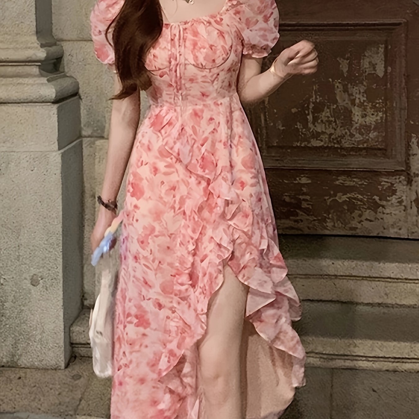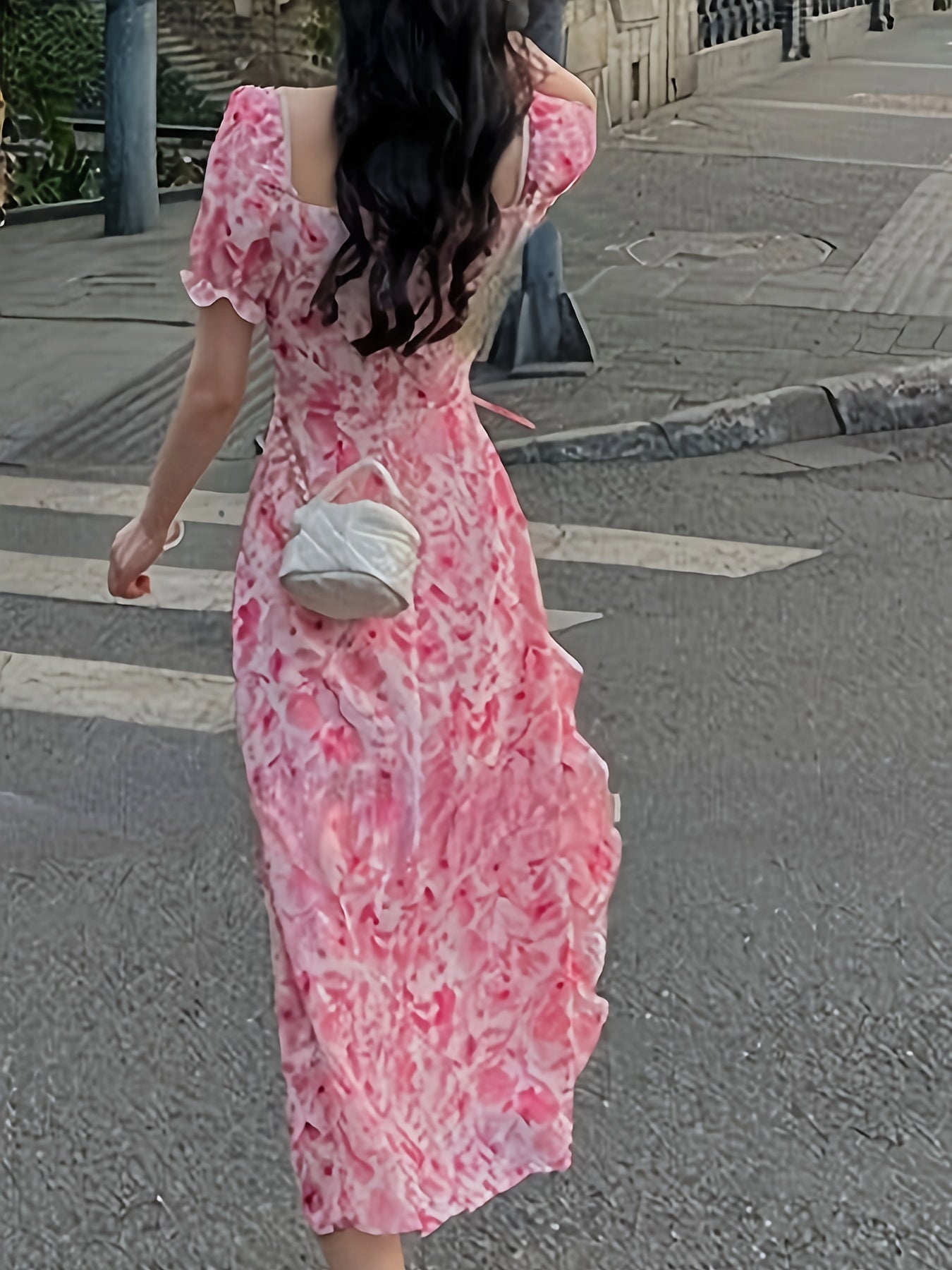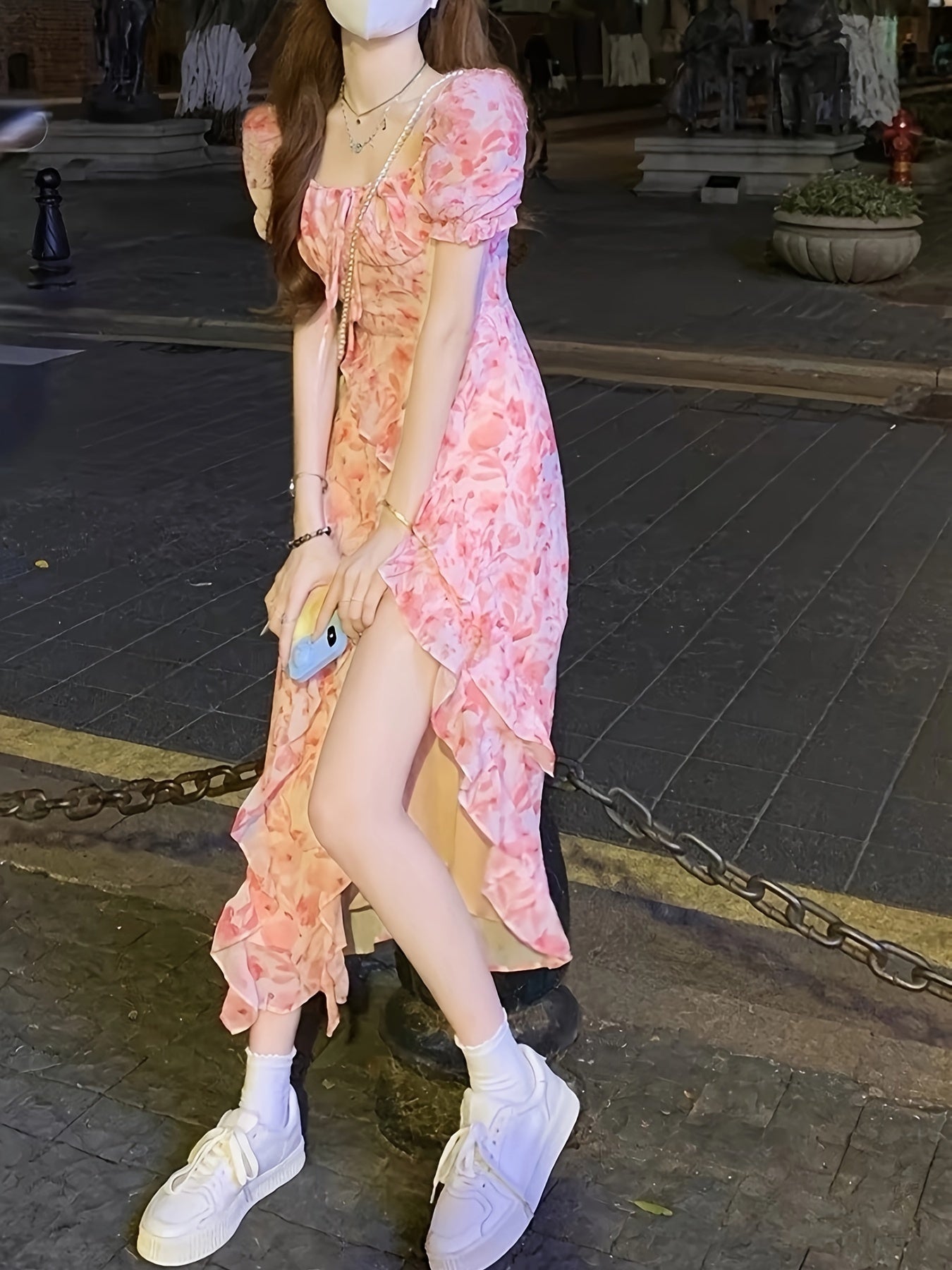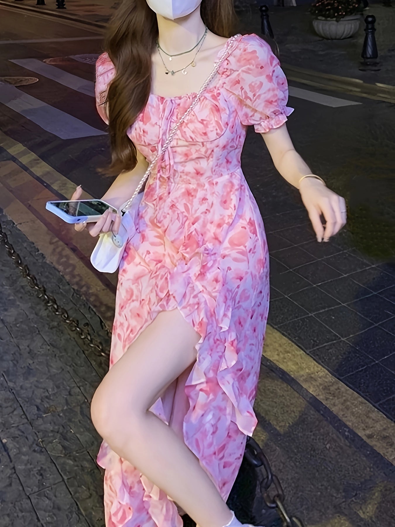 Zarif 1 dona gullar printi bilan bezatilgan ko'ylak, qirralari qiyshiq, cho'ntakli bo'yi va to'qilgan mato aralashmasi, Bahor/Yoz uchun mukammal.