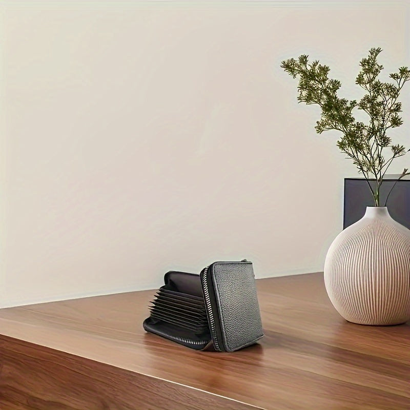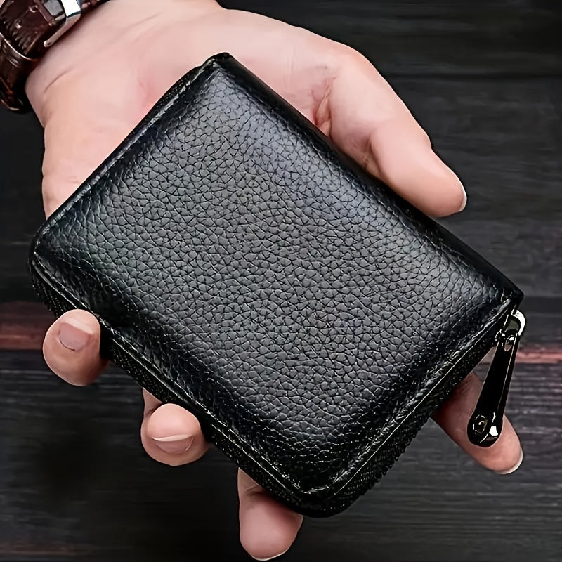 Erkaklar uchun zamonaviy qora sun'iy charm hamyon, xavfsiz zipli tangalar cho'ntagi va shaffof karta bo'limlari bilan. Har kuni foydalanish uchun mukammal.