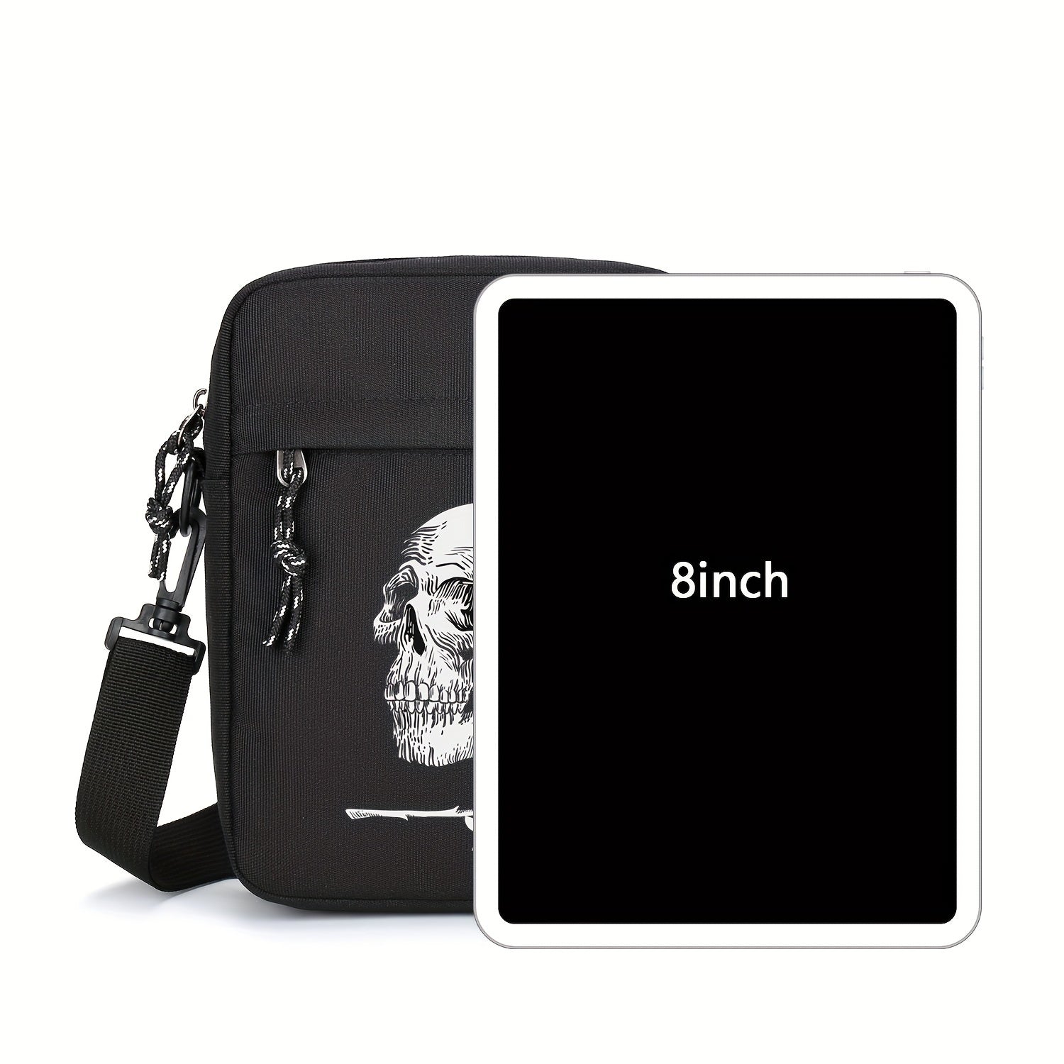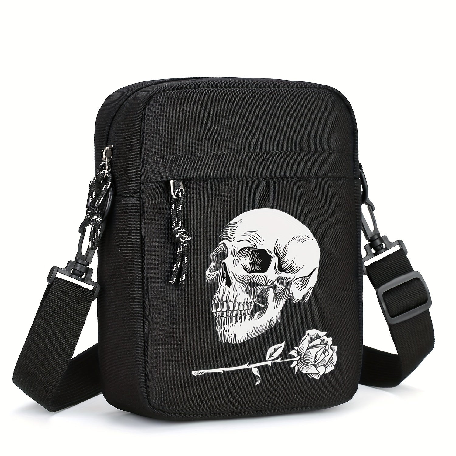 Erkaklar va ayollar uchun qora Oxford matodan yasalgan sumka, bosh suyagi va gül printli, katta sig'imli, sozlanadigan kamar bilan