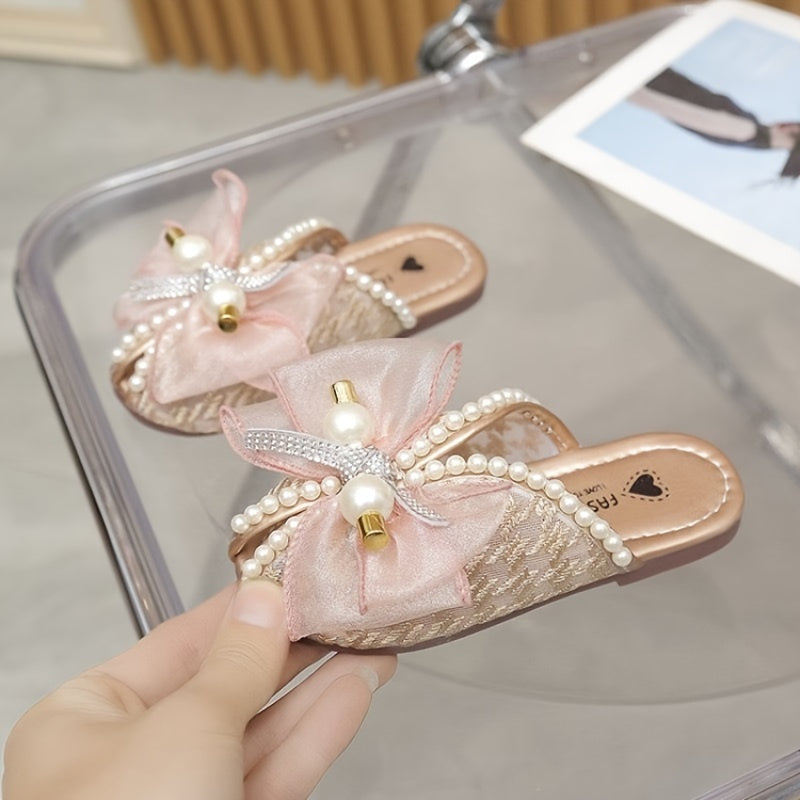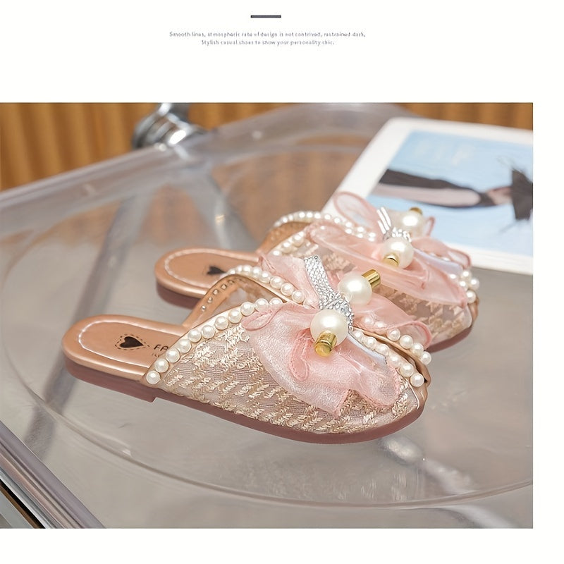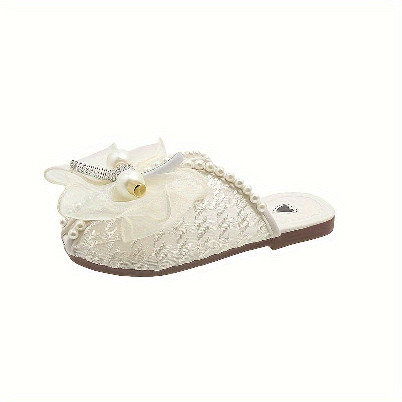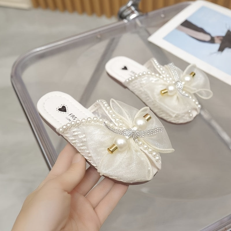 Qizlar uchun zamonaviy kamon tugmachali marvaridli ochiq barmoqli uy poyabzallari, yengil va havo o'tkazuvchi, ichki kiyish uchun.