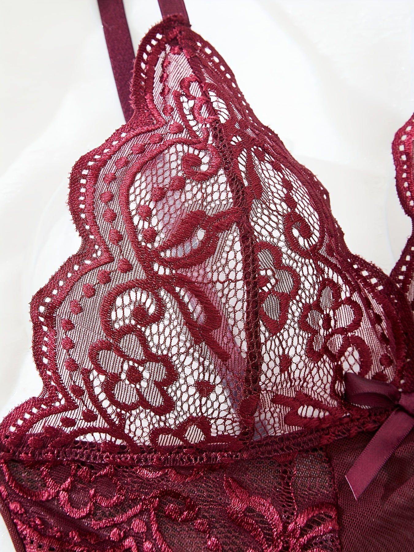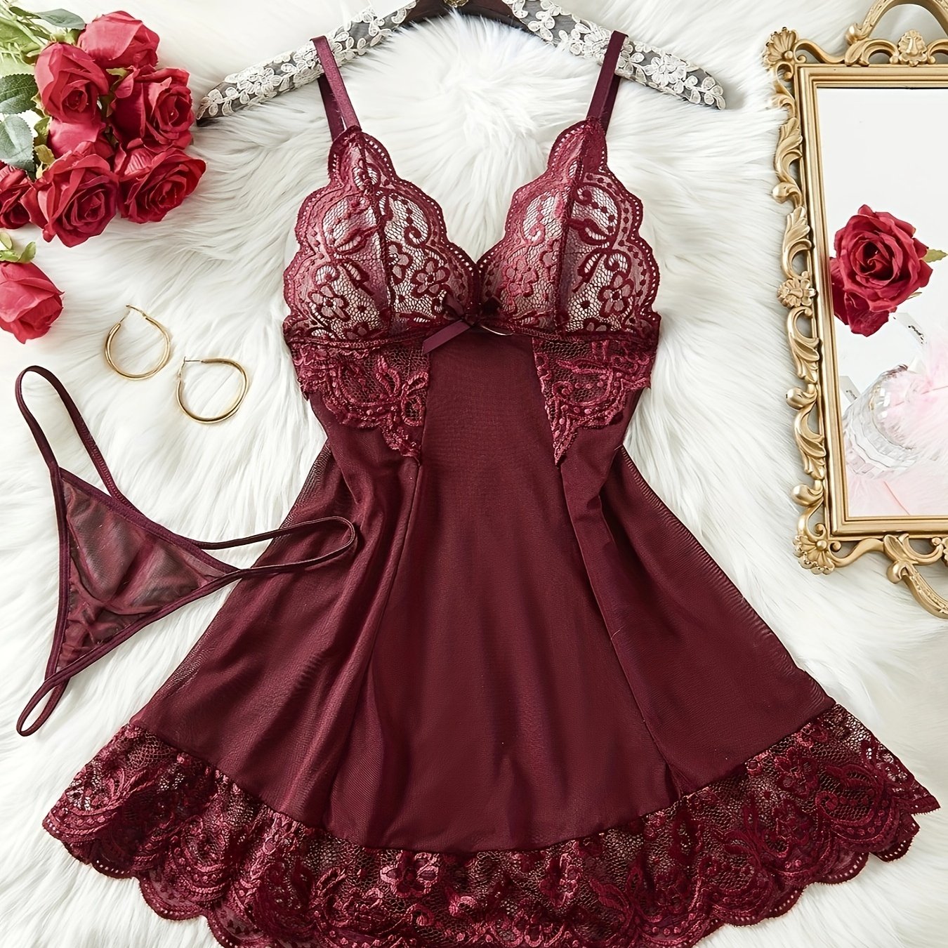 Ayollar uchun zamonaviy burgundi rangidagi dantelli ichki kiyim to'plami chuqur V-shaklidagi slip ko'ylak va thongdan iborat. Dantelli tafsilotlar bilan yarim shaffof polyesterdan tayyorlangan. Qo'l bilan yuvish mumkin.