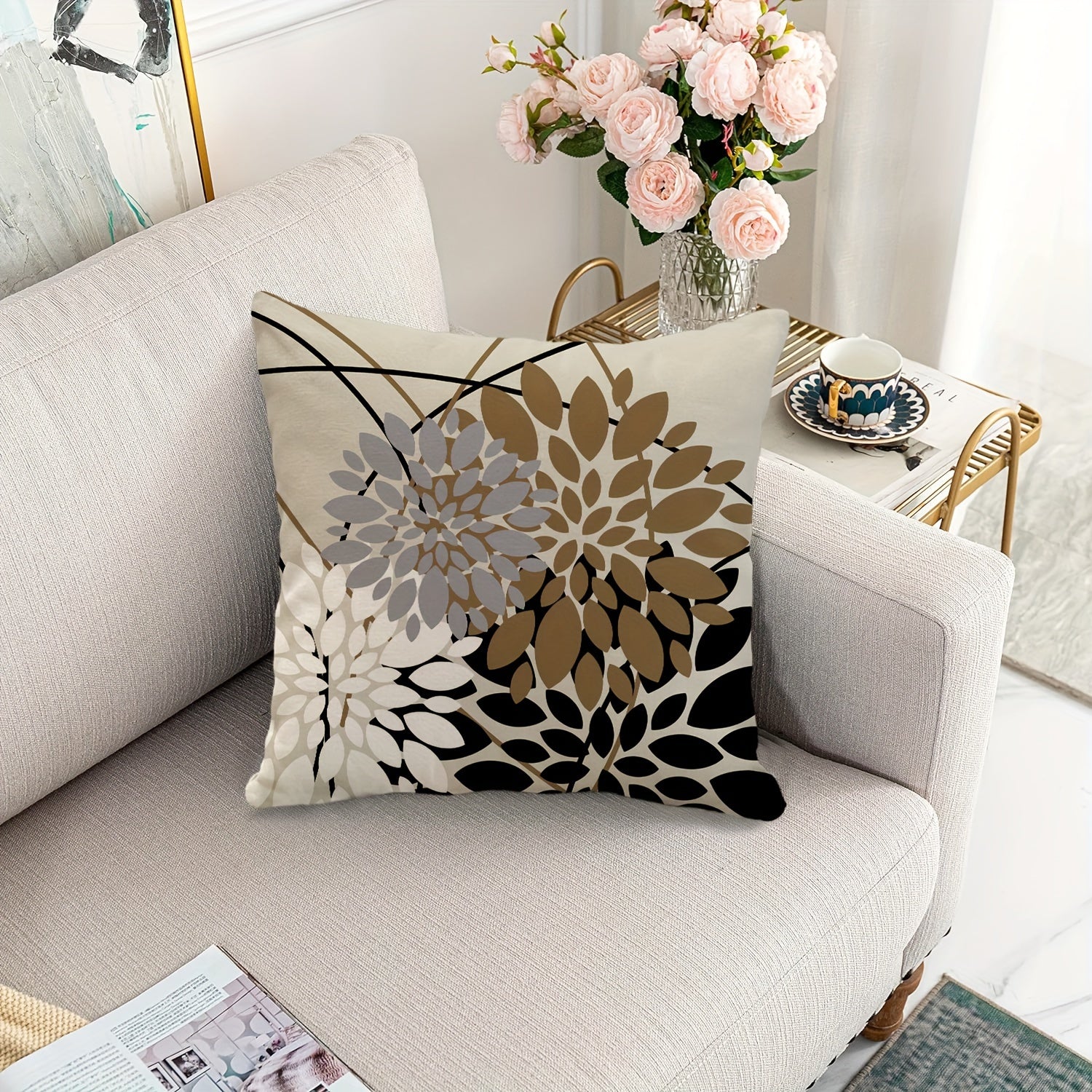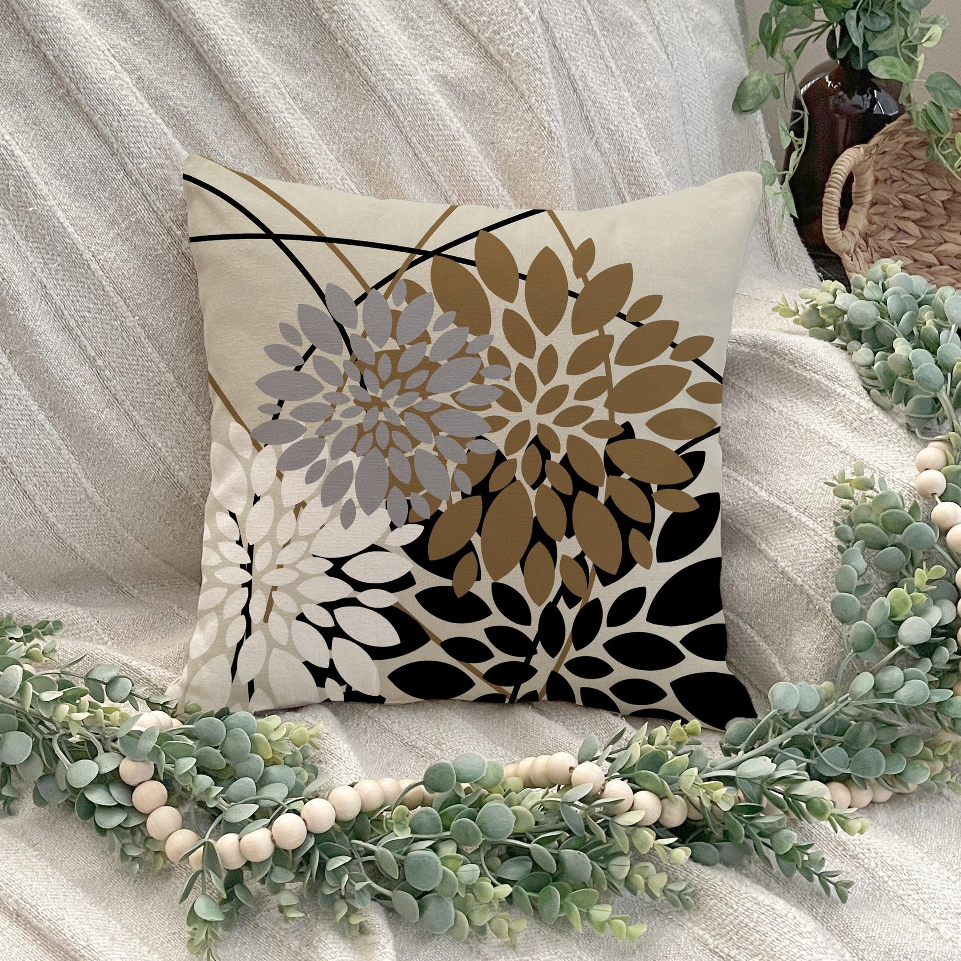 Dahlia gullari yostiq qoplami Qora jigarrang Zamonaviy fermacha bezaklari Sofaga yotadigan yostiq Polyester