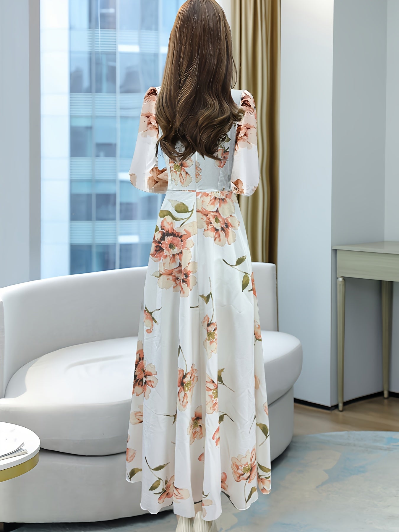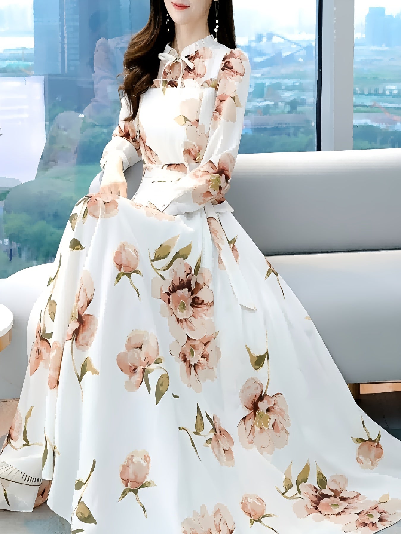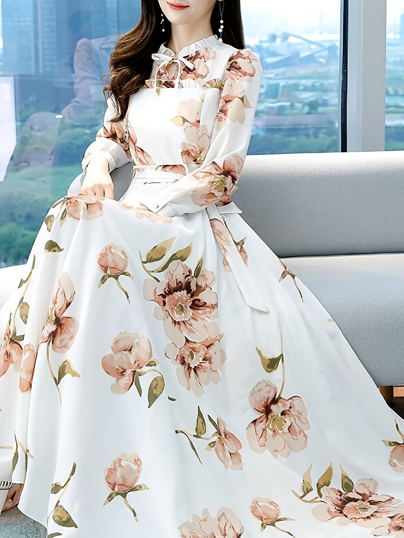 V-yuqori, pliseli bel va uzun oqayotgan yubka bilan bezatilgan zamonaviy gullar bilan A-siluetli ko'ylak, mashinada yuvish mumkin bo'lgan polyesterdan tayyorlangan.
