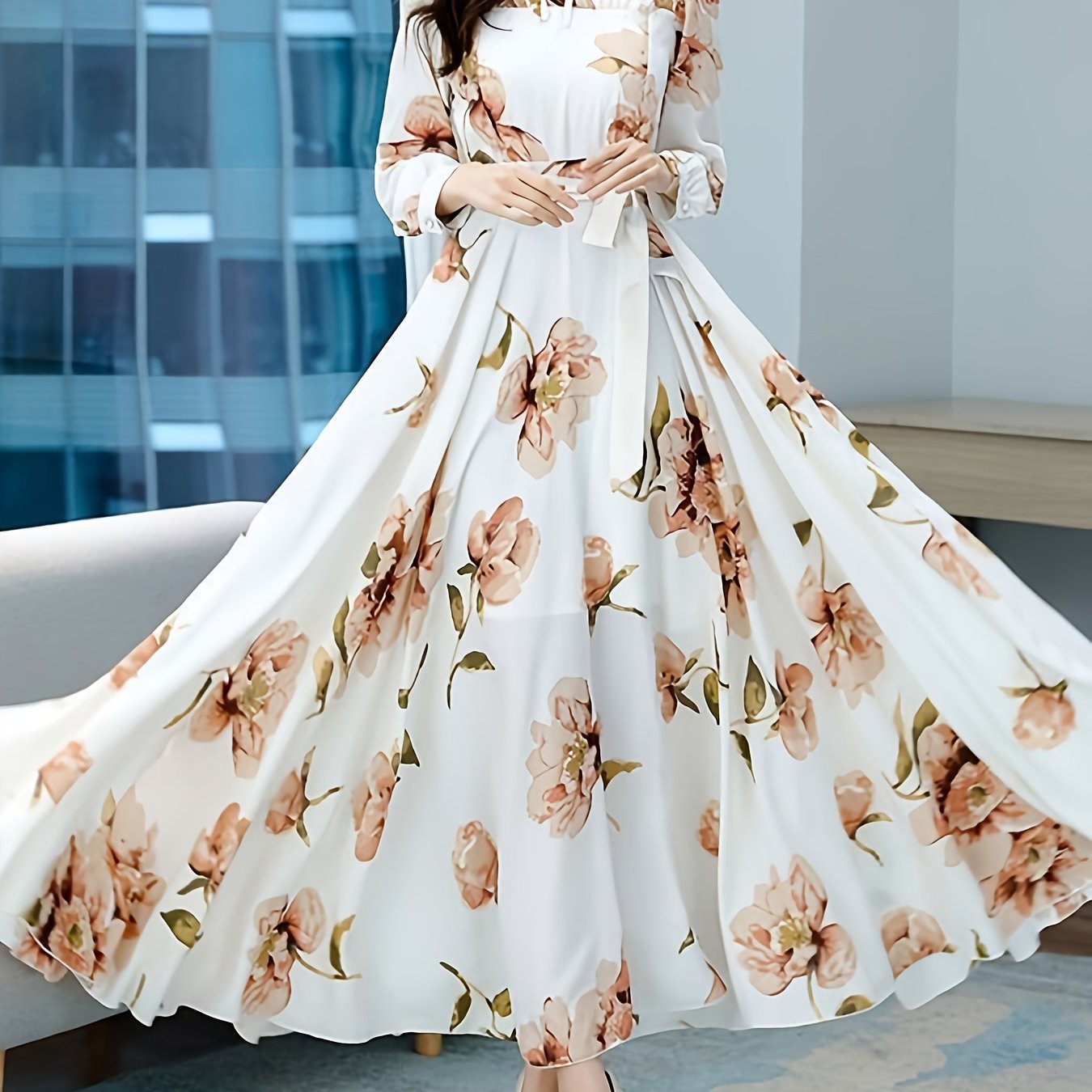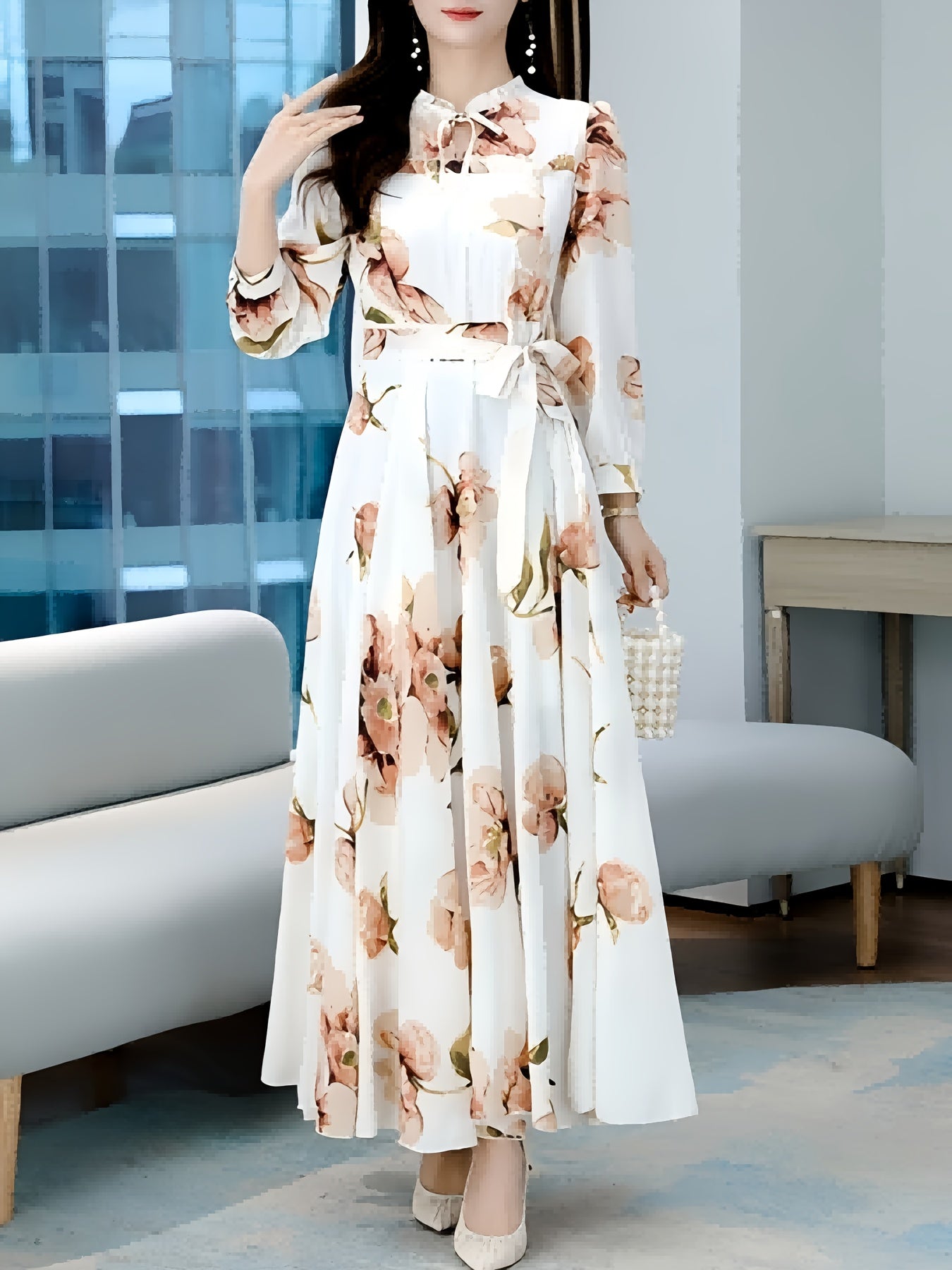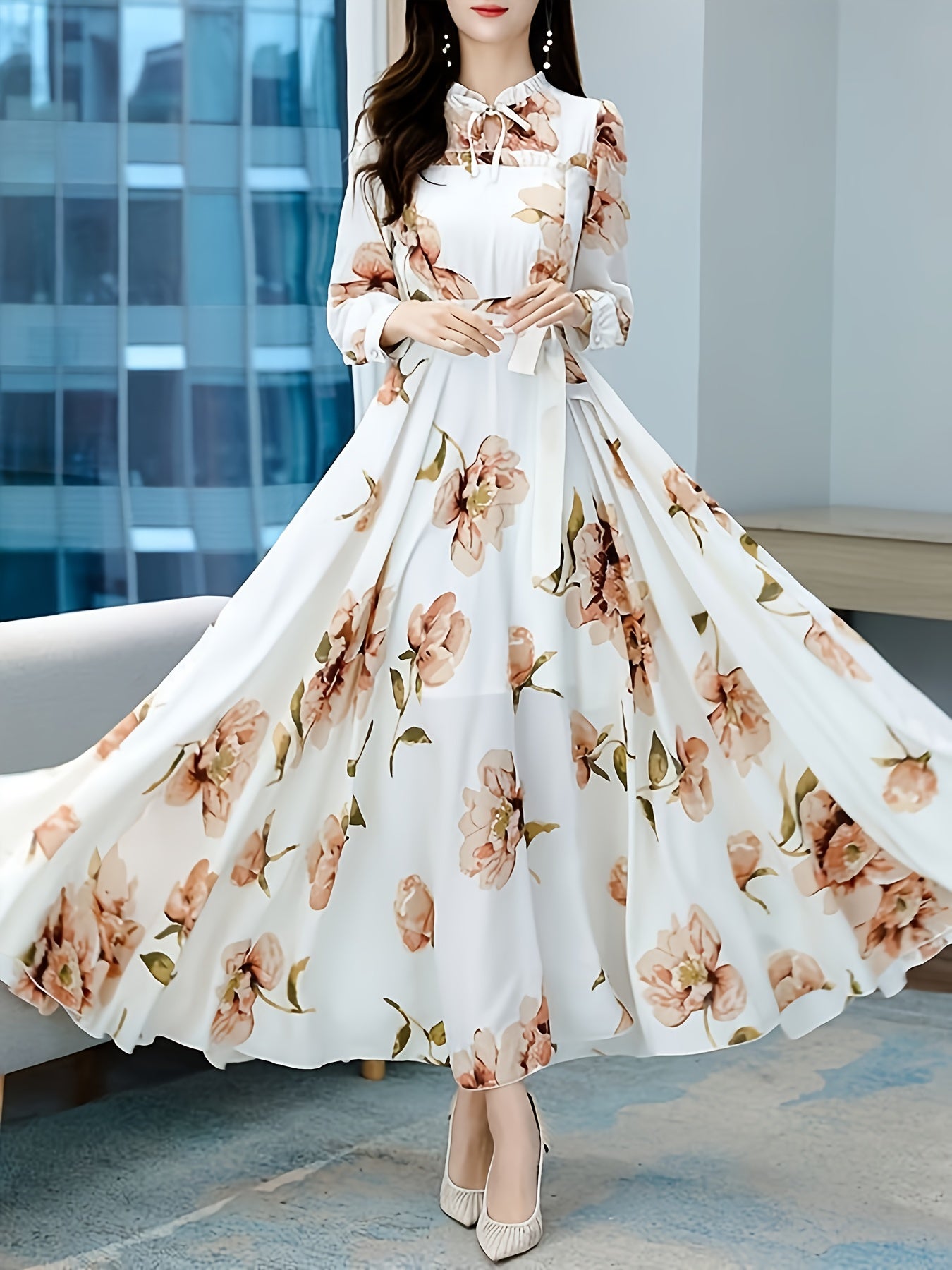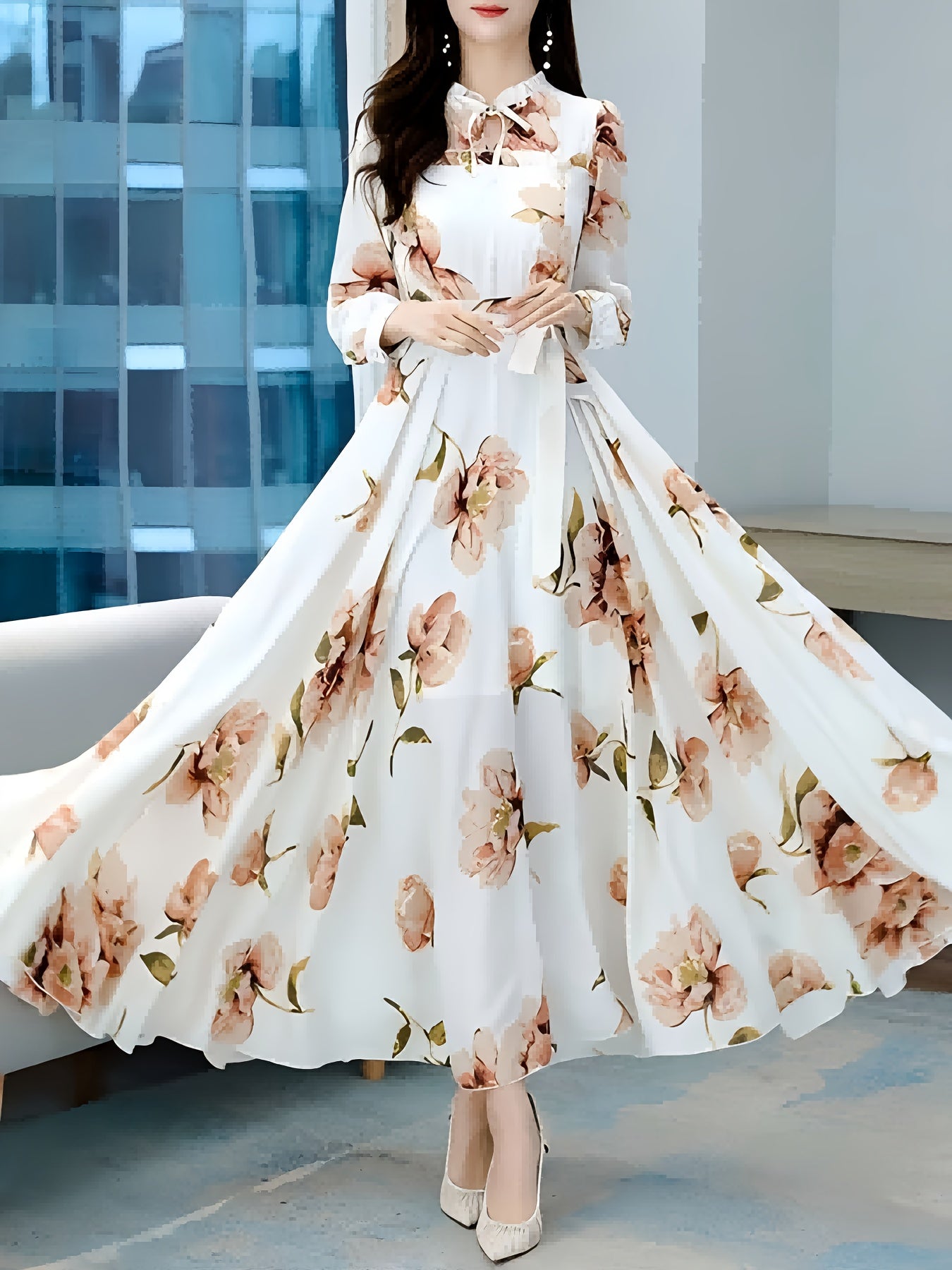 V-yuqori, pliseli bel va uzun oqayotgan yubka bilan bezatilgan zamonaviy gullar bilan A-siluetli ko'ylak, mashinada yuvish mumkin bo'lgan polyesterdan tayyorlangan.